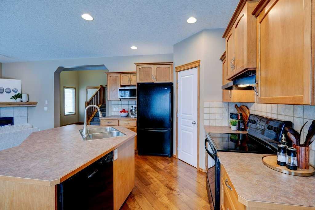 The open main floor offers excellent flow for everyday living and entertaining. The kitchen features maple cabinetry, a corner pantry, ample prep space, and a central island with breakfast bar, with large windows overlooking the backyard. A cozy corner gas fireplace anchors the living room, while main floor laundry, mudroom, and a powder room complete this level.