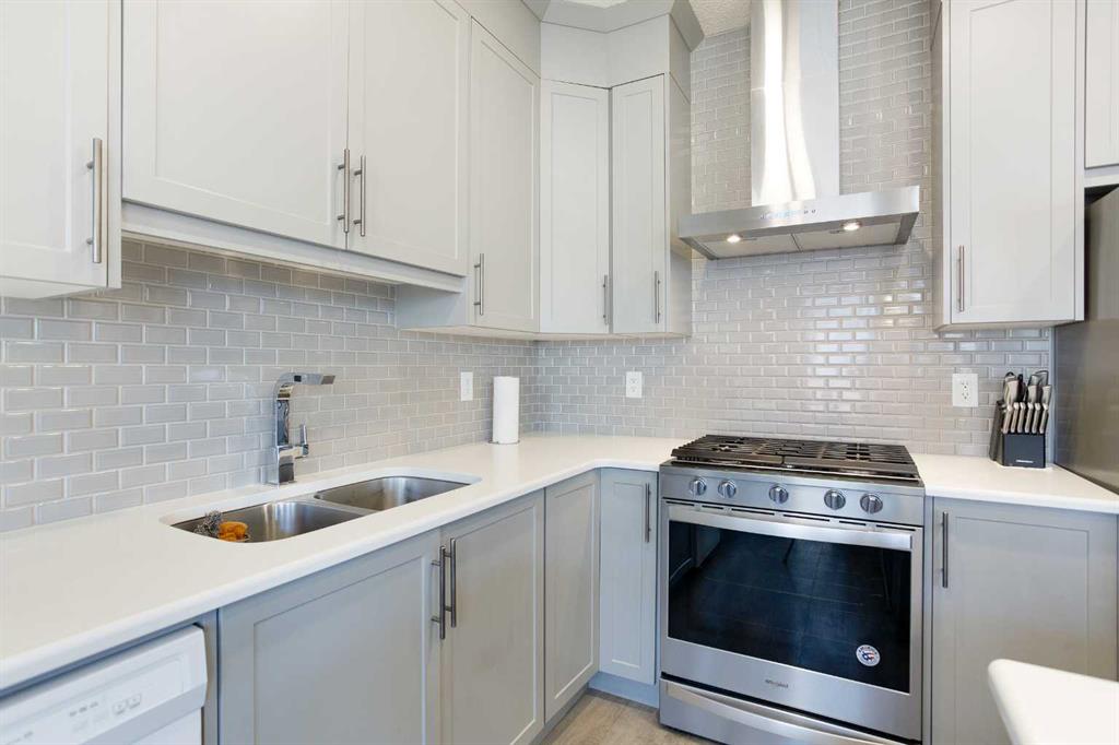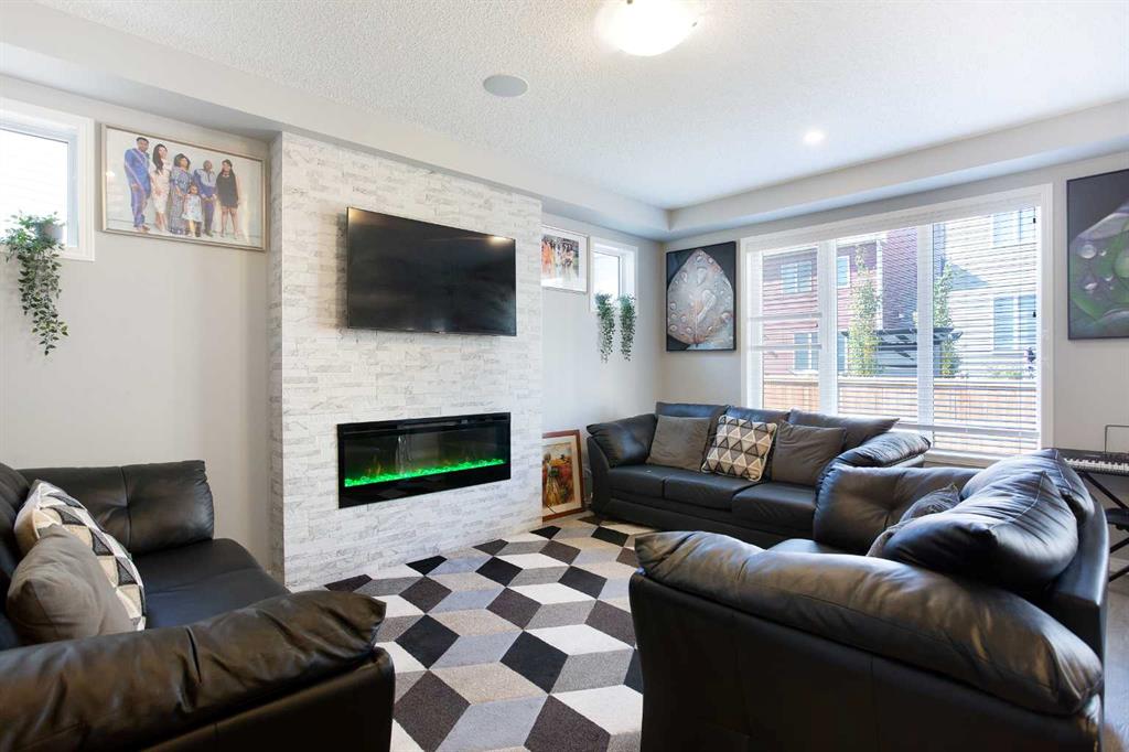 The primary suite includes a walk-in closet and a private ensuite, providing a comfortable retreat. The main level showcases a modern kitchen with ceiling-height cabinets, quartz countertops, stainless steel appliances, and a large island, opening to a bright living room with a custom fireplace feature wall.