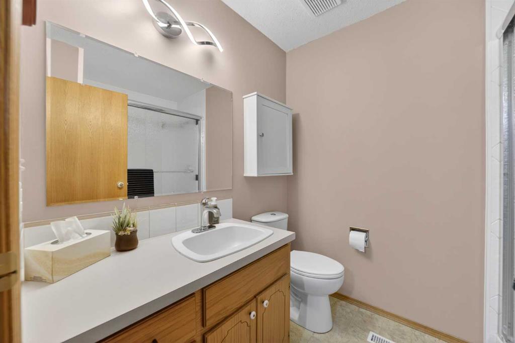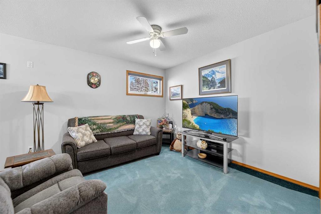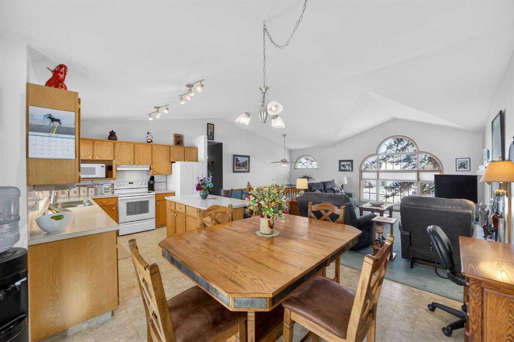 The main floor offers the open-concept layout everyone is looking for, featuring vaulted ceilings, a cozy wood-burning fireplace, and a large window that fills the living area with natural light. The well-appointed kitchen includes a generous island and dining area with garden doors leading to the covered deck. The primary bedroom features a walk-in closet and 4-piece ensuite, while the second main floor bedroom is spacious enough that it could potentially be converted into two smaller bedrooms if desired. A 3-piece main bathroom completes the main level.