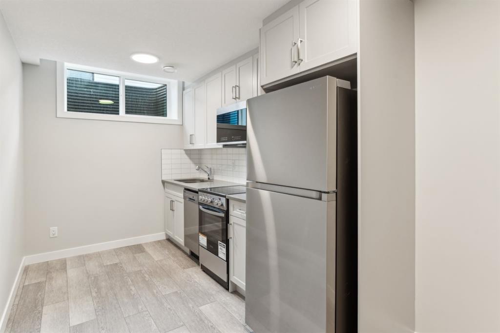to the central kitchen. The chef-inspired kitchen boasts quartz countertops, stainless steel appliances including a built-in microwave, and a large island—ideal for entertaining or everyday meals. Upstairs, the primary bedroom offers a walk-in closet and a private 4-piece ensuite, while two additional bedrooms, a full bathroom, and upper-level laundry (with washer and dryer) complete the upper floor. The secondary LEGAL SUITE is 578 SqFt and has a private side entrance with a concrete walkway, making it ideal for tenants or extended family. It features high ceilings, large windows, spacious kitchen and eating area, in-suite laundry, and its own cozy living space—bright, functional, and designed for comfort. Enjoy Calgary’s summers with a private, fenced yard featuring a spacious patio perfect for enjoying a morning coffee, entertaining with friends and family or just a place to relax. Designed to be low maintenance and turnkey. A 20’ x 21’ detached double-car garage completes the package, offering convenience and additional storage. Don’t miss your chance to own a home that’s as practical as it is beautiful—with income potential, modern finishes, and move-in ready condition, this property truly has it all. This complex is home to only 19 units (with NO HOA OR CONDO FEES) and is surrounded by green space, parks & playgrounds. Walking distance to schools, shopping and transportation this location is hard to beat. Call to book your private tour or come visit us during our Showhome hours.