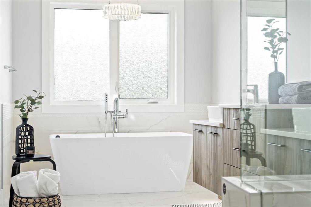 Upstairs, the layout is thoughtfully designed with four bedrooms, three bathrooms, a dedicated laundry room, and a spacious bonus room with tray ceiling. The primary suite offers a private retreat, featuring a tray ceiling, walk-in closet with MDF shelving, and a well-appointed ensuite with double vanity, soaker tub, and a fully tiled shower with bench and glass enclosure. Secondary bedrooms are generously sized, with convenient access to full bathrooms. Plush carpet throughout the bedrooms and upper-level living areas enhances comfort, while the laundry room with sink and base cabinetry adds practicality.