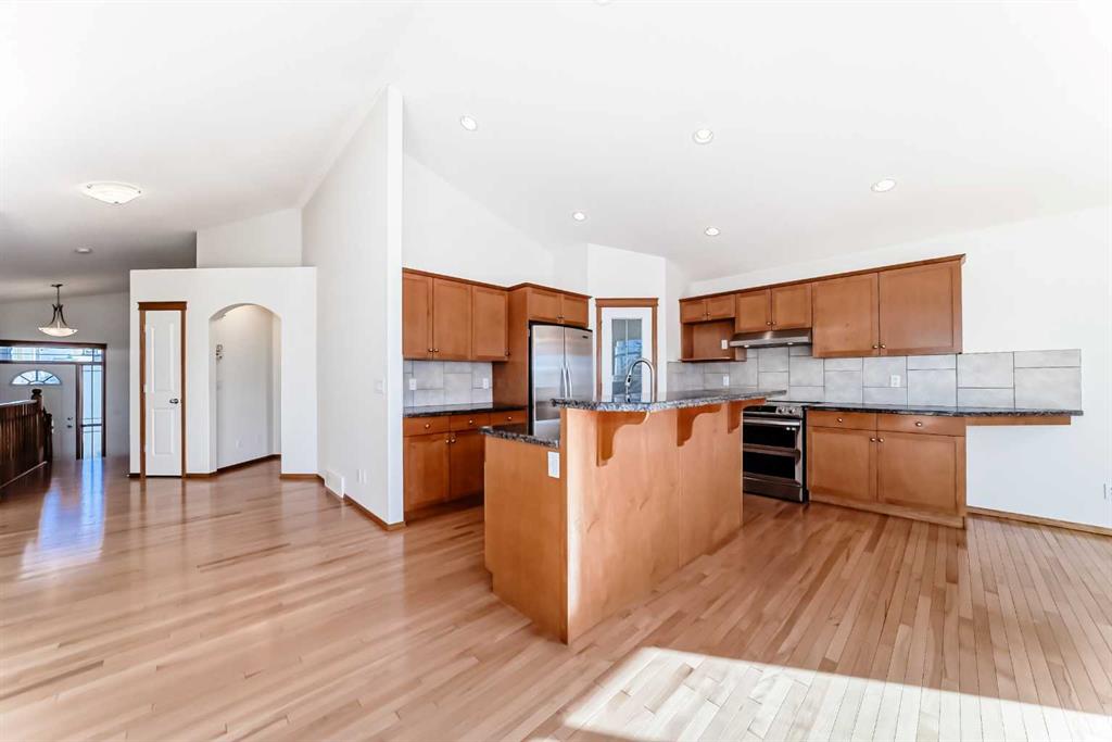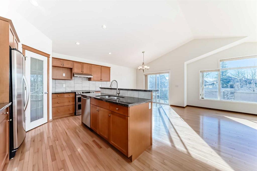 The open-concept design is both stylish and functional, centered around a chef-inspired kitchen featuring maple cabinetry, granite countertops, stainless steel appliances and a spacious center island with an eating bar—perfect for everyday living and entertaining. Adjacent to the kitchen, a sunlit breakfast nook opens onto a generous west facing deck and backyard, ideal for morning coffee, BBQs, and outdoor relaxation.