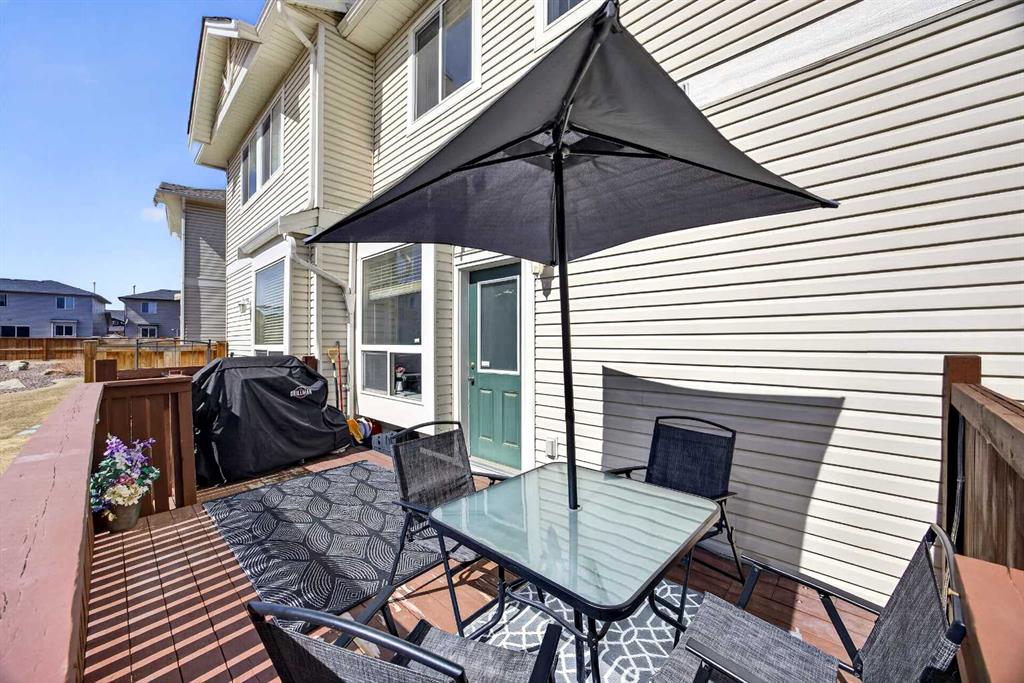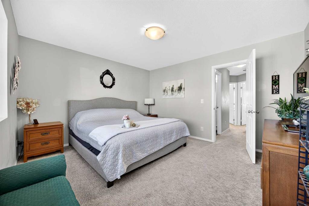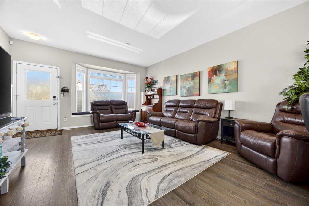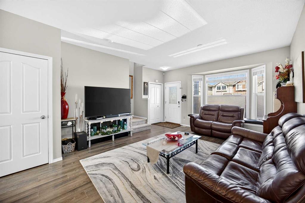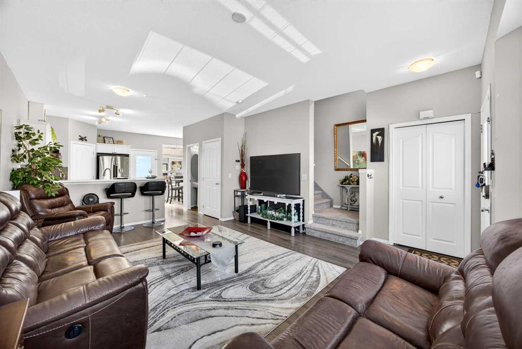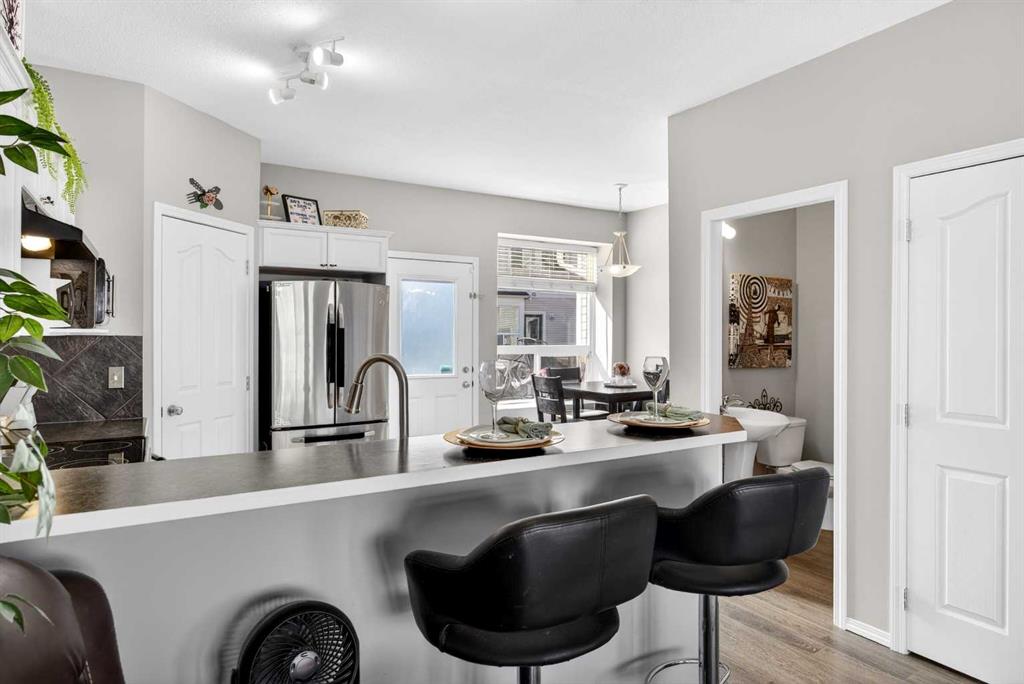 Start each day in a home that balances comfort, space and a peaceful setting backing directly onto a green belt in the heart of Luxstone. Thoughtful design and move-in ready condition come together to create a layout that supports both daily routines and relaxed living. Step inside to an open-concept main level where durable laminate flooring carries throughout while natural light moves easily from front to back. Gather in the living area where a charming bay window with built-in bench seating creates a cozy spot for reading or unwinding at the end of the day. Continue into the kitchen where stainless-steel appliances, a pantry for added storage and a peninsula island with breakfast bar seating keep everything within reach for both quick meals and casual conversation. Share meals in the adjacent dining space that connects seamlessly to the outdoors, making it easy to transition from indoor dinners to summer evenings on the deck. Head upstairs to a well-balanced upper level that includes 3 bedrooms, including a spacious primary retreat with a walk-in closet designed to keep everything organized and accessible. Two additional bedrooms and a 4-piece bathroom complete this level, offering flexibility for family, guests or a home office. Make your way downstairs to a fully finished basement where a large recreation area sets the stage for movie nights, games or quiet downtime. A 4th bedroom and 3-piece bathroom add versatility for visitors or extended family living. Step outside to a sunny south-facing backyard where an expansive deck invites barbeques, outdoor dining and time spent enjoying the open green space beyond. The greenbelt creates a sense of privacy while still maintaining connection to the surrounding community. Enjoy the convenience of 2 assigned parking stalls directly outside the home along with nearby visitor parking for guests. Located in the established community of Luxstone, this home places schools, shopping, dining, pathways and everyday amenities within easy reach while offering quick access to Calgary, CrossIron Mills, Costco and the airport for effortless commuting.