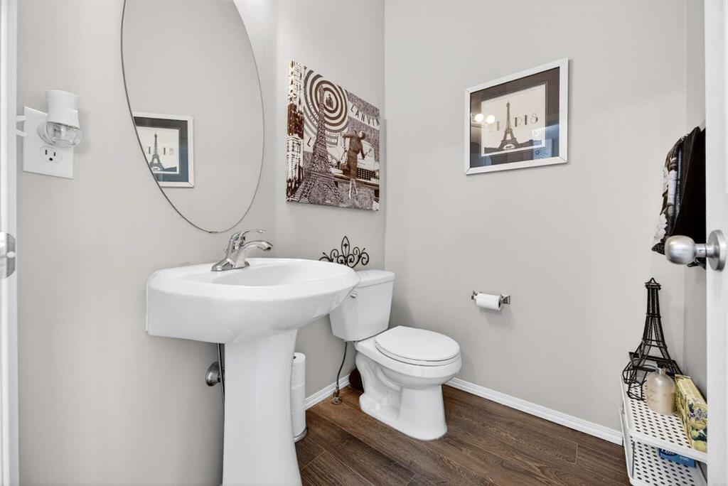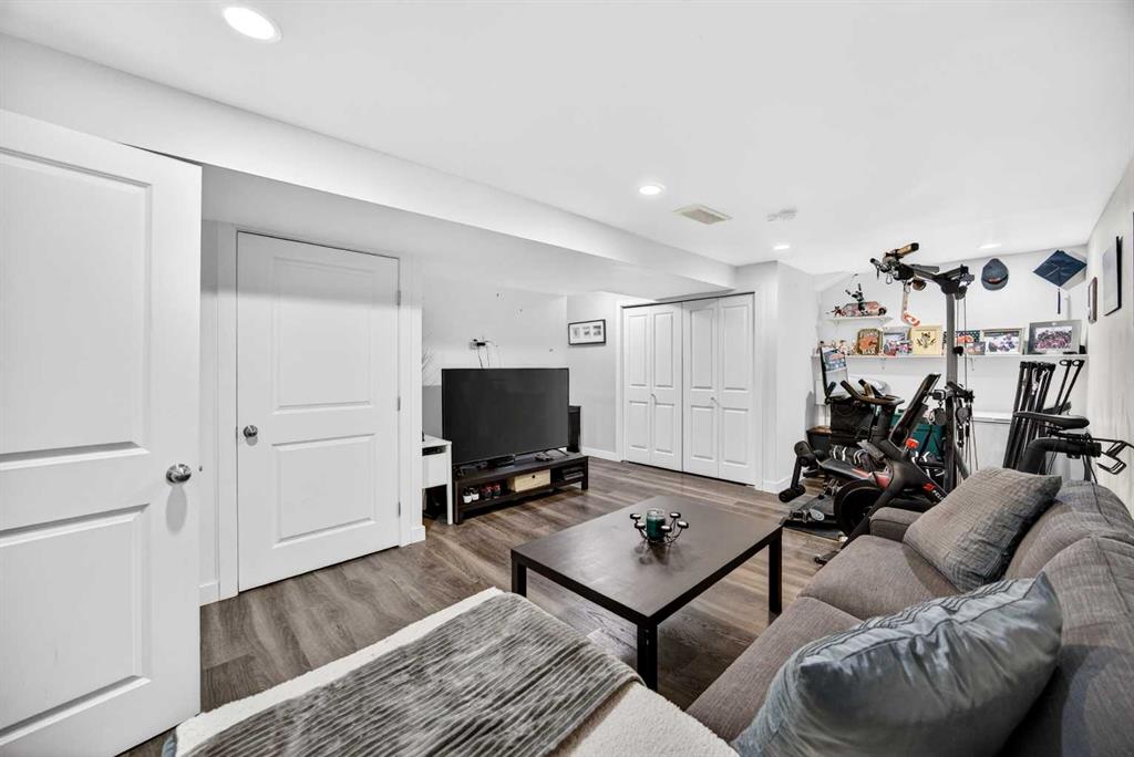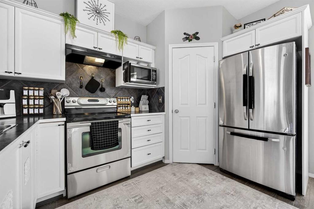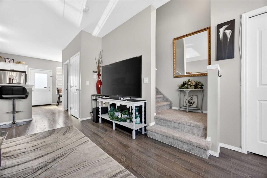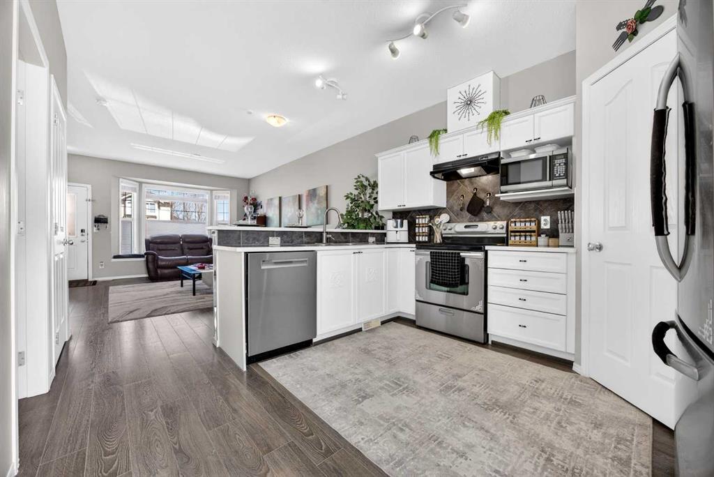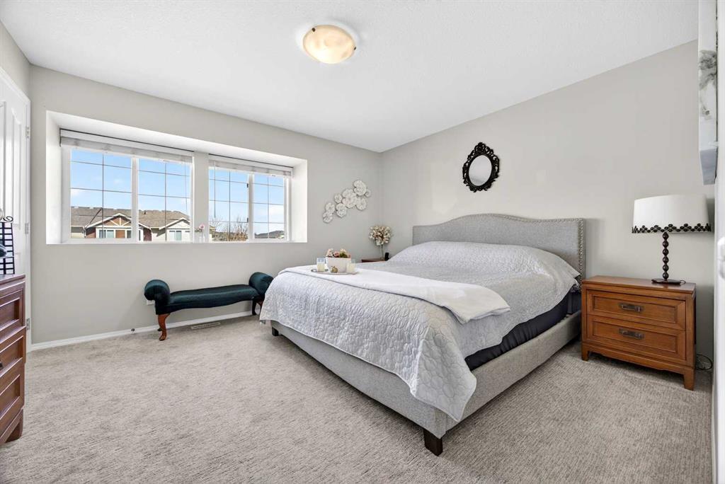 Start each day in a home that balances comfort, space and a peaceful setting backing directly onto a green belt in the heart of Luxstone. Thoughtful design and move-in ready condition come together to create a layout that supports both daily routines and relaxed living. Step inside to an open-concept main level where durable laminate flooring carries throughout while natural light moves easily from front to back. Gather in the living area where a charming bay window with built-in bench seating creates a cozy spot for reading or unwinding at the end of the day. Continue into the kitchen where stainless-steel appliances, a pantry for added storage and a peninsula island with breakfast bar seating keep everything within reach for both quick meals and casual conversation. Share meals in the adjacent dining space that connects seamlessly to the outdoors, making it easy to transition from indoor dinners to summer evenings on the deck. Head upstairs to a well-balanced upper level that includes 3 bedrooms, including a spacious primary retreat with a walk-in closet designed to keep everything organized and accessible. Two additional bedrooms and a 4-piece bathroom complete this level, offering flexibility for family, guests or a home office. Make your way downstairs to a fully finished basement where a large recreation area sets the stage for movie nights, games or quiet downtime. A 4th bedroom and 3-piece bathroom add versatility for visitors or extended family living. Step outside to a sunny south-facing backyard where an expansive deck invites barbeques, outdoor dining and time spent enjoying the open green space beyond. The greenbelt creates a sense of privacy while still maintaining connection to the surrounding community. Enjoy the convenience of 2 assigned parking stalls directly outside the home along with nearby visitor parking for guests. Located in the established community of Luxstone, this home places schools, shopping, dining, pathways and everyday amenities within easy reach while offering quick access to Calgary, CrossIron Mills, Costco and the airport for effortless commuting.
