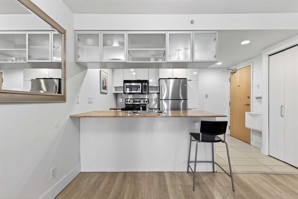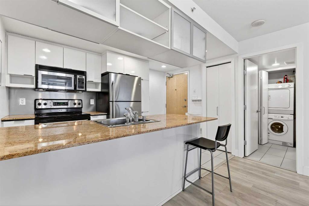 Welcome to elevated urban sophistication on the 16th floor of the prestigious Stella complex, located at 1110 11 St SW. This stunning 1-bedroom, 1-bathroom residence offers the pinnacle of downtown living, blending high-altitude tranquility with the vibrant energy of Calgary’s Beltline. Perched high above the city, Unit 1609 immediately impresses with an abundance of natural light cascading through expansive floor-to-ceiling windows that frame breathtaking panoramic views of the skyline. The open-concept layout is masterfully designed to create a seamless flow between the living and dining areas. The efficient galley-style kitchen features warm wood cabinetry, sleek granite countertops, a premium stainless steel appliance package, and a functional island/breakfast bar that serves as a perfect transition for casual dining or entertaining. The living and dining space allows for versatile furniture arrangements, while the private balcony provides a quiet outdoor sanctuary to enjoy the city vistas. The primary bedroom is a true retreat, generously proportioned and featuring a covered walk-in closet that provides exceptional organization and storage. For maximum convenience, the unit includes a discreetly placed in-suite stacked laundry center. Living at Stella means enjoying a lifestyle defined by executive-class amenities and security. Residents benefit from a 24-hour concierge and on-site security service, ensuring a safe and welcoming environment at all times. The building’s fitness facilities are second to none, featuring a state-of-the-art gym and steam rooms, while the designer’s entertainment room and lushly landscaped private courtyard provide ideal spaces for socializing. This unit comes complete with a secure underground heated parking stall and a private assigned storage locker. The location is truly unbeatable, offering a world-class walk score just steps from the Kirby CTrain Station, boutique shopping, and the trendy restaurants and cafes of 17th Avenue. Whether you are a professional seeking a sophisticated home close to the office or an investor looking for a premium property in a high-demand concrete tower, this 16th-floor gem represents an extraordinary opportunity. From the floor-to-ceiling glass to the high-end finishes and the comprehensive building amenities, every detail of this home has been curated for comfort and style. Experience the best of the Beltline and make this sky-high sanctuary in your new urban home. Schedule your private viewing today to fully appreciate the views, the quality, and the lifestyle that only a high-floor unit at Stella can provide.