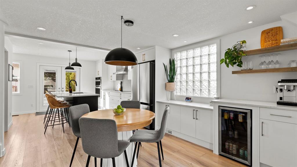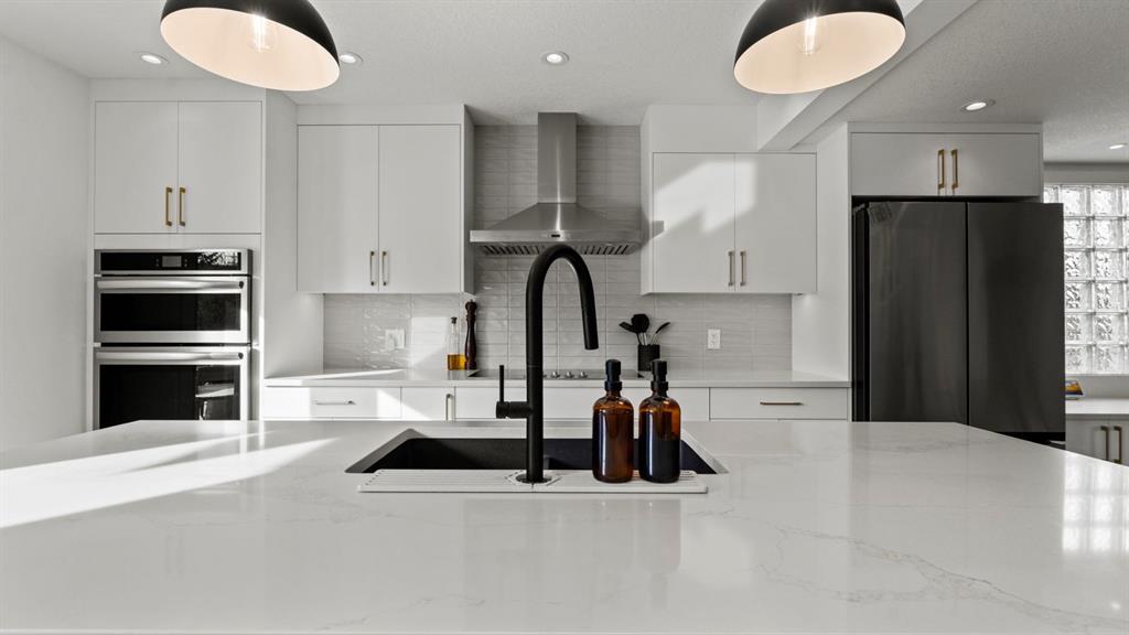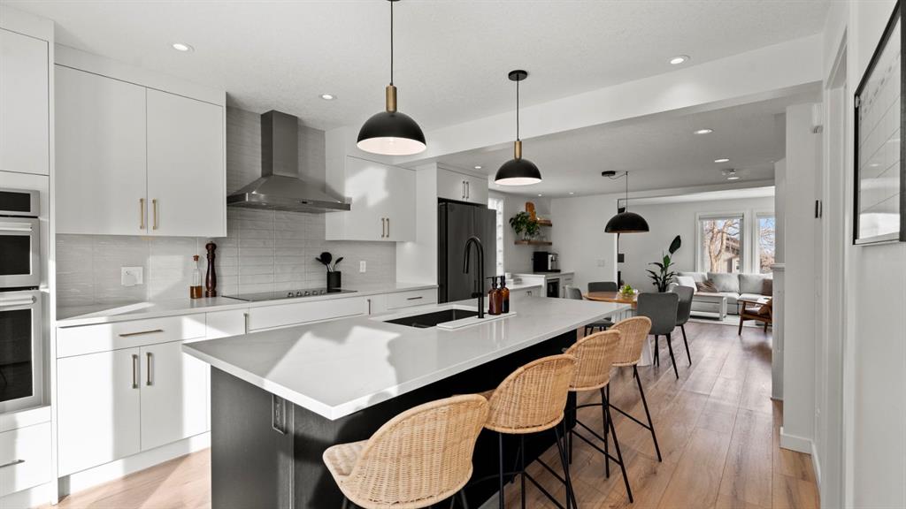 The main floor has been fully renovated and showcases a bright, modern open-concept layout ideal for both everyday living and entertaining. Wide-plank flooring, recessed lighting, and large windows create a warm and welcoming atmosphere throughout. The living room flows seamlessly into the stunning kitchen, where crisp white cabinetry, quartz countertops, contrasting dark accents, and a large centre island with seating take centre stage. High-end stainless steel appliances include a gas cooktop, built-in wall ovens, and a statement range hood, while stylish pendant lighting and a sleek tile backsplash complete the space. The adjacent dining area offers direct access to the west-facing backyard, perfect for enjoying afternoon sun and evening sunsets. A convenient powder room completes the main level.