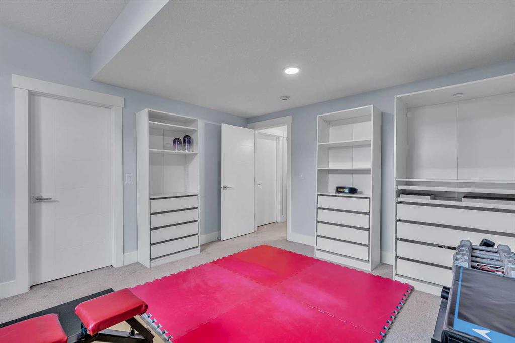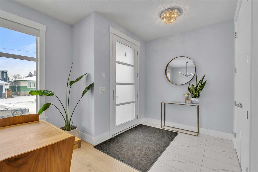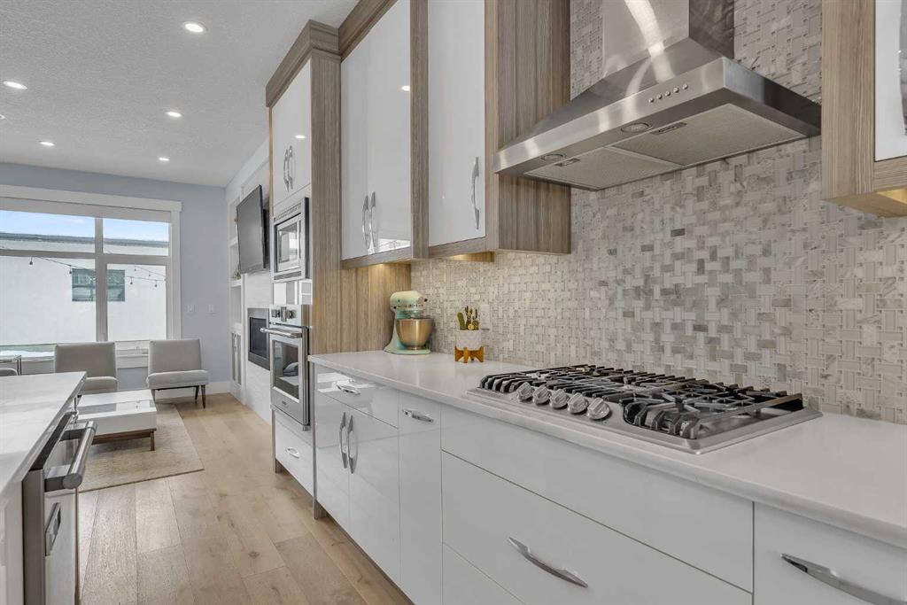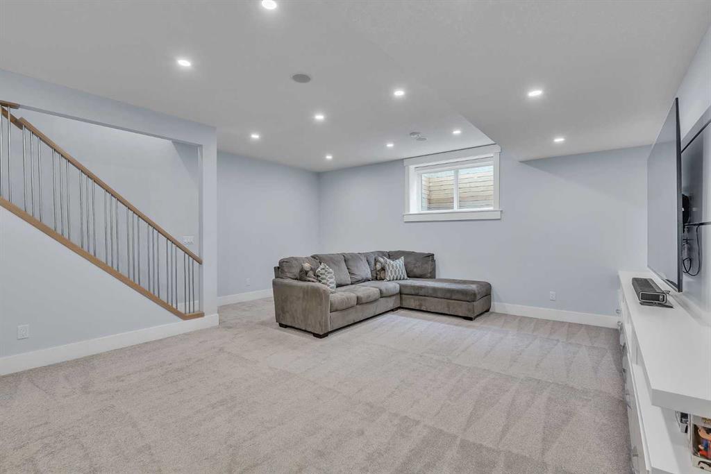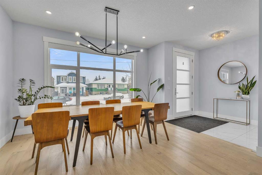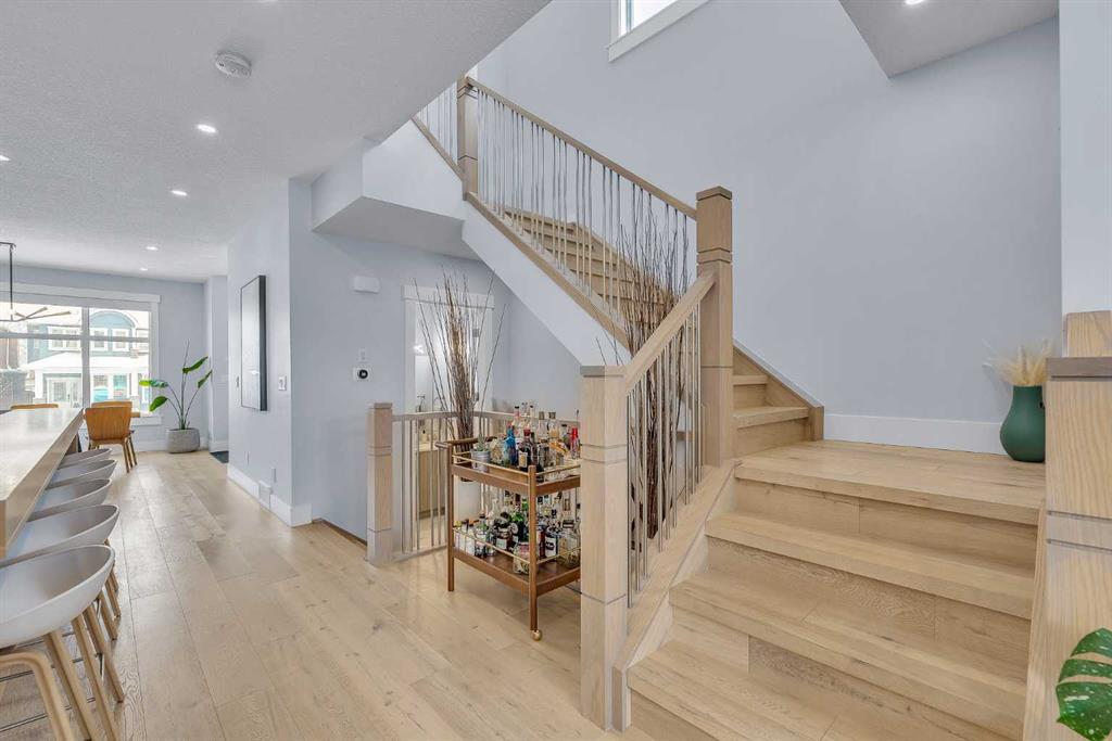 Upon entry, you’re welcomed by a spacious front formal dining area and distinctive hardwood flooring that flows throughout both the main and upper levels. The thoughtfully designed main floor showcases a striking hardwood staircase and a chef-inspired kitchen centered around an oversized quartz island with raised eating bar. The kitchen is further elevated by an extra-large, professional-grade fridge and freezer combination, offering exceptional storage and functionality for entertaining and everyday living. Additional main-floor features include ceiling speakers, a functional mudroom, a sleek modern linear fireplace with custom built-ins, and a convenient half bath.