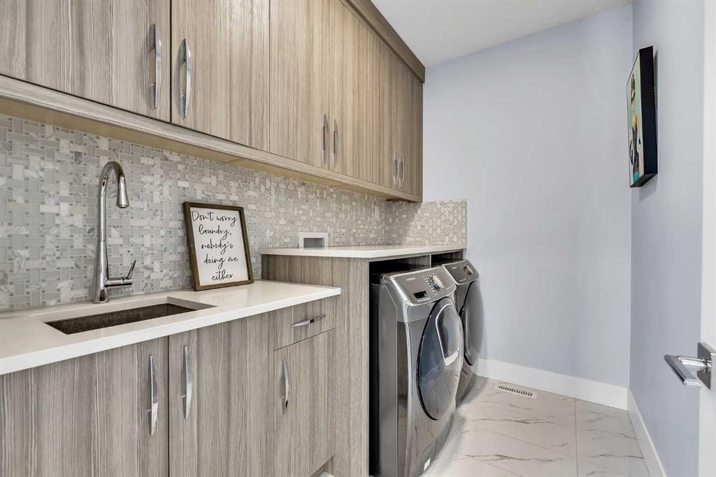 The upper level offers 9’ ceilings throughout, anchored by a luxurious primary retreat with vaulted ceilings, a beautifully appointed ensuite featuring heated floors, and a walk-in closet. Two generously sized secondary bedrooms, a full bathroom, and an upper laundry room with ample cabinetry, counter space, and a utility sink complete this level.