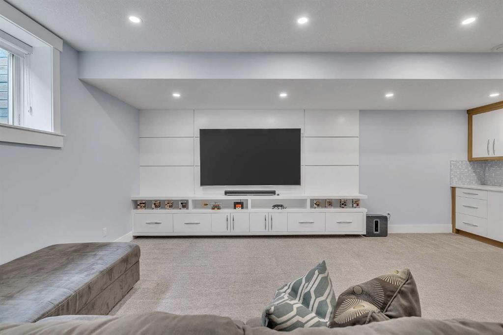 The fully developed basement is ideal for entertaining, featuring a large media room with custom built-ins, a wet bar, a fourth bedroom, and a full bathroom, along with hydronic heated floors.