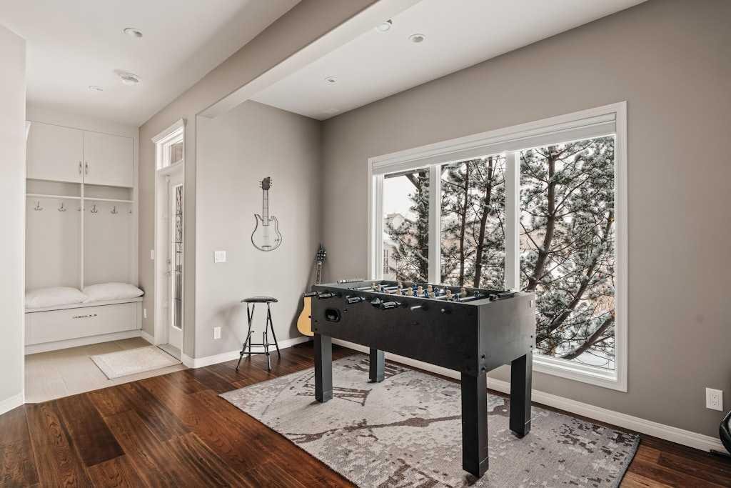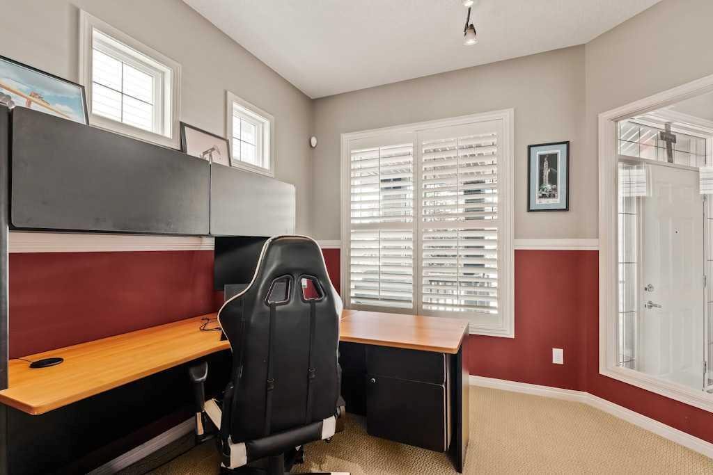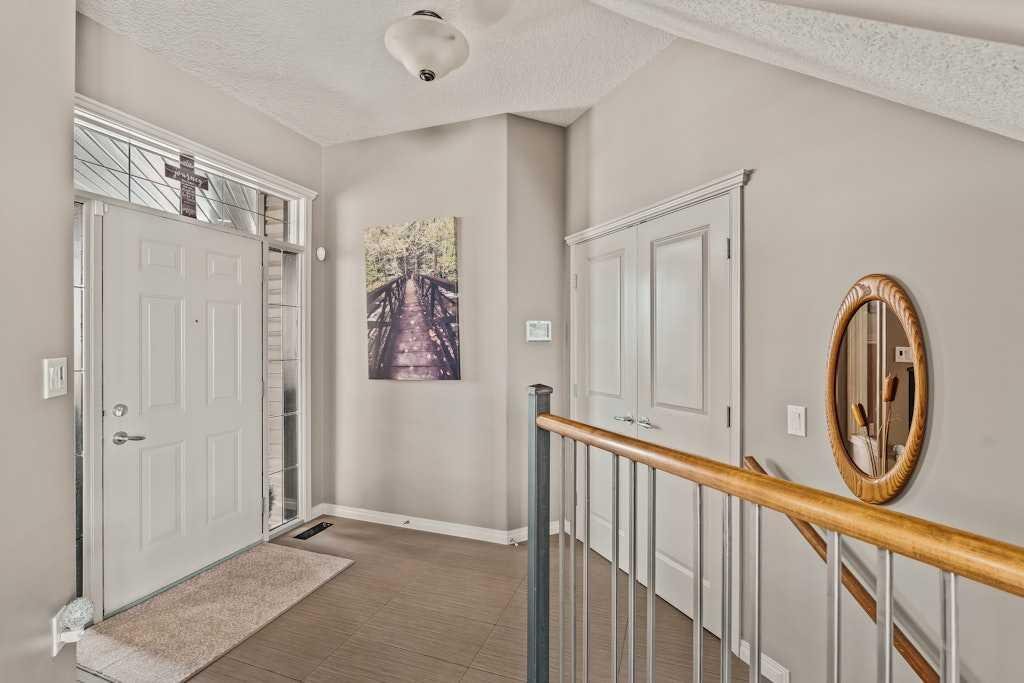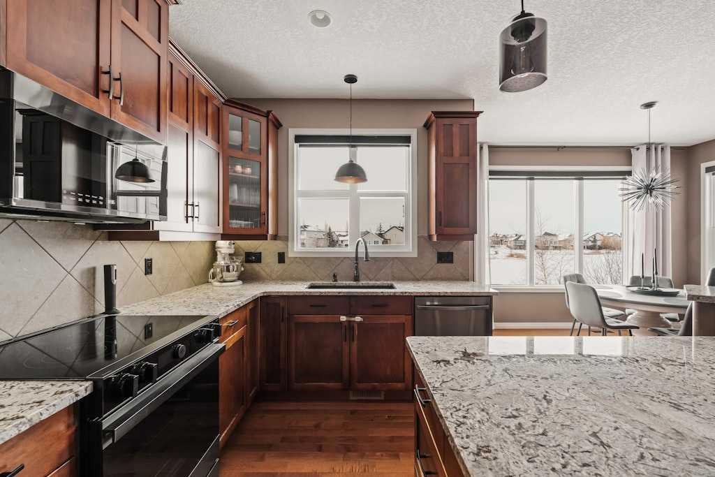 Set on a quiet cul-de-sac and backing onto the walking path surrounding an 8-acre pond, this beautifully appointed two-storey home offers an exceptional setting with peaceful views and a thoughtful layout designed for everyday functionality. The main floor welcomes you with 9′ ceilings, rich hardwood flooring, and a bright open-concept design. At the heart of the home, the kitchen is both stylish and functional, featuring warm cinnamon stained maple cabinetry, granite countertops, black and black stainless steel appliances, a walk-through pantry, and a large island with breakfast bar seating. From there, the space flows effortlessly into the dining area, surrounded by windows and perfectly positioned to take in the views, before opening into the inviting living room where a cozy fireplace adds warmth and a cozy ambiance. Step out from the dining space onto the expansive upper deck, an ideal place to relax, entertain, or simply enjoy the tranquil backdrop. A private office, 2-piece powder room, and laundry room complete the main floor. Upstairs, a spacious family room provides the perfect place to unwind, while a full bathroom and three well-sized bedrooms offer excellent space for family or guests. The primary suite is a true retreat, complete with a large walk-in closet and a beautifully appointed 5-piece ensuite featuring double sinks, a deep soaker tub, and a separate shower. The professionally developed walkout basement extends the home’s living space with an expansive rec room, with space for a home theatre area, wet bar, fourth bedroom, full stylish bath with multi-head shower and in-floor heating, and plenty of storage. From here, step directly outside to the lower deck and beautifully landscaped lush west facing backyard beyond where mature trees, a tiered garden, and a shed create a private and inviting outdoor setting, all backing onto the pathway that winds around the pond. Additional highlights include gemstone lighting at the front and back of the home, a smart underground sprinkler system with Wi-Fi and Bluetooth capability, a fully paid-for solar panel system, and an oversized double attached garage. Surrounded by pathways, ponds, nearby schools, parks, and everyday shopping and services, this is a home that offers both a peaceful setting and exceptional convenience within one of Chestermere’s most established family communities.