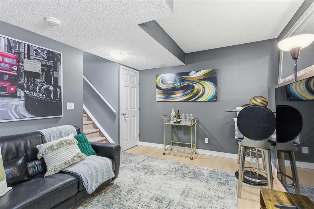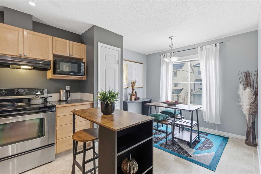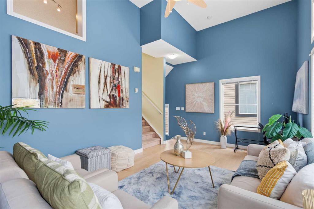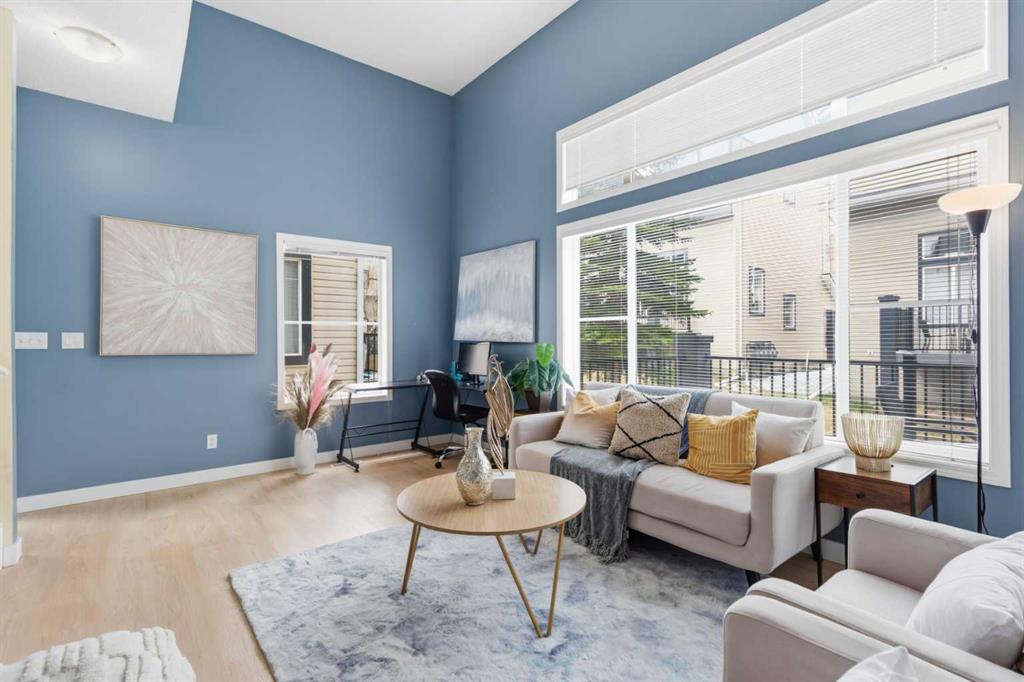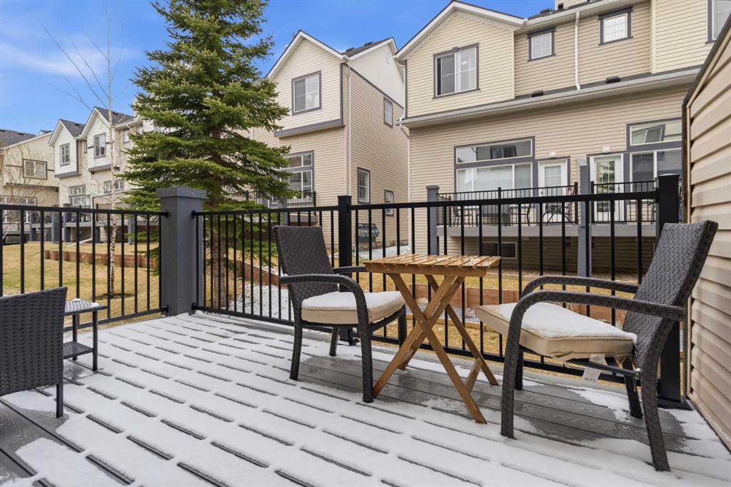 Beautiful sunny end-unit townhome located steps from Fish Creek Park. This low-maintenance townhouse backs onto a green space and features a private deck. The oversized living room offers 14-ft ceilings and tall windows for excellent natural light. Spacious kitchen with maple cabinets, upgraded laminate flooring, black appliances, and a bright breakfast nook.