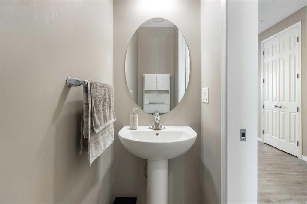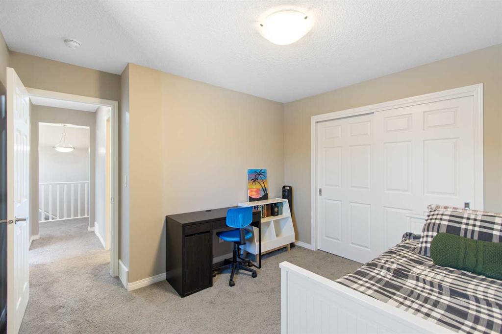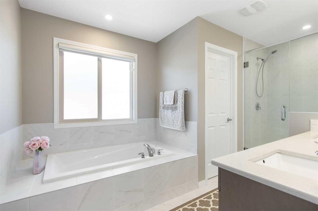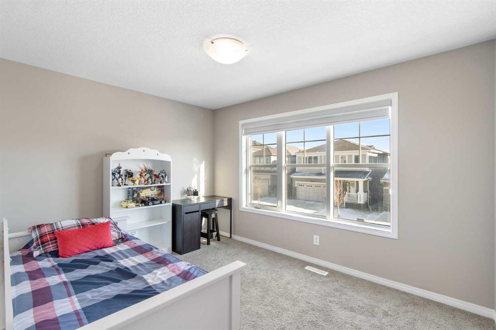 Welcome to this beautifully appointed detached home in the quiet and peaceful community of Carrington, offering over 2,600 sq ft of developed living space and quick access to Stoney Trail for an easy commute. The main level features 9’ ceilings and an open-concept layout filled with natural light. The spacious living room is anchored by a gas fireplace, while the gourmet kitchen showcases quartz countertops, a large central island, and ample cabinetry — perfect for everyday living and entertaining. The dining area opens to a west-facing backyard, ideal for enjoying evening sun. Upstairs offers three generously sized bedrooms, including a spacious primary retreat with a large walk-in closet and a luxurious 5-piece ensuite. A 5-piece main bathroom completes the upper level, providing excellent functionality for families. The fully finished basement adds valuable living space with a versatile recreation area, kitchenette, and a 3-piece bathroom, perfect for guests, a home gym, or media room. Enjoy being just minutes from a beautiful nearby pond, public transit, parks, and pathways, with a bus stop only minutes away. The double attached garage, peaceful surroundings, and convenient access to major routes make this home an outstanding opportunity in Northwest Calgary.