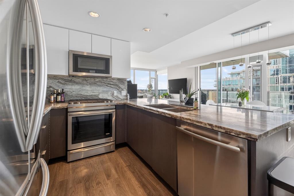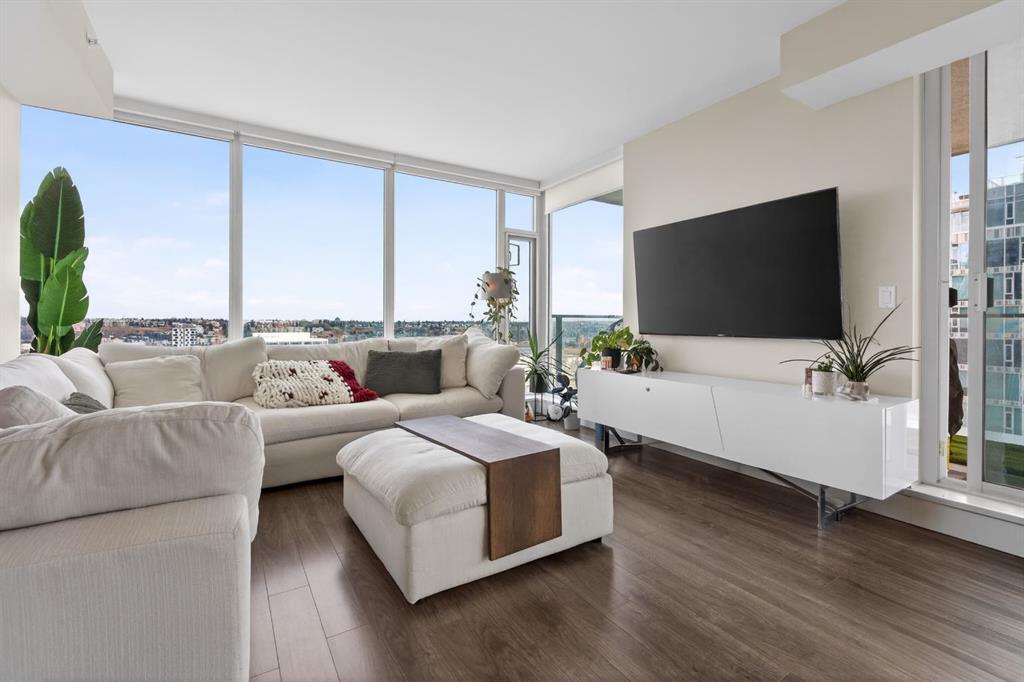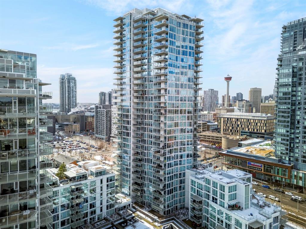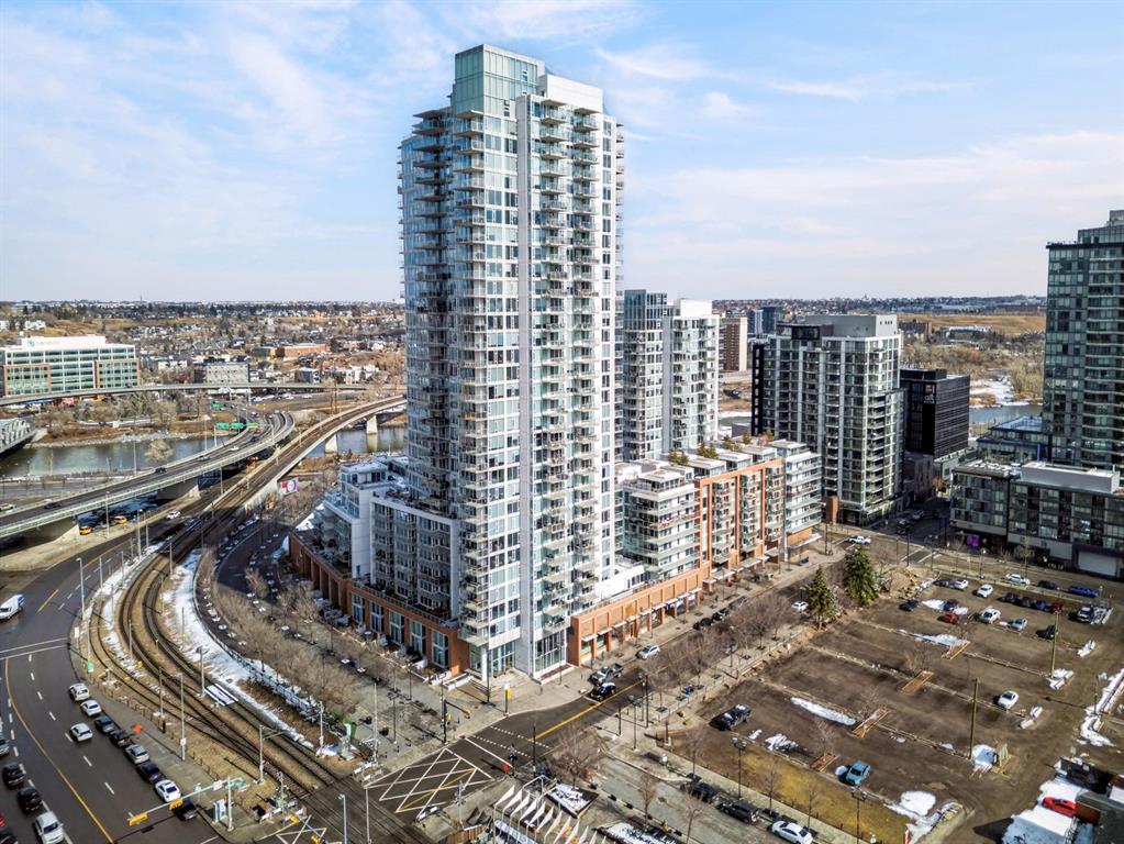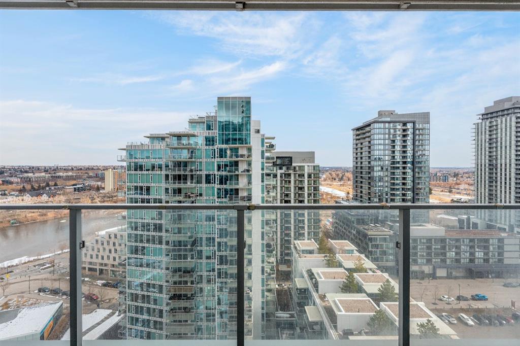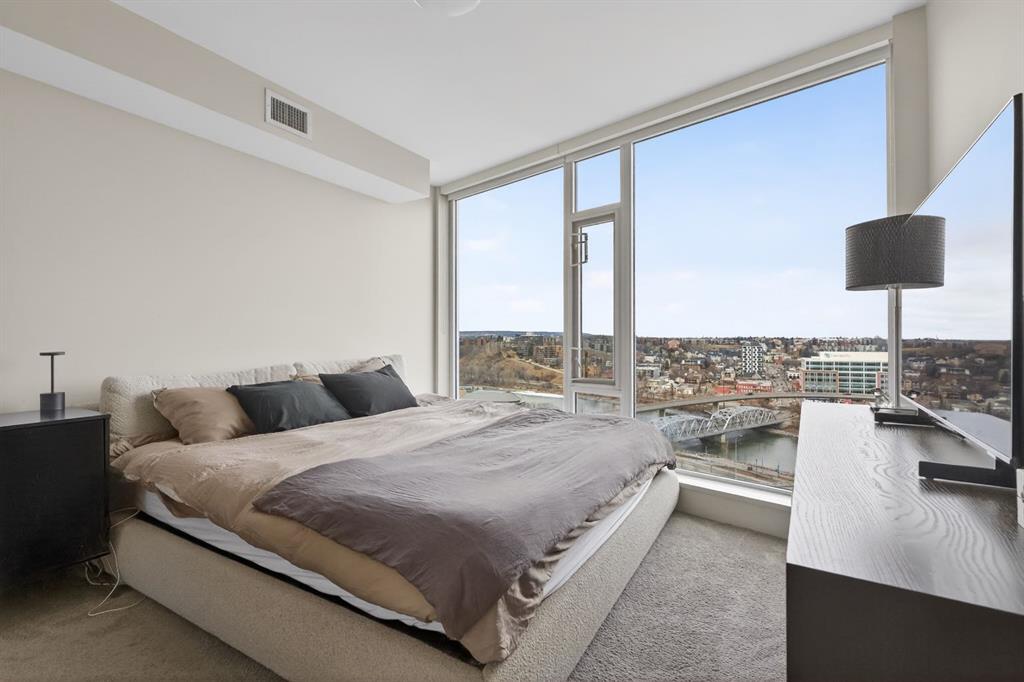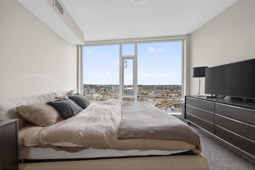 Perched on the 17th floor, this executive residence offers breathtaking views overlooking the Bow River and the vibrant city skyline. Designed with both comfort and style in mind, this spacious 2-bedroom, 2-bathroom suite features soaring ceilings, expansive floor-to-ceiling windows, rich hardwood and tile flooring, and plush carpeting in the primary bedroom. The open-concept layout seamlessly connects the kitchen, dining, and living areas—perfect for hosting guests or enjoying everyday living. The chef-inspired kitchen is equipped with a gas range, stainless steel appliances, granite countertops, and a sleek modern backsplash, delivering both functionality and sophistication. Retreat to the luxurious primary suite, complete with a spa-like 5-piece ensuite showcasing dual vanities, a deep soaker tub, and a fully tiled glass shower. Step outside to your oversized, nearly 20-foot-wide balcony—an ideal space for summer evenings, complete with room for lounging and BBQing while soaking in the incredible river views. Residents enjoy access to exceptional amenities, including a stunning rooftop courtyard, two fully equipped fitness centers, a sauna, and an expansive party room. With 24-hour concierge and security, peace of mind comes standard. This unit also includes a titled parking stall, a secure storage locker, and access to convenient visitor parking. Located in the heart of East Village, you’re just steps from river pathways, dining, shopping, and everything downtown living has to offer.