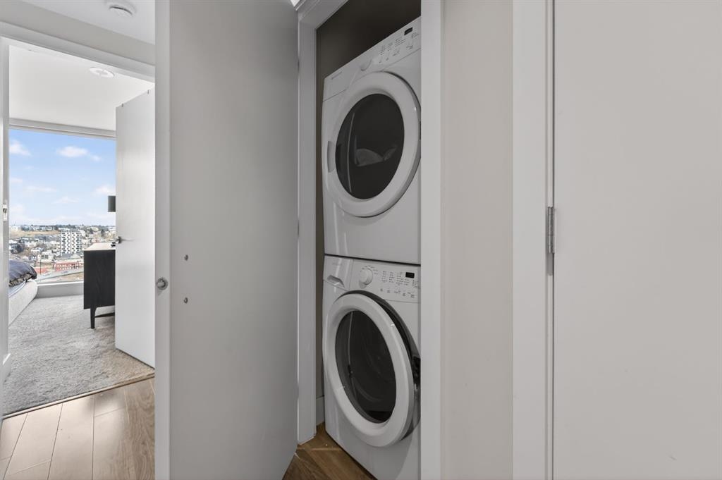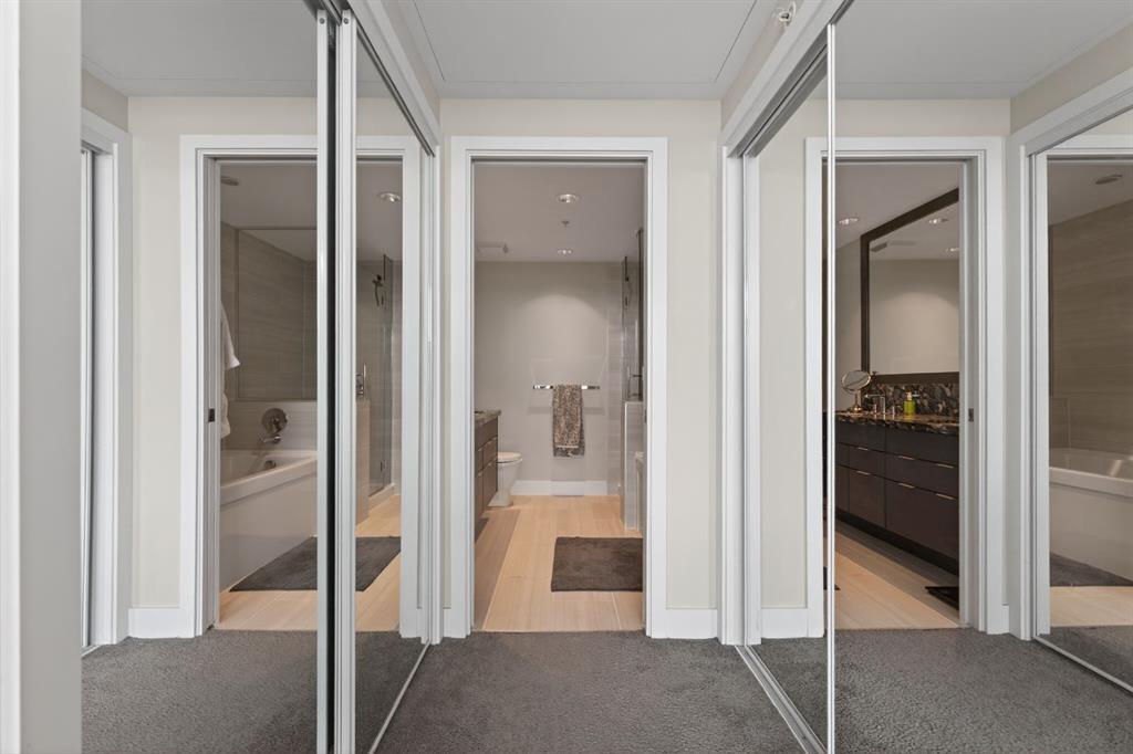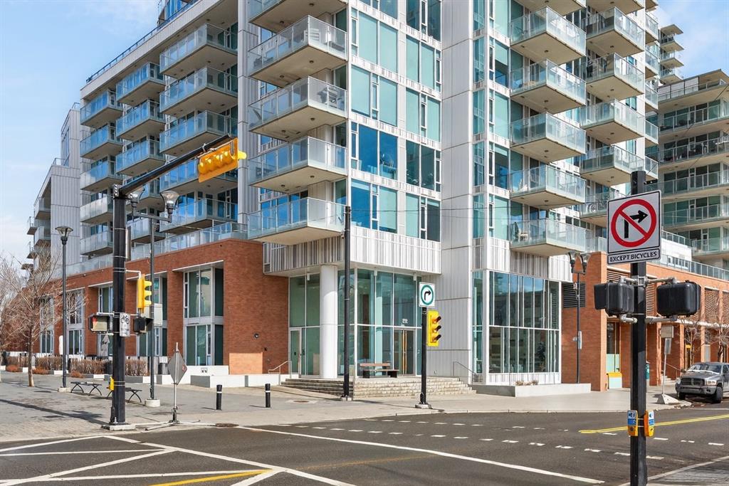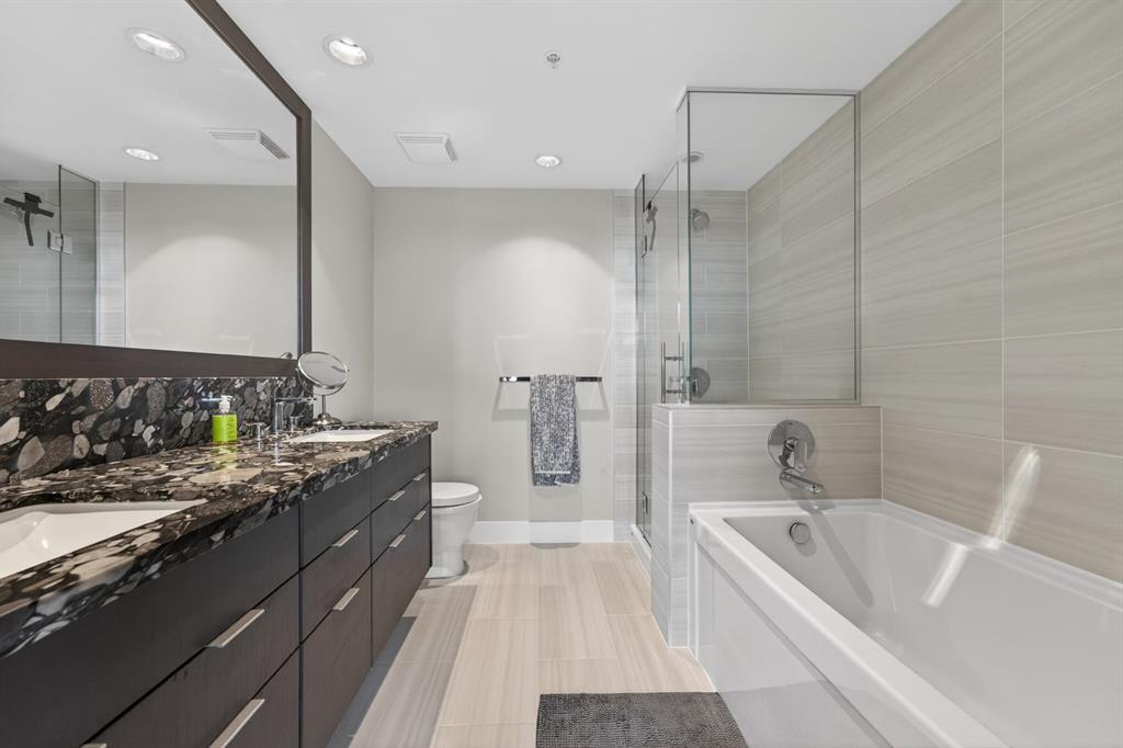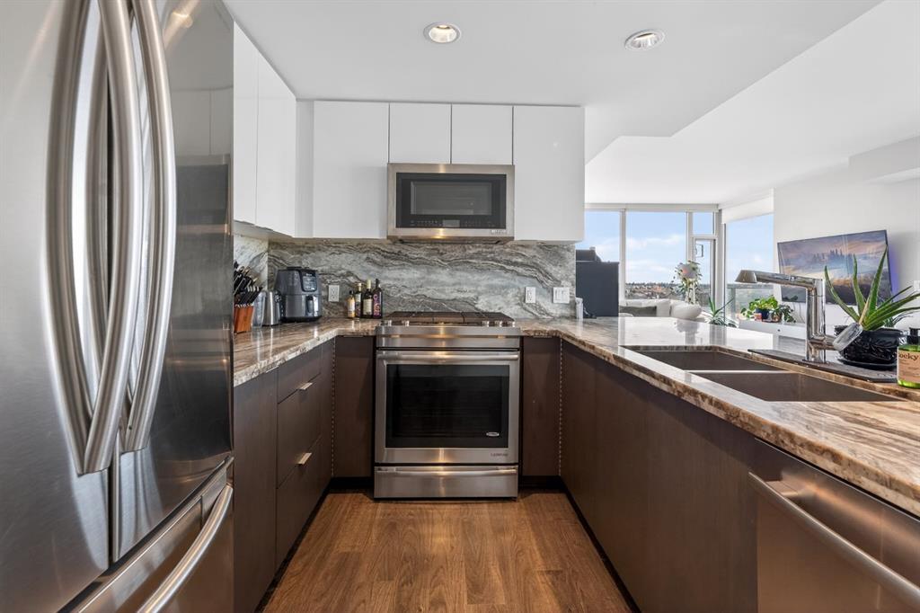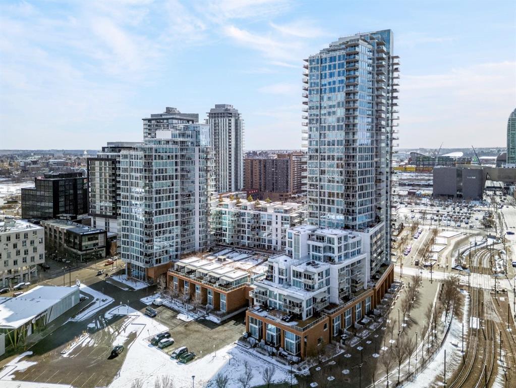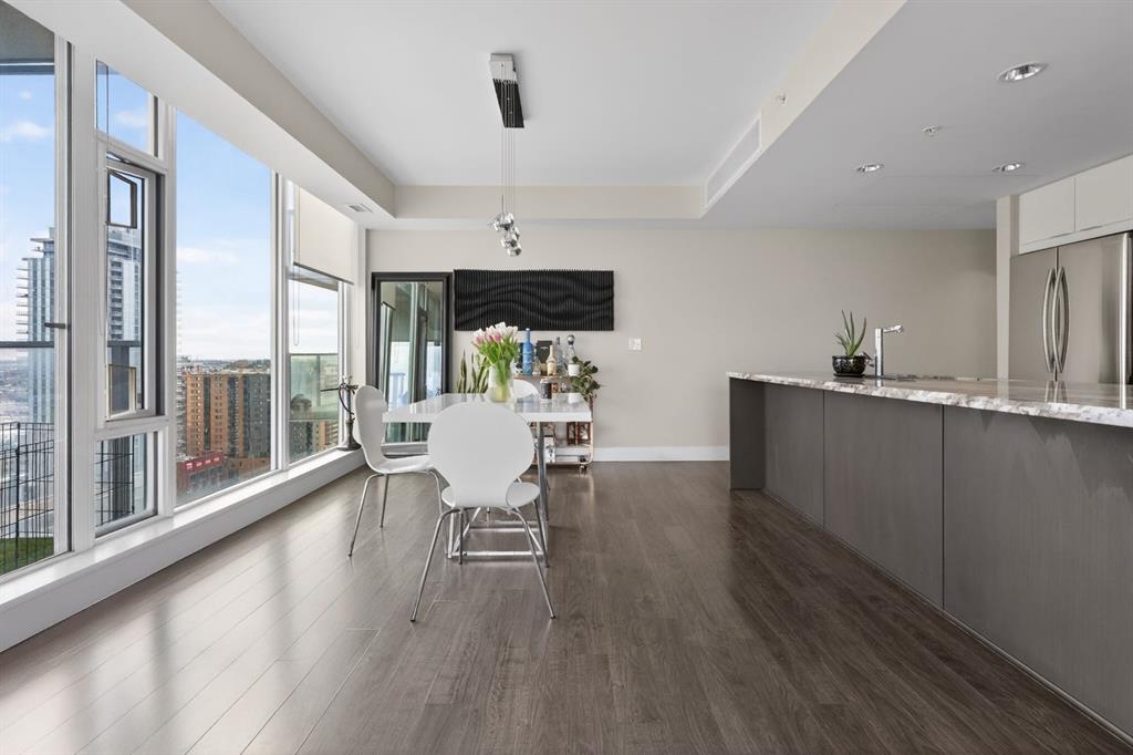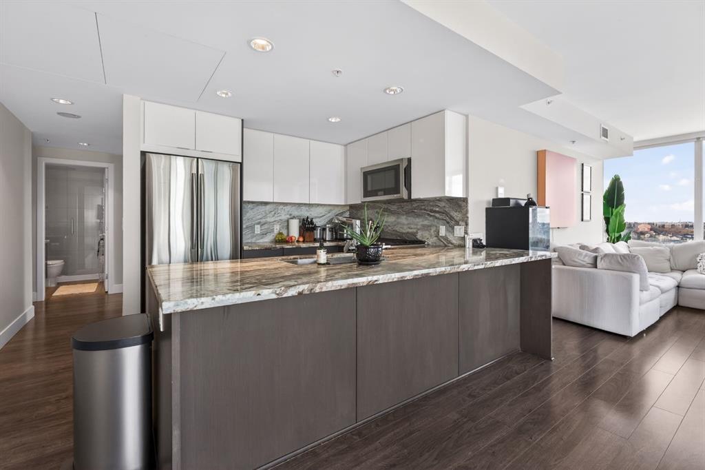 Perched on the 17th floor, this executive residence offers breathtaking views overlooking the Bow River and the vibrant city skyline. Designed with both comfort and style in mind, this spacious 2-bedroom, 2-bathroom suite features soaring ceilings, expansive floor-to-ceiling windows, rich hardwood and tile flooring, and plush carpeting in the primary bedroom. The open-concept layout seamlessly connects the kitchen, dining, and living areas—perfect for hosting guests or enjoying everyday living. The chef-inspired kitchen is equipped with a gas range, stainless steel appliances, granite countertops, and a sleek modern backsplash, delivering both functionality and sophistication. Retreat to the luxurious primary suite, complete with a spa-like 5-piece ensuite showcasing dual vanities, a deep soaker tub, and a fully tiled glass shower. Step outside to your oversized, nearly 20-foot-wide balcony—an ideal space for summer evenings, complete with room for lounging and BBQing while soaking in the incredible river views. Residents enjoy access to exceptional amenities, including a stunning rooftop courtyard, two fully equipped fitness centers, a sauna, and an expansive party room. With 24-hour concierge and security, peace of mind comes standard. This unit also includes a titled parking stall, a secure storage locker, and access to convenient visitor parking. Located in the heart of East Village, you’re just steps from river pathways, dining, shopping, and everything downtown living has to offer.