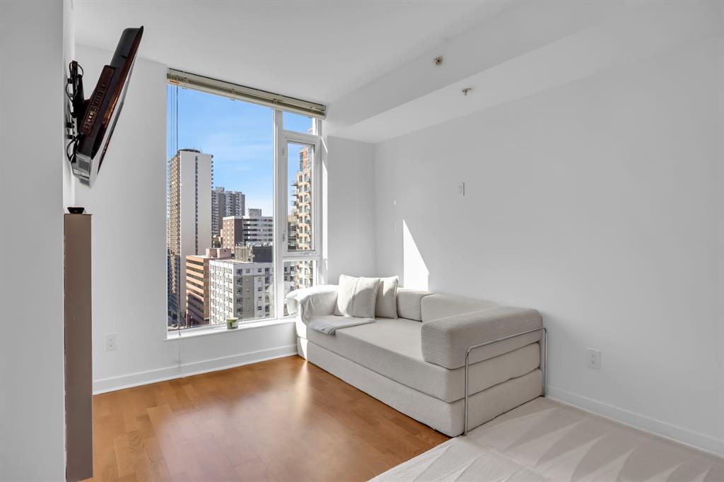 Welcome to Solaire, one of downtown Calgary’s most sought after high rise residences, ideally located in the vibrant West End and perfectly suited for young professionals, first time buyers, or investors seeking a refined urban lifestyle with long term upside. This freshly painted south facing 1 bedroom, 1 bathroom home on the 17th floor offers a bright, modern living space with sweeping city views through expansive floor to ceiling windows, creating an elevated downtown experience both day and night. The open concept layout is designed for both functionality and comfort, featuring engineered hardwood flooring and a spacious living area anchored by a contemporary gas fireplace, ideal for unwinding after work or hosting guests. The kitchen is thoughtfully designed with full height espresso cabinetry, granite countertops, under cabinet lighting, a built in pantry, a generous island with breakfast bar, and premium stainless steel appliances, offering both style and practicality for everyday living. The bedroom provides a quiet retreat with upgraded carpeting, French doors, and elegant wall mounted lighting, while the well appointed bathroom includes extended tile work and a granite vanity. Additional features such as in suite laundry, built in closet organizers, central air conditioning, and an in ceiling audio system enhance both comfort and convenience. This unit also includes a titled underground parking stall and an assigned storage locker, adding to its overall value and appeal. Solaire offers full service amenities including professional management, concierge service, and a fully equipped fitness centre, perfectly aligned with a lifestyle focused buyer who values convenience, security, and ease of living. From an investment perspective, this location is exceptionally strong, positioned in Calgary’s core with consistent rental demand driven by nearby offices, transit access, and lifestyle amenities. Just steps to the Bow River pathways, Eau Claire, the LRT station, and within walking distance to Kensington’s shops, restaurants, and cafes, this property offers unmatched walkability and connectivity, making it highly attractive to both tenants and future buyers. Whether you are looking to secure your first home, reduce commute times, or add a well located asset to your portfolio, this is a smart opportunity to invest in one of Calgary’s most established and desirable downtown communities.