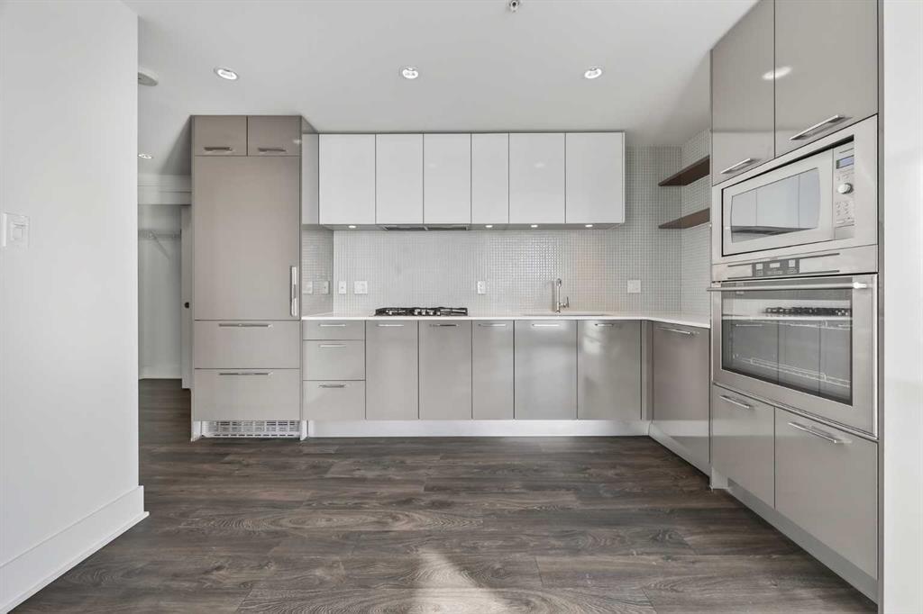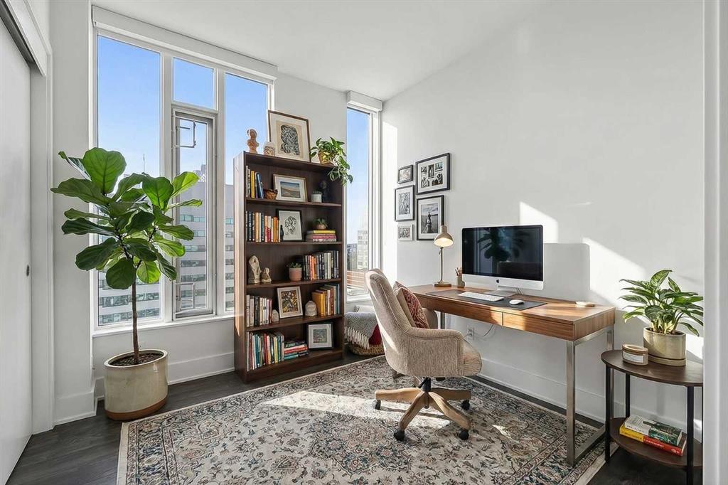 Perched high on the 17th floor of iconic MARK on 10th this spacious 740 sq ft condo has floor-to-ceiling windows with sweeping downtown views. Two bedrooms situated on opposite sides of the main living areas allows for maximum privacy making this layout ideal for shared living or for a dedicated home office. An open living/dining area with covered balcony facing SE is perfect for relaxed evenings. The sleek kitchen features a gas range, built-in stainless steel appliances and a paneled refrigerator. The guest bedroom/office offers great views and easy access to the main 4-piece bathroom while the primary bedroom enjoys it’s own 3-piece ensuite. Additional features include in-suite laundry and central air conditioning. Includes 1 titled heated underground parking stall and assigned storage locker. Pet-friendly building and monthly condo fees of $645.57/month include heat, water & sewer. MARK on 10th is known for it’s amazing amenities including concierge service, a fully equipped gym, sauna & steam room, resident lounge with kitchen and pool table and a stunning rooftop oasis with hot tub, barbecues, and lounge areas surrounded by panoramic views. Located just steps from transit, Safeway, Community Natural Foods, parks and Calgary’s premier dining and nightlife destinations.