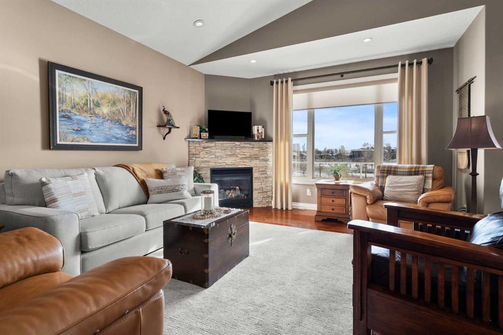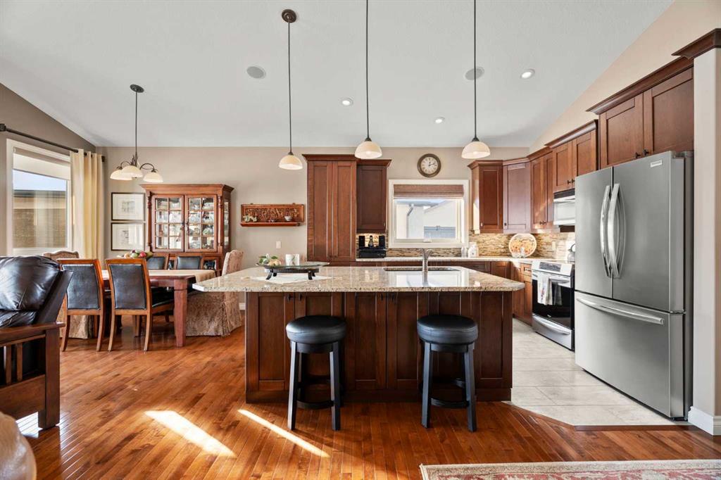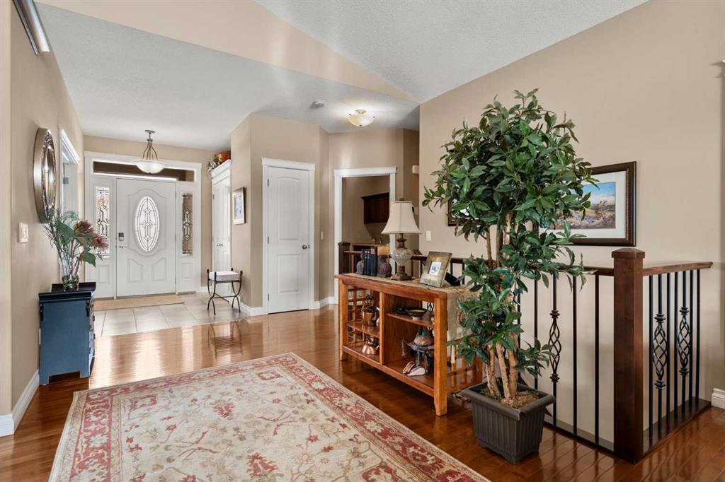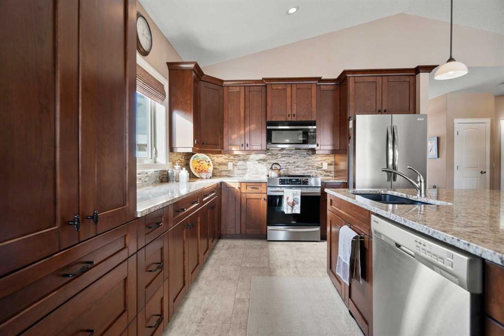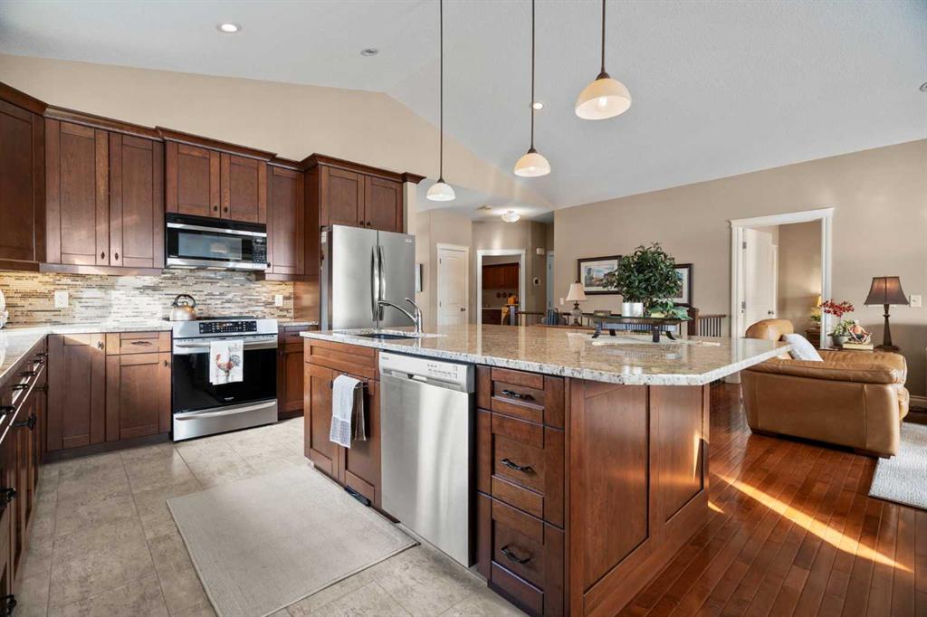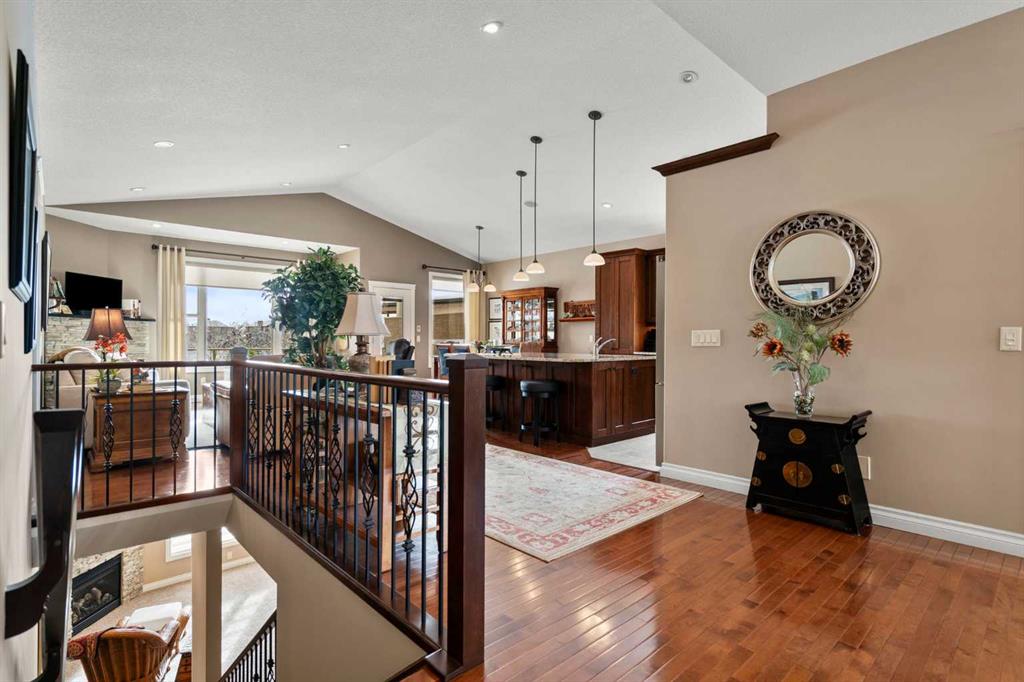 Luxurious small-town living! Ideally located where the prairies meet the mountains in High River, this stunning executive walkout bungalow backs directly onto Highwood Lake — a beautiful, naturalized setting with pathways & expansive green space. This exceptional lot was specifically chosen by custom home builder Allan Campbell for his personal residence. Plans changed, & the current owners have been the only ones to call this incredible property home. It’s easy to see why this location was selected, offering a serene & peaceful environment with convenient access to shops, High River’s charming downtown, amenities, entertainment, restaurants, & recreation. Enjoy the nearby Spray Park, George Lane Park & Highwood Golf Course. South Calgary is 30 mins & Okotoks (Costco) a quick 20 min drive. Situated on a massive reverse pie lot, this property offers stunning outdoor spaces & abundant parking including an oversized 862 sqft insulated garage with walk-up basement access, gas rough-in for a heater & plenty of room for tools & toys. The driveway holds 3+ vehicles, while the side RV driveway allows for winter storage with 130-amp power & roughed-in dumping station. The entire lot is meticulously landscaped with mature trees, perennials, irrigation system, solar water fountain, & a brand-new west-side fence — truly a gardener’s dream. Enjoy two exceptional outdoor living spaces: a lower-level patio with privacy screens & hot tub rough-in, & a full-width covered upper balcony with BBQ gas hookup, accessible from both the dining room & the primary bedroom. Both spaces are perfect for taking in the views & watching the ducks on the pond. Inside, the home features 9’ & vaulted ceilings on the main level, 9’ basement ceilings, granite counters throughout, in-floor heating in the primary bathroom & basement, built-in interior/exterior speakers, power shades, soft-close hardware, & endless storage throughout. Flooded with natural light, the traditional layout is both functional & welcoming for a variety of lifestyles. The main floor offers a beautiful primary suite with walk-in closet & 5-piece ensuite, an ideal laundry/mudroom, a 2nd bedroom (also perfect as a den or office), & a convenient half bath. The kitchen is outstanding! It features a large island, oversized cabinetry, updated vinyl flooring, & a stainless appliance package including a newer Frigidaire induction stove & refrigerator. The walkout level is designed for entertaining, showcasing a massive recreation room, built-in media center, wet bar, games area, two large bedrooms, & a full bathroom. RECENT UPGRADES – Central A/C, R-50 attic insulation over both the house & garage, a composite front deck, healthy climate furnace filter, updated humidifier, fibre optic cable, Larson storm door, new hot water tank (2025), lighting, & more! Ask your Realtor for a complete list of upgrades & features. Do not miss this rare opportunity to own a serene, scenic, & turn-key property in one of High River’s most desirable areas.