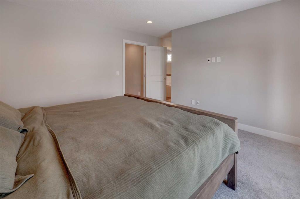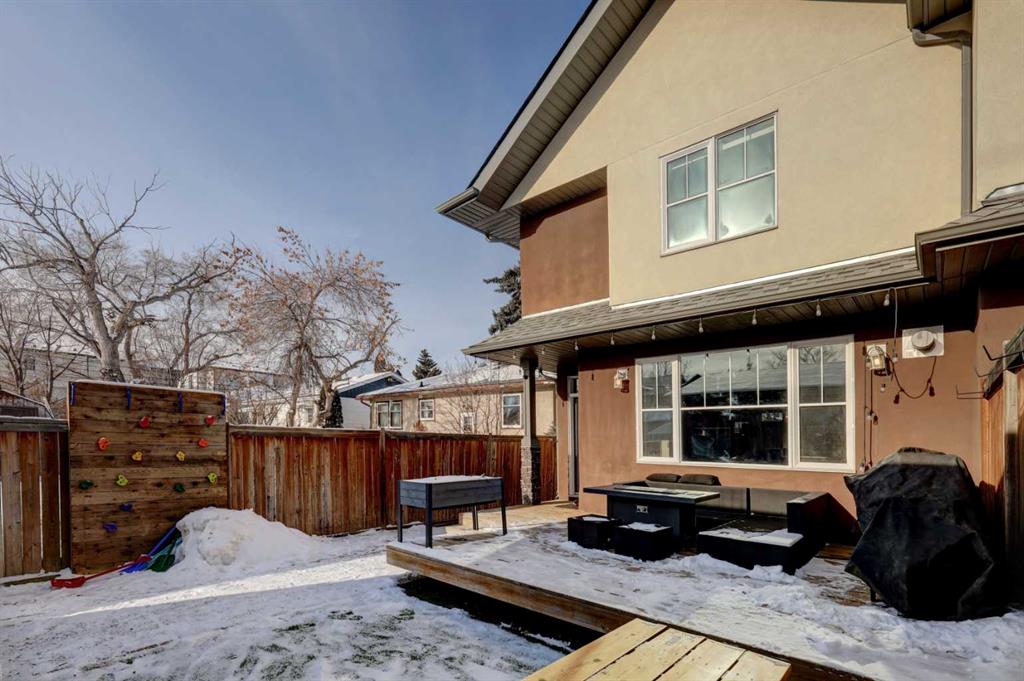 his stunning home offers a very bright & open floor plan, thoughtfully designed for both everyday living & entertaining. The inviting living room features a cozy fireplace & a large window that fills the space with an abundance of natural light. The island kitchen is a true showpiece, showcasing granite countertops, soft-close cabinetry, corner pantry & upper & under LED lighting. High-end stainless steel appliances, including the washer & dryer, complete the space with both style & functionality. The spacious primary suite is a private retreat, featuring a custom walk-in closet with built-in organizers & a luxurious ensuite with a jetted jacuzzi tub & a beautifully tiled rain shower. Two additional well-sized bedrooms & convenient upper-level laundry complete the second floor. The fully developed basement extends the living space with an additional bedroom boasting a large walk-in closet, a full bathroom, & an impressive theatre room with a wet bar—perfect for movie nights or hosting guests. Outside, the south-facing backyard is ideal for enjoying the sun, offering a large deck & an exposed aggregate concrete patio. Additional highlights include air conditioning & a drywalled, heated double detached garage. All this with easy access to downtown & all amenities – SAIT, University of Calgary, shopping, coffee shops, restaurants, public transportation & so much more! You’ll love living here!!!
