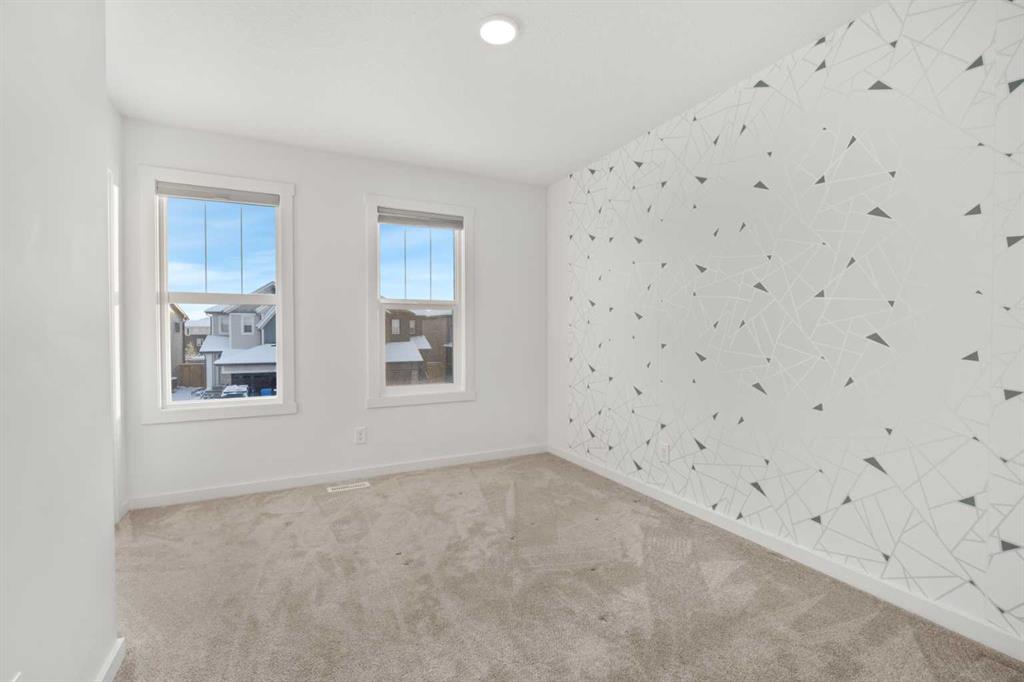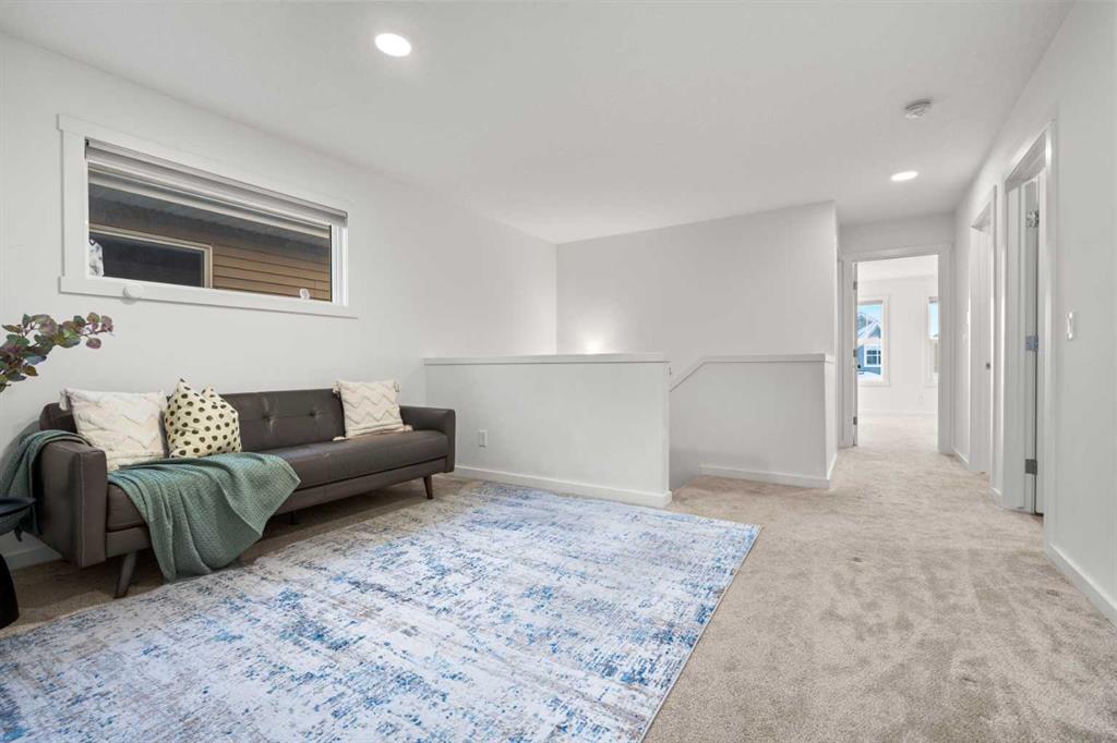 Welcome to this beautifully appointed 3-bedroom, 2.5-bath duplex in the peaceful and thoughtfully designed community of Creekstone—one of Southwest Calgary’s most exciting new neighbourhoods. This home offers the perfect blend of modern comfort and natural surroundings, featuring a quiet family-friendly street, a single attached garage, a spacious backyard with an oversized deck, and open views with no rear neighbours—including a glimpse of downtown Calgary. Inside, the main floor is filled with natural light thanks to oversized windows, 9 ft ceilings, and light-toned luxury vinyl plank flooring. The kitchen stands out with stainless steel appliances, rich dark cabinetry raised to the bulkhead, quartz countertops, a large pantry, and a generous centre island, all flowing into a bright dining area and a stylish rear living room with wall-to-wall windows, patio doors, and a custom wood-slat entertainment wall. Upstairs, a central bonus room provides flexible space, while the primary bedroom offers downtown views, a walk-in closet, and a beautiful 4-piece ensuite. Two additional bedrooms, a full bathroom, and a dedicated laundry room complete the upper level. The home also includes a separate side entrance with basement framing and plumbing already done, making it easier to convert into a future 1-bedroom suite (subject to city approval), supported by a low look-out basement window at eye level. Living in Pine Creek means enjoying over 50% preserved natural land with walking paths, wetlands, storm ponds, and playgrounds, plus future plans for a school and sports fields—all while being minutes from South Health Campus, Spruce Meadows, Fish Creek Park, and major routes like Macleod Trail and Stoney Trail. Whether you’re starting a family, seeking more space, or exploring rental potential, this home delivers exceptional value, comfort, and lifestyle.