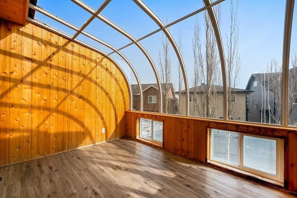 Welcome to this beautifully updated & move-in ready 3-bedroom, 3.5-bath two-storey home, ideally situated on a quiet street in the sought-after community of Kincora. Just minutes from Creekside, Sage Hill, & Beacon Hill Shopping Centres—with everything from Walmart to Costco, dining, & everyday amenities close at hand—plus easy access to transit, parks, & major roadways, this home offers the perfect balance of convenience, comfort, & lifestyle. Step inside to discover a bright, open-concept layout designed for both everyday living & entertaining. Freshly painted with new carpet throughout (completed March 2024), this home feels clean, modern, & turnkey from the moment you walk in. The spacious front entry leads into a stunning kitchen featuring custom cabinetry with convenient roll-outs, stainless steel appliances, leather-finished granite countertops, a full-height granite backsplash, & a large centre island with undermount double sink. A standout feature of this home is the fabulous walk-through pantry, offering a functional blank canvas for exceptional storage & organization. Thoughtfully designed to connect the kitchen & mudroom, this space is ideal for busy households, grocery drop-offs, & keeping everyday essentials neatly tucked away. Customize the perfect pantry to suit your individual needs. The inviting living room is anchored by a custom-built fireplace surround featuring an electric fireplace, creating a warm & stylish focal point. The adjoining dining area flows seamlessly into phenomenal outdoor living spaces. Enjoy a large covered sun porch with beautiful cedar decking, a bright three-season sunroom (approx 100 sq ft), & a private two-tiered deck complete with gas BBQ hookup & wiring ready for a future hot tub. The beautifully landscaped pie-shaped lot is fully fenced & professionally designed, creating the perfect setting for summer evenings, family gatherings, or quiet mornings with coffee. The rear yard also features an oversized storage shed for seasonal & outdoor items. Upstairs, you’ll find 3 spacious bedrooms including a serene primary retreat with a fully completed walk-in closet with custom built-ins & a luxurious 5-piece ensuite with corner soaker tub, walk-in shower, granite countertops, & Kohler fixtures. A well-appointed 4-piece bathroom with tile flooring & granite counters completes the upper level. The fully finished basement offers additional living space with a large rec room, oversized windows, a full 4-piece bathroom, linen storage, & a dedicated utility & storage area. Major mechanical updates provide peace of mind, including a new furnace & central air conditioning installed in July 2025, along with a new roof & garage door. Additional features include LVP flooring, tile bathroom floors, custom window shutters, built-in speaker wiring, & a finished heated double attached garage with extended driveway. This thoughtfully maintained & beautifully upgraded home is truly one of a kind & ready for its next owners.