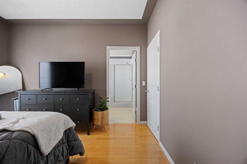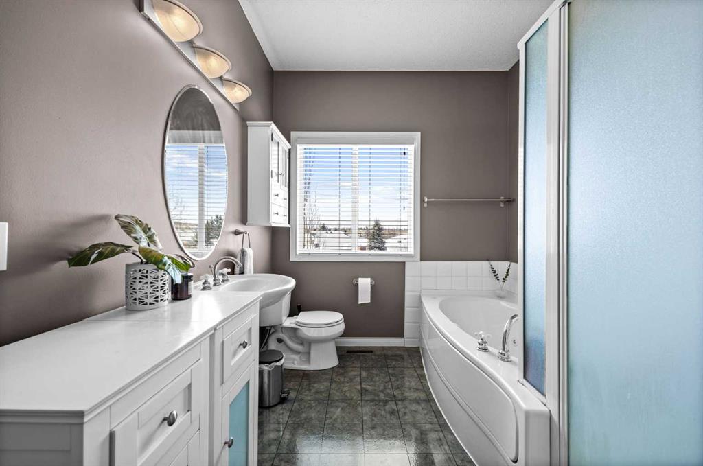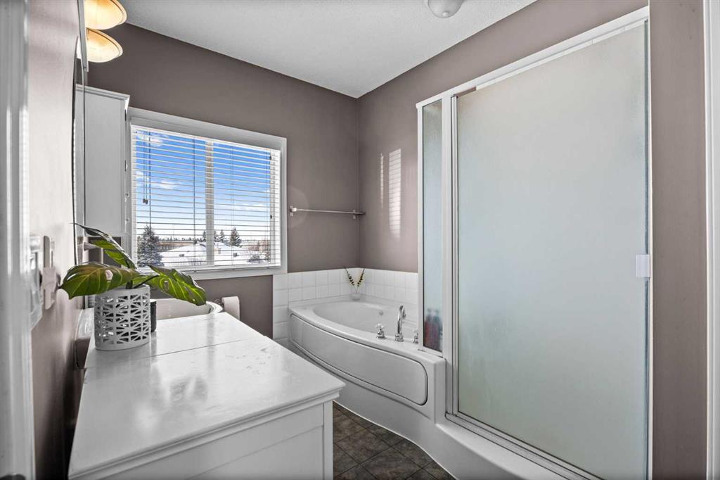 Upstairs, the home features two spacious primary bedrooms, each complete with its own ensuite bathroom and walk-in closet — perfect for guests, roommates, or a flexible family setup. Both rooms offer generous space and privacy, with one capturing those incredible mountain views.