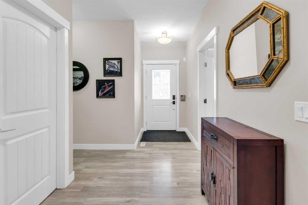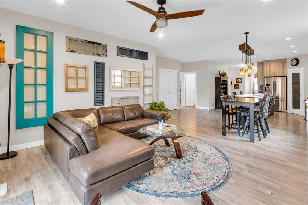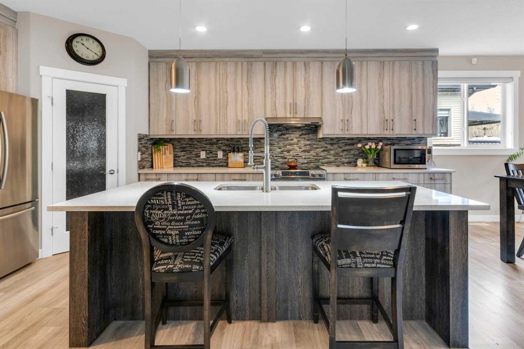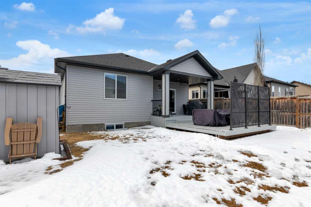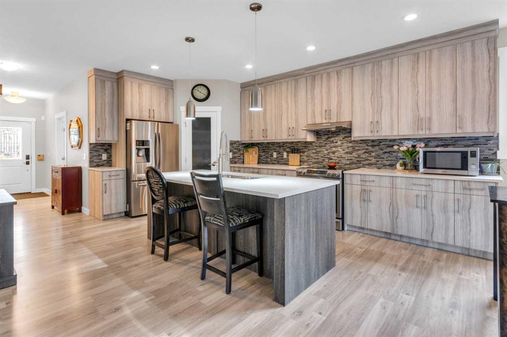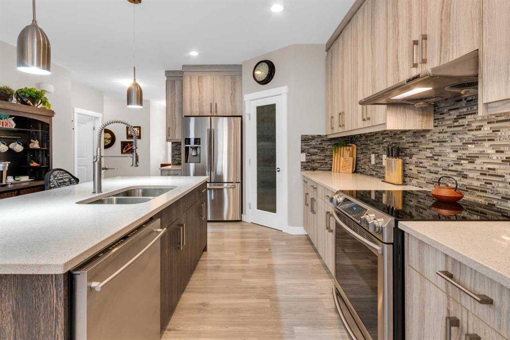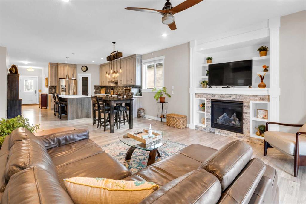 ** OPEN HOUSE Sunday March 22nd from 2-4pm ** MODERN LUXURY meets SMALL TOWN SERENITY in this show-stopping, fully finished Bungalow with the ultimate TRIPLE ATTACHED DREAM GARAGE & expansive backyard! A massive driveway and covered Front Porch set the tone before stepping inside to a thoughtfully designed entry. The front Foyer flows into an organized walk-in closet for coats, and Mudroom, where there’s a second oversized closet with shelving tucked discreetly behind French doors —keeping everyday life beautifully organized & out of sight. A bright front Office with a large window offers the perfect work-from-home space. The heart of the home is a magazine-worthy Kitchen! Showcasing full-height custom cabinetry that extends seamlessly to the ceiling, a timeless tile backsplash, elegant stone countertops, rich contrasting eat-up island with a sink that creates the ideal gathering space, complemented by SS appliances including an electric range (gas line in place), AND a spacious corner Pantry. Ok, SOLD?! But there’s so much more… The Dining area connects effortlessly to the inviting Living Room, where a striking gas fireplace with floor-to-ceiling stonework and custom built-in cubbies, shelves & mantle create a warm and sophisticated focal point. Step outside through the large sliding doors to a spectacular two-tiered, partially covered deck with gas line for BBQ, privacy feature wall, and sweeping views of the huge, fully landscaped & fenced backyard. Mature trees, a storage shed, and a spacious side yard perfect for a dog run complete this outdoor retreat. The Primary Suite is generously sized and beautifully finished, with a luxurious 5-pc Ensuite with dual sinks, tiled floors, a JETTED SOAKER TUB beneath the window, an O/S walk-in shower, and a big walk-in closet with built-in organization. Finishing-off the main floor is a 2nd spacious Bedroom, a 4-pc Bathroom with stone counters & vanity storage, and a Laundry Room with tile flooring & French doors. The FULLY FINISHED BASEMENT continues the home’s elevated feel with LVP floors, tall ceilings, and recessed lighting. A cozy corner gas fireplace with full-height stone surround anchors the space, while TWO BIG bedrooms—both with WALK-IN closets—offer incredible flexibility! A wide hallway includes 220 wiring for the current corner SAUNA, leading to an elegant 3-pc Bath with an O/S tiled walk-in shower and modern vanity. This Basement has a GREAT layout, completed by a large storage area and utility room. Located in the welcoming community of Didsbury, on a GREAT Street, this home offers the perfect balance of small-town charm and everyday convenience—with excellent schools, parks, walking paths, and quick access for commuters. With its thoughtful layout, high-end finishes, incredible outdoor space, and standout triple Garage (that accommodates a half-ton truck no problem), this home is truly the complete package. Your dream bungalow awaits… Book your private viewing today!