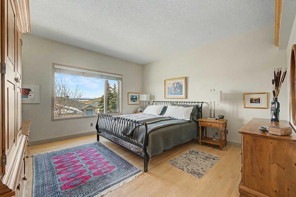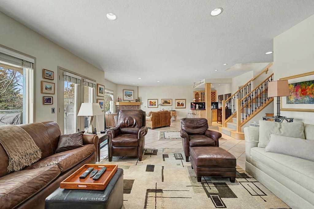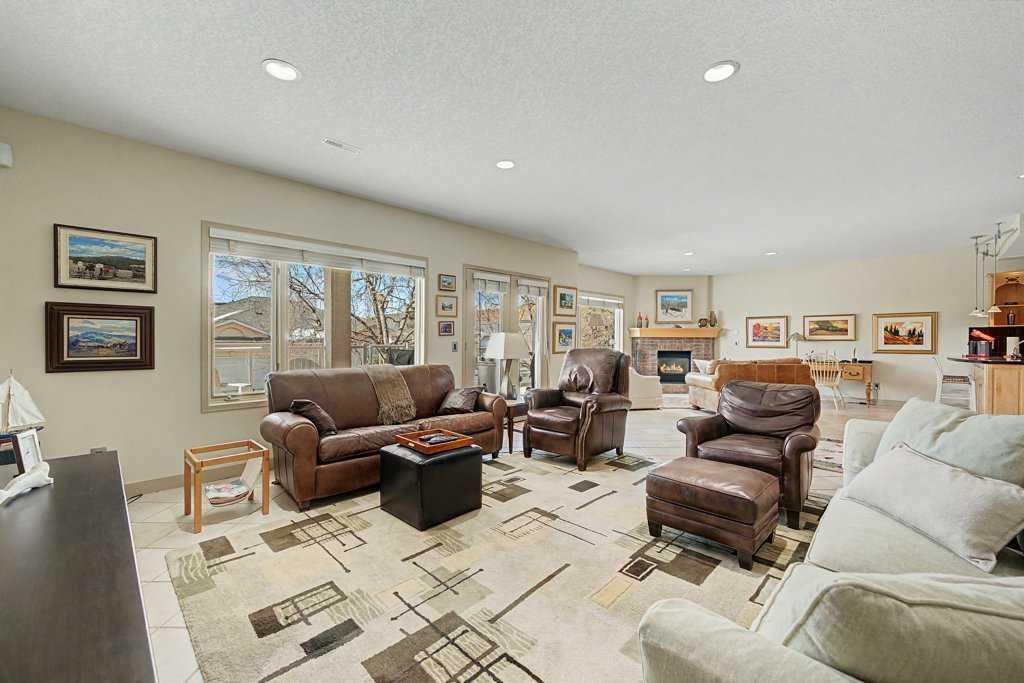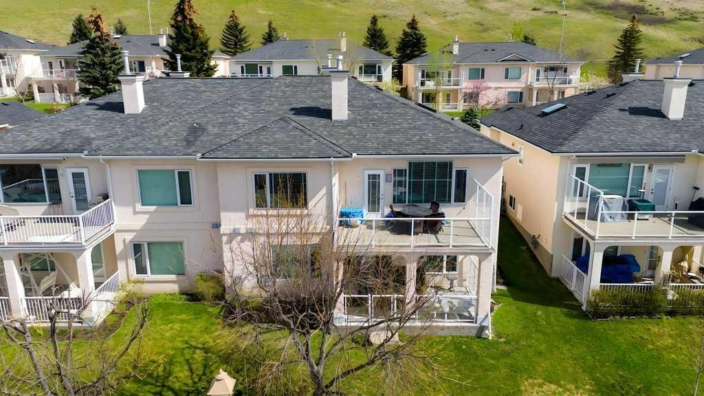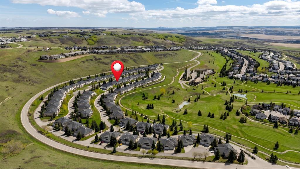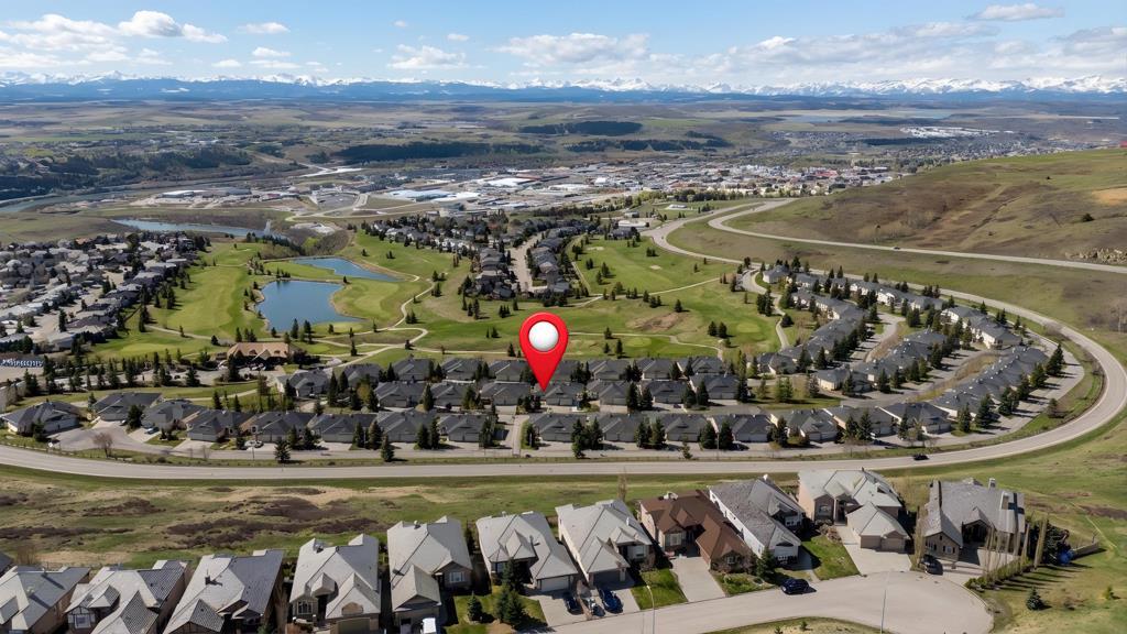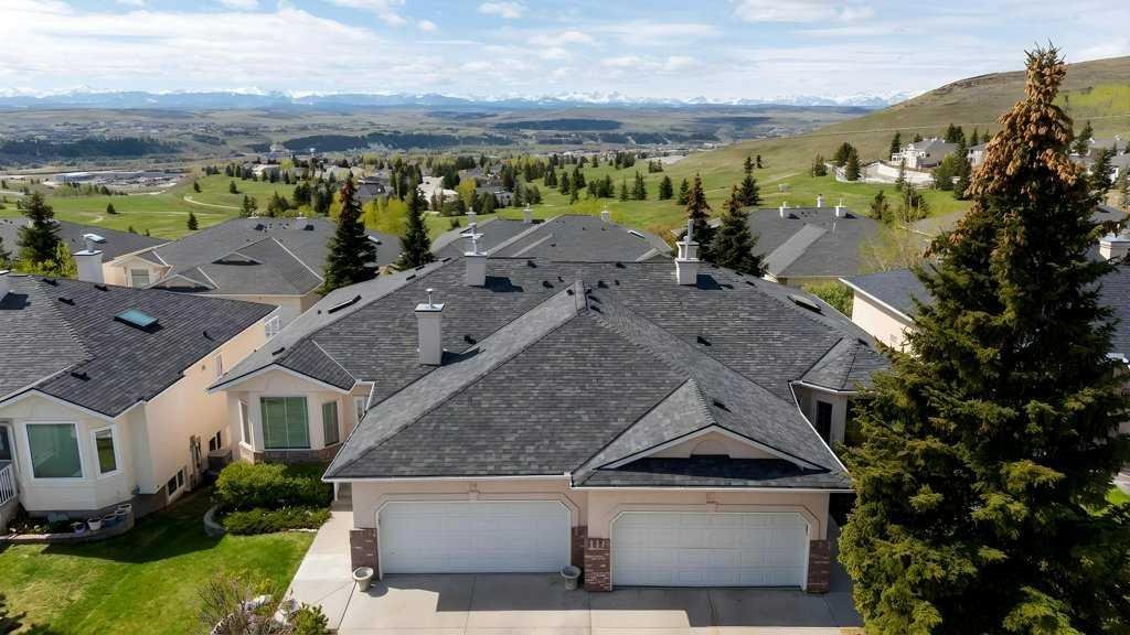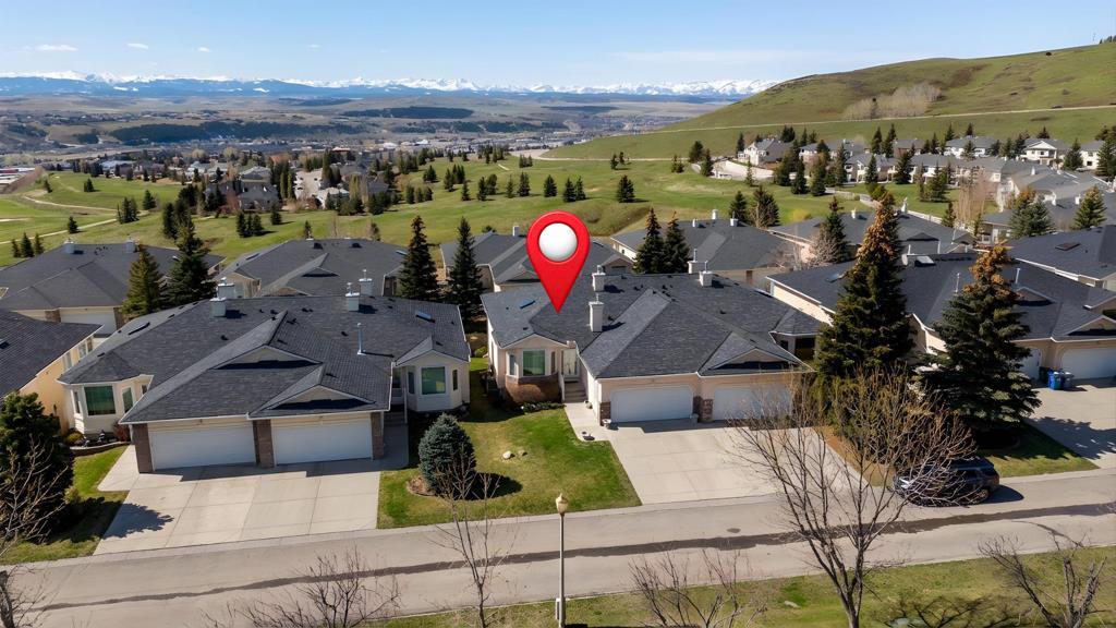 ABSOLUTELY GORGEOUS WALKOUT VILLA! ONE OF THE LARGEST FLOORPLANS! Is it time to throw away the snow shovel and the lawnmower? MORE FUN, LESS WORK! Do you love GOLF or TRAVELLING more than outside chores? How about a WALKOUT BUNGALOW VILLA with a FINISHED BASEMENT and GORGEOUS VIEWS, located very close to the ‘Links of Gleneagles’? Come see 18 Eagleview Gate! Impeccable from start to finish! PARK YOUR CAR(S) IN YOUR INSULATED DOUBLE GARAGE (with RADIANT HEATER)! From the garage, step into the clean and tidy ‘mudroom’ (which doubles as a laundry room with built-in cabinets and sink). Nice curb appeal with BAY WINDOW & BRICK DETAILING. At the front entry, your guests will be greeted by a decorative front door with matching sidelight! Plenty of room in the foyer to welcome a whole group at once! They’ll step in the door and say ‘Wow’! This villa is full of natural light, thanks to abundant windows! The home immediately feels elegant because the DINING ROOM is exactly that – an ELEGANT SPACE for all your special family gatherings! This villa is very well-appointed! EXTENSIVE HARDWOOD FLOORING and MANY UPGRADES and thoughtful touches! Find your way to the kitchen. You will love this KITCHEN WITH ADJOINING EATING AREA! The skylight gives the kitchen a view to the sunshine (or stars) above! Beautiful cabinetry! SOLID MAPLE DOORS (and even solid maple end panels)! BUILT-IN WINE RACK AND BUILT-IN APPLIANCES! No more reaching down to floor level to open the oven (or into cabinetry, thanks to plenty of pull-out storage in lower cabinets). Shiny STAINLESS-STEEL appliances (SUB-ZERO and MIELE) and shimmering STONE COUNTERTOPS! The microwave doubles as a second oven so you can COOK TURKEY AND HAM AT THE SAME TIME! After dinner, sit down with your guests in a LIVING ROOM WITH A VIEW (and a GREAT FIREPLACE)! THE ROCKY MOUNTAINS and the SUNSETS ARE SPECTACULAR! STAY COMFORTABLE any time of year with 2 GAS FIREPLACES, SLAB HEAT IN THE BASEMENT, AND CENTRAL AIR CONDITIONING! Step out to the back deck (with a gas line) for a summer BBQ and enjoy the sunny SW exposure! MAPLE & IRON railing will lead down to the lower WALKOUT LEVEL, where you will find another spacious bedroom, a hobby room (with countertop and plenty of upper storage cabinets), a full bathroom (with shower tile to the ceiling), and a rec room with a corner fireplace (brick-faced with matching maple mantle)! SLAB HEAT keeps the basement temperature very consistent and very comfortable on the feet! The lower patio is enclosed (by aluminum railing with glass inserts, and a little gate to take the puppy or the grandkids for a walk). Fantastic basement bar (with a maple-paneled SUB-ZERO bar fridge, more wine storage, and display cabinets)! At the end of a busy day, enjoy SOAKING IN YOUR SPA-LIKE ENSUITE BATHROOM! The ensuite shower is fully tiled, with high gauge glass. The AIR-JET TUB will soothe your achy muscles! Double sinks, and a walk-in closet. A perfect retirement villa!