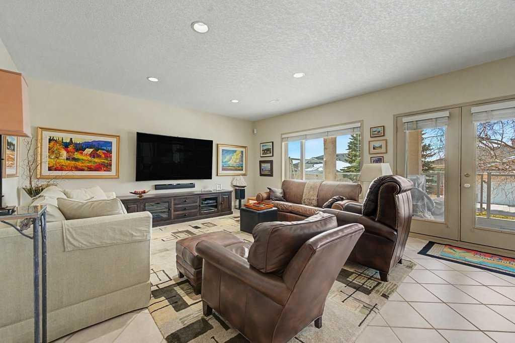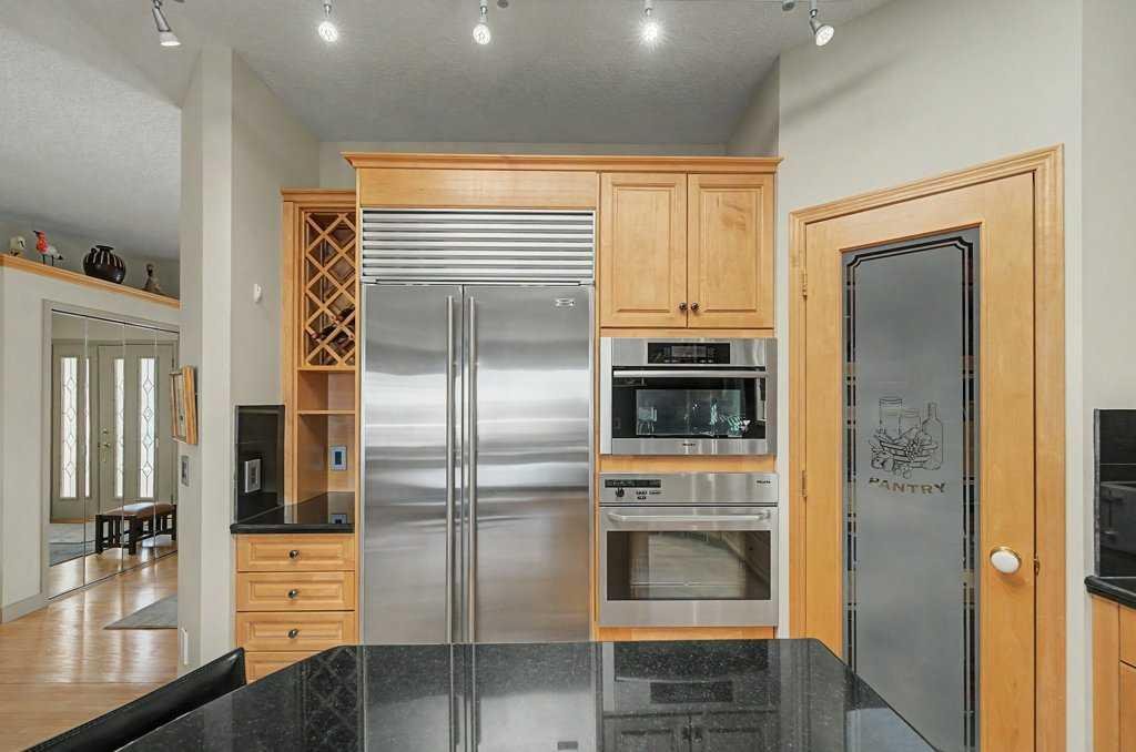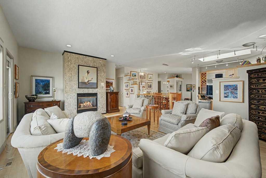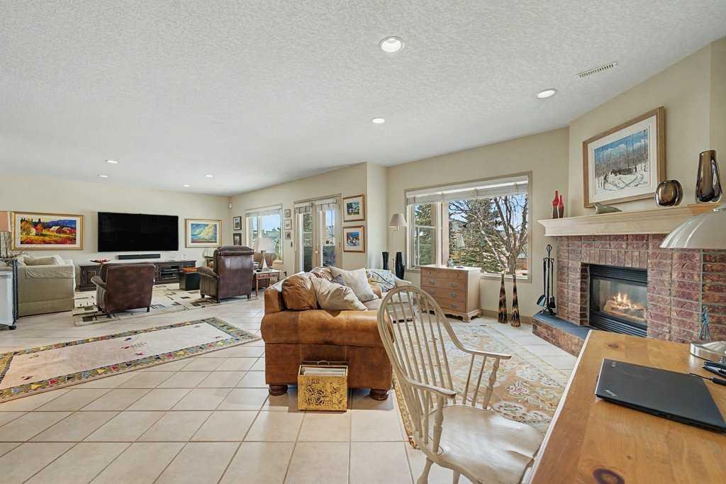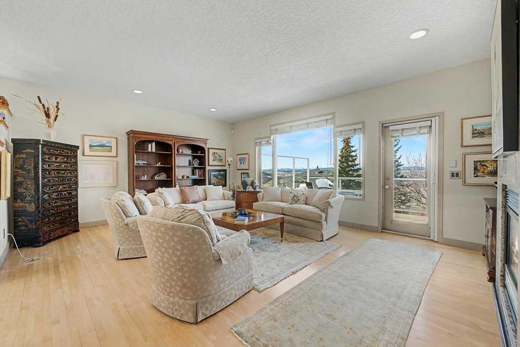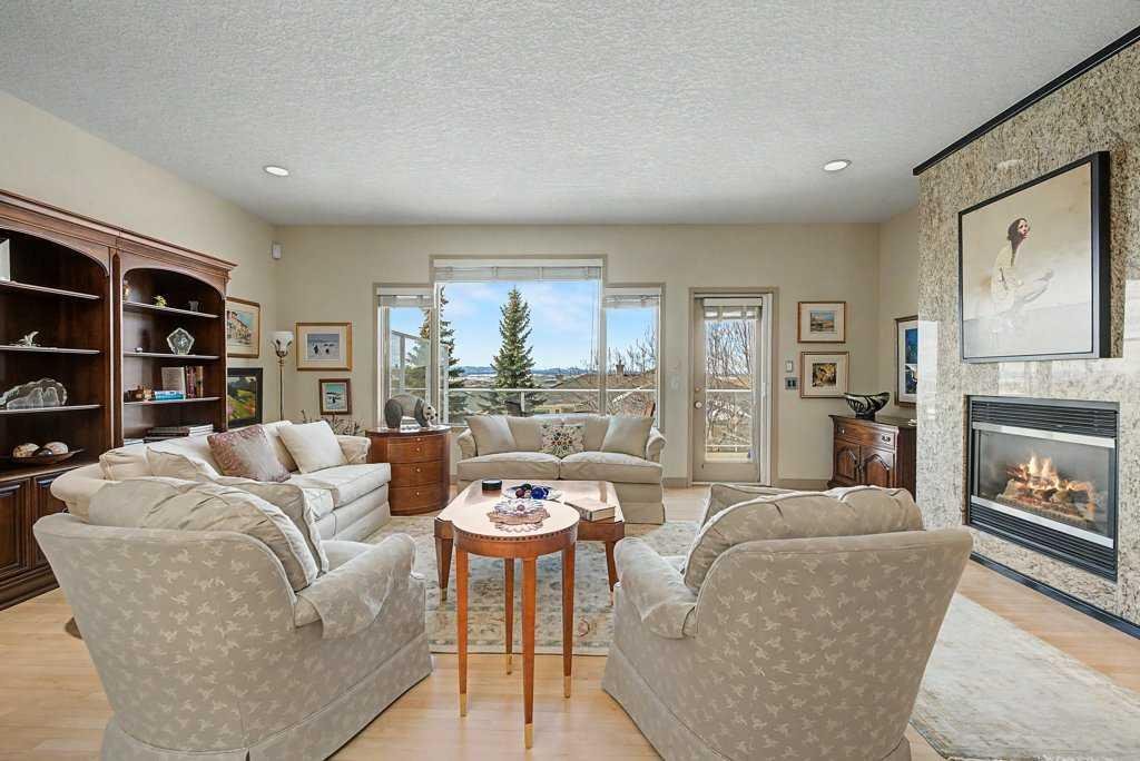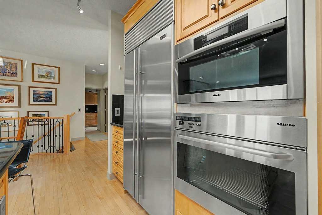 ABSOLUTELY GORGEOUS WALKOUT VILLA! ONE OF THE LARGEST FLOORPLANS! Is it time to throw away the snow shovel and the lawnmower? MORE FUN, LESS WORK! Do you love GOLF or TRAVELLING more than outside chores? How about a WALKOUT BUNGALOW VILLA with a FINISHED BASEMENT and GORGEOUS VIEWS, located very close to the ‘Links of Gleneagles’? Come see 18 Eagleview Gate! Impeccable from start to finish! PARK YOUR CAR(S) IN YOUR INSULATED DOUBLE GARAGE (with RADIANT HEATER)! From the garage, step into the clean and tidy ‘mudroom’ (which doubles as a laundry room with built-in cabinets and sink). Nice curb appeal with BAY WINDOW & BRICK DETAILING. At the front entry, your guests will be greeted by a decorative front door with matching sidelight! Plenty of room in the foyer to welcome a whole group at once! They’ll step in the door and say ‘Wow’! This villa is full of natural light, thanks to abundant windows! The home immediately feels elegant because the DINING ROOM is exactly that – an ELEGANT SPACE for all your special family gatherings! This villa is very well-appointed! EXTENSIVE HARDWOOD FLOORING and MANY UPGRADES and thoughtful touches! Find your way to the kitchen. You will love this KITCHEN WITH ADJOINING EATING AREA! The skylight gives the kitchen a view to the sunshine (or stars) above! Beautiful cabinetry! SOLID MAPLE DOORS (and even solid maple end panels)! BUILT-IN WINE RACK AND BUILT-IN APPLIANCES! No more reaching down to floor level to open the oven (or into cabinetry, thanks to plenty of pull-out storage in lower cabinets). Shiny STAINLESS-STEEL appliances (SUB-ZERO and MIELE) and shimmering STONE COUNTERTOPS! The microwave doubles as a second oven so you can COOK TURKEY AND HAM AT THE SAME TIME! After dinner, sit down with your guests in a LIVING ROOM WITH A VIEW (and a GREAT FIREPLACE)! THE ROCKY MOUNTAINS and the SUNSETS ARE SPECTACULAR! STAY COMFORTABLE any time of year with 2 GAS FIREPLACES, SLAB HEAT IN THE BASEMENT, AND CENTRAL AIR CONDITIONING! Step out to the back deck (with a gas line) for a summer BBQ and enjoy the sunny SW exposure! MAPLE & IRON railing will lead down to the lower WALKOUT LEVEL, where you will find another spacious bedroom, a hobby room (with countertop and plenty of upper storage cabinets), a full bathroom (with shower tile to the ceiling), and a rec room with a corner fireplace (brick-faced with matching maple mantle)! SLAB HEAT keeps the basement temperature very consistent and very comfortable on the feet! The lower patio is enclosed (by aluminum railing with glass inserts, and a little gate to take the puppy or the grandkids for a walk). Fantastic basement bar (with a maple-paneled SUB-ZERO bar fridge, more wine storage, and display cabinets)! At the end of a busy day, enjoy SOAKING IN YOUR SPA-LIKE ENSUITE BATHROOM! The ensuite shower is fully tiled, with high gauge glass. The AIR-JET TUB will soothe your achy muscles! Double sinks, and a walk-in closet. A perfect retirement villa!