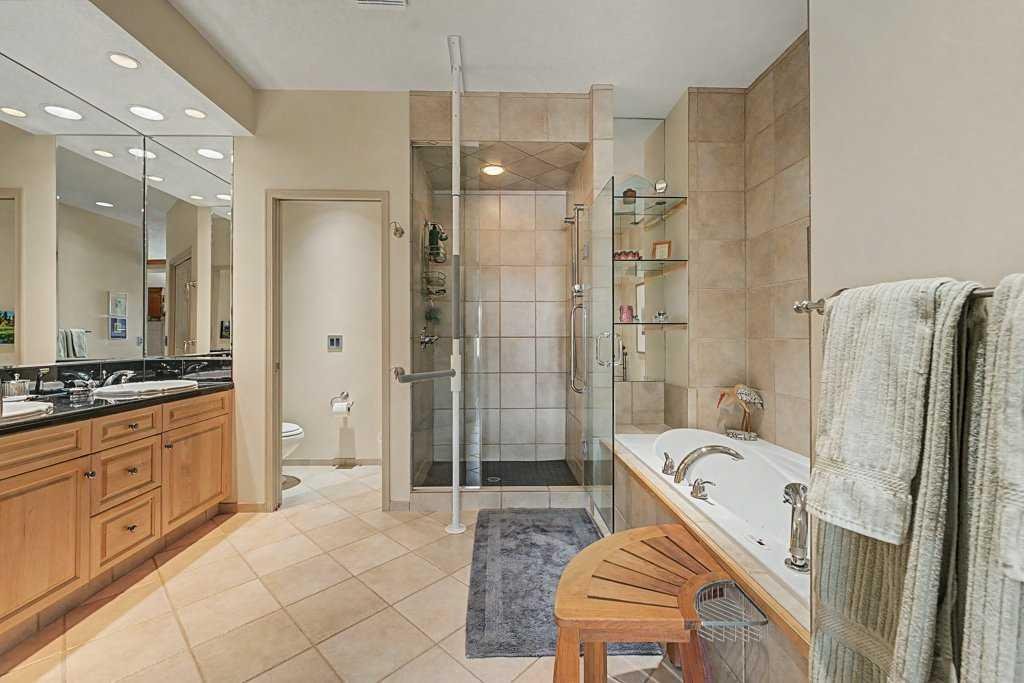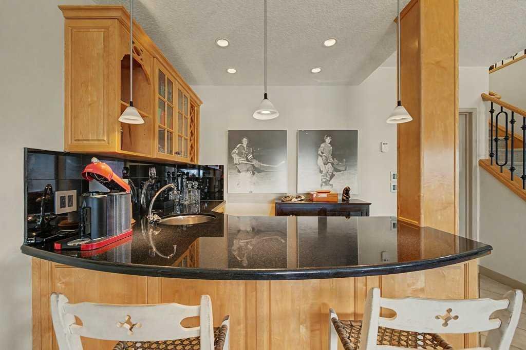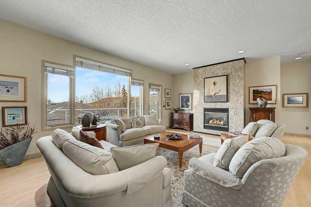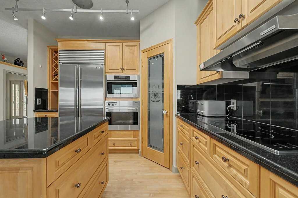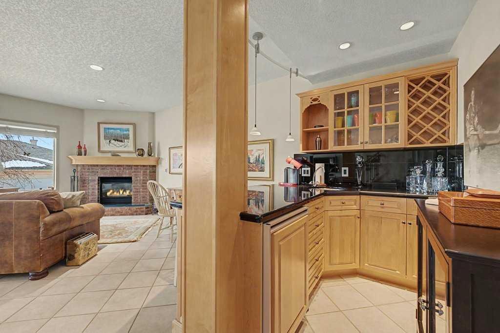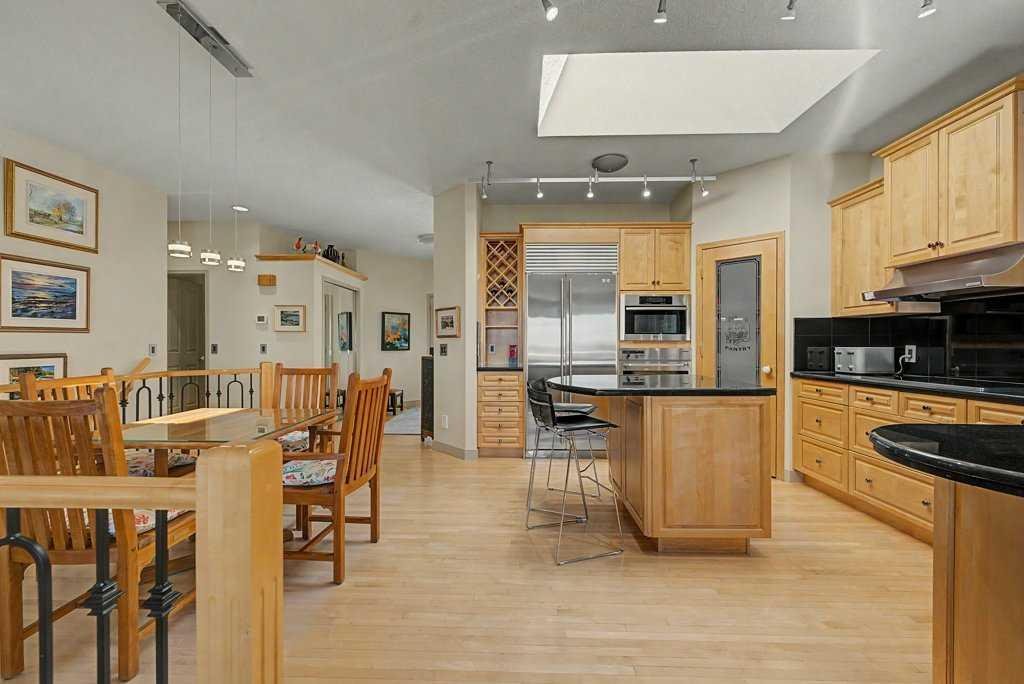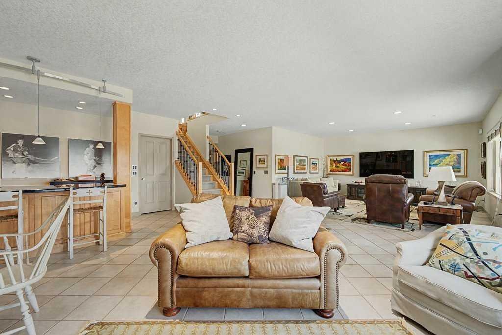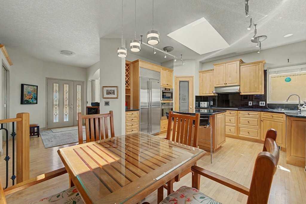 ABSOLUTELY GORGEOUS WALKOUT VILLA! ONE OF THE LARGEST FLOORPLANS! Is it time to throw away the snow shovel and the lawnmower? MORE FUN, LESS WORK! Do you love GOLF or TRAVELLING more than outside chores? How about a WALKOUT BUNGALOW VILLA with a FINISHED BASEMENT and GORGEOUS VIEWS, located very close to the ‘Links of Gleneagles’? Come see 18 Eagleview Gate! Impeccable from start to finish! PARK YOUR CAR(S) IN YOUR INSULATED DOUBLE GARAGE (with RADIANT HEATER)! From the garage, step into the clean and tidy ‘mudroom’ (which doubles as a laundry room with built-in cabinets and sink). Nice curb appeal with BAY WINDOW & BRICK DETAILING. At the front entry, your guests will be greeted by a decorative front door with matching sidelight! Plenty of room in the foyer to welcome a whole group at once! They’ll step in the door and say ‘Wow’! This villa is full of natural light, thanks to abundant windows! The home immediately feels elegant because the DINING ROOM is exactly that – an ELEGANT SPACE for all your special family gatherings! This villa is very well-appointed! EXTENSIVE HARDWOOD FLOORING and MANY UPGRADES and thoughtful touches! Find your way to the kitchen. You will love this KITCHEN WITH ADJOINING EATING AREA! The skylight gives the kitchen a view to the sunshine (or stars) above! Beautiful cabinetry! SOLID MAPLE DOORS (and even solid maple end panels)! BUILT-IN WINE RACK AND BUILT-IN APPLIANCES! No more reaching down to floor level to open the oven (or into cabinetry, thanks to plenty of pull-out storage in lower cabinets). Shiny STAINLESS-STEEL appliances (SUB-ZERO and MIELE) and shimmering STONE COUNTERTOPS! The microwave doubles as a second oven so you can COOK TURKEY AND HAM AT THE SAME TIME! After dinner, sit down with your guests in a LIVING ROOM WITH A VIEW (and a GREAT FIREPLACE)! THE ROCKY MOUNTAINS and the SUNSETS ARE SPECTACULAR! STAY COMFORTABLE any time of year with 2 GAS FIREPLACES, SLAB HEAT IN THE BASEMENT, AND CENTRAL AIR CONDITIONING! Step out to the back deck (with a gas line) for a summer BBQ and enjoy the sunny SW exposure! MAPLE & IRON railing will lead down to the lower WALKOUT LEVEL, where you will find another spacious bedroom, a hobby room (with countertop and plenty of upper storage cabinets), a full bathroom (with shower tile to the ceiling), and a rec room with a corner fireplace (brick-faced with matching maple mantle)! SLAB HEAT keeps the basement temperature very consistent and very comfortable on the feet! The lower patio is enclosed (by aluminum railing with glass inserts, and a little gate to take the puppy or the grandkids for a walk). Fantastic basement bar (with a maple-paneled SUB-ZERO bar fridge, more wine storage, and display cabinets)! At the end of a busy day, enjoy SOAKING IN YOUR SPA-LIKE ENSUITE BATHROOM! The ensuite shower is fully tiled, with high gauge glass. The AIR-JET TUB will soothe your achy muscles! Double sinks, and a walk-in closet. A perfect retirement villa!