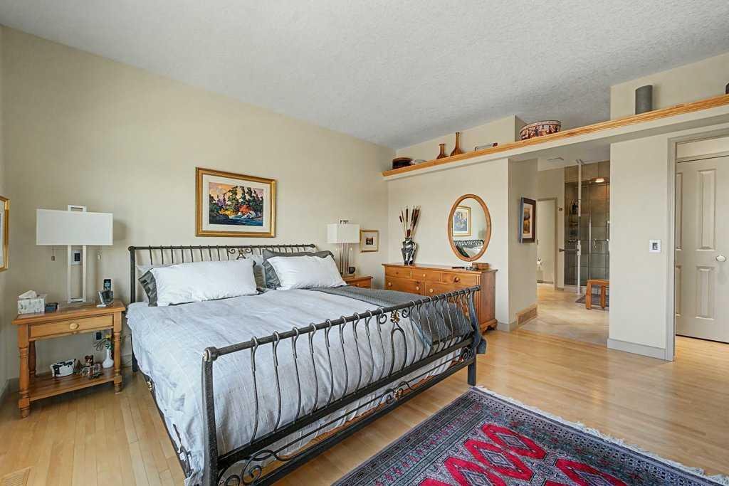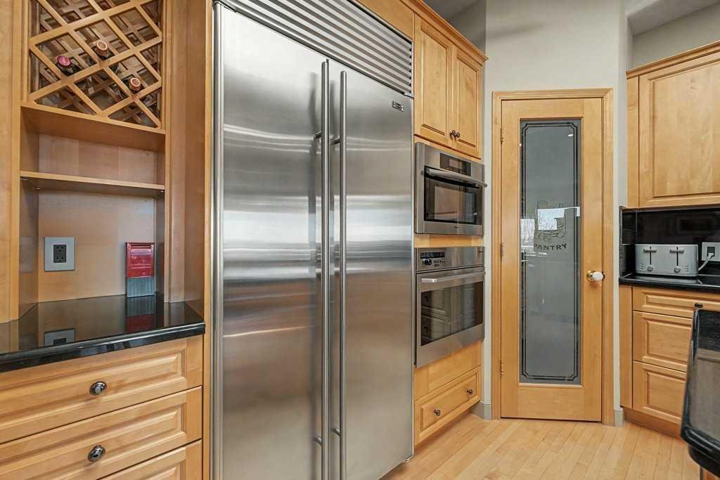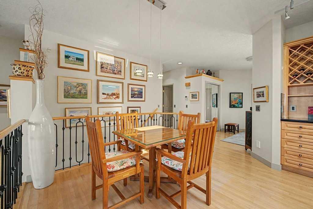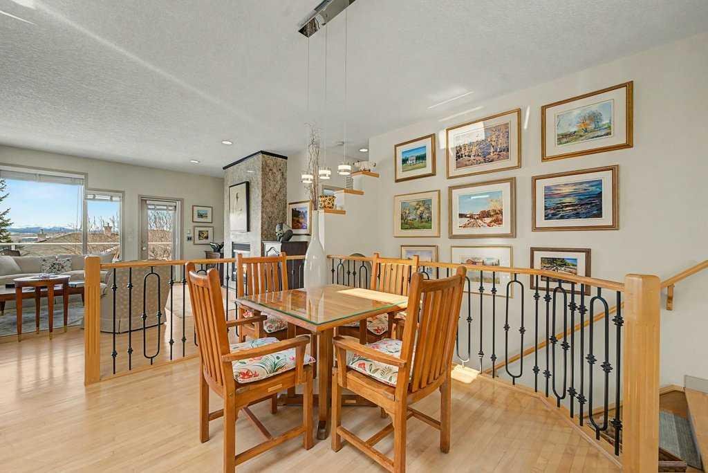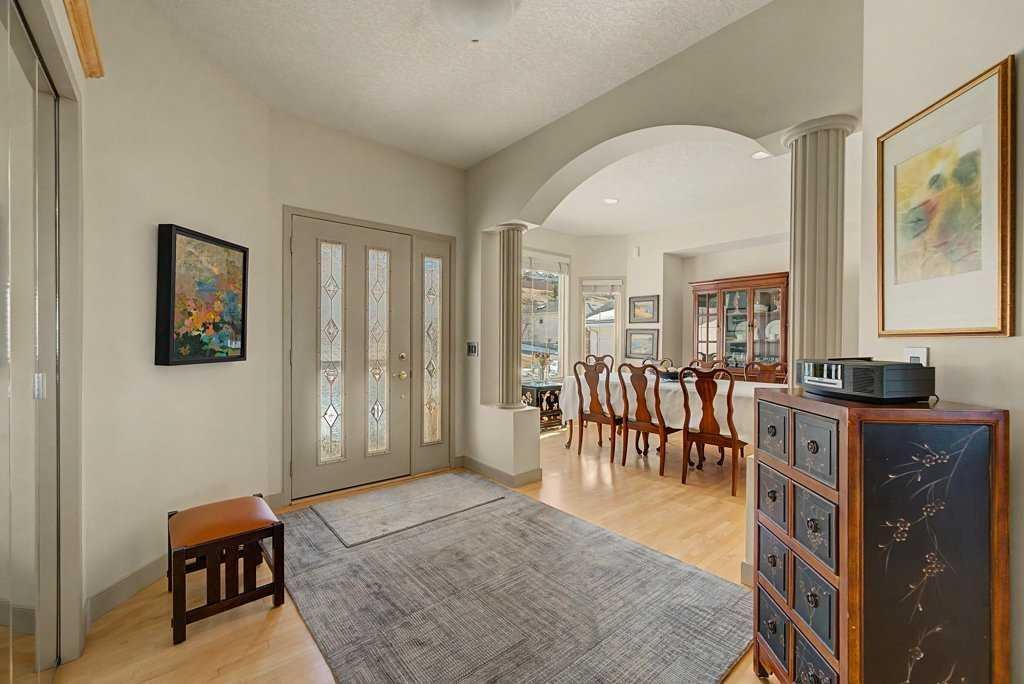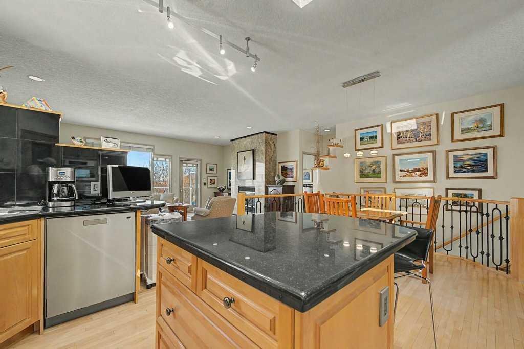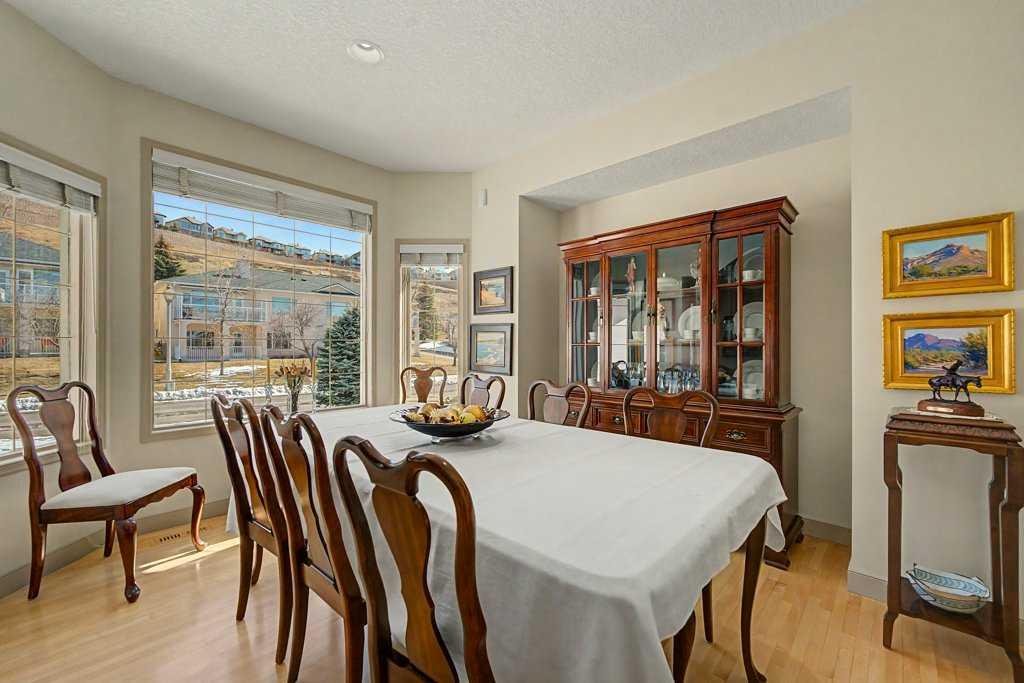 ABSOLUTELY GORGEOUS WALKOUT VILLA! ONE OF THE LARGEST FLOORPLANS! Is it time to throw away the snow shovel and the lawnmower? MORE FUN, LESS WORK! Do you love GOLF or TRAVELLING more than outside chores? How about a WALKOUT BUNGALOW VILLA with a FINISHED BASEMENT and GORGEOUS VIEWS, located very close to the ‘Links of Gleneagles’? Come see 18 Eagleview Gate! Impeccable from start to finish! PARK YOUR CAR(S) IN YOUR INSULATED DOUBLE GARAGE (with RADIANT HEATER)! From the garage, step into the clean and tidy ‘mudroom’ (which doubles as a laundry room with built-in cabinets and sink). Nice curb appeal with BAY WINDOW & BRICK DETAILING. At the front entry, your guests will be greeted by a decorative front door with matching sidelight! Plenty of room in the foyer to welcome a whole group at once! They’ll step in the door and say ‘Wow’! This villa is full of natural light, thanks to abundant windows! The home immediately feels elegant because the DINING ROOM is exactly that – an ELEGANT SPACE for all your special family gatherings! This villa is very well-appointed! EXTENSIVE HARDWOOD FLOORING and MANY UPGRADES and thoughtful touches! Find your way to the kitchen. You will love this KITCHEN WITH ADJOINING EATING AREA! The skylight gives the kitchen a view to the sunshine (or stars) above! Beautiful cabinetry! SOLID MAPLE DOORS (and even solid maple end panels)! BUILT-IN WINE RACK AND BUILT-IN APPLIANCES! No more reaching down to floor level to open the oven (or into cabinetry, thanks to plenty of pull-out storage in lower cabinets). Shiny STAINLESS-STEEL appliances (SUB-ZERO and MIELE) and shimmering STONE COUNTERTOPS! The microwave doubles as a second oven so you can COOK TURKEY AND HAM AT THE SAME TIME! After dinner, sit down with your guests in a LIVING ROOM WITH A VIEW (and a GREAT FIREPLACE)! THE ROCKY MOUNTAINS and the SUNSETS ARE SPECTACULAR! STAY COMFORTABLE any time of year with 2 GAS FIREPLACES, SLAB HEAT IN THE BASEMENT, AND CENTRAL AIR CONDITIONING! Step out to the back deck (with a gas line) for a summer BBQ and enjoy the sunny SW exposure! MAPLE & IRON railing will lead down to the lower WALKOUT LEVEL, where you will find another spacious bedroom, a hobby room (with countertop and plenty of upper storage cabinets), a full bathroom (with shower tile to the ceiling), and a rec room with a corner fireplace (brick-faced with matching maple mantle)! SLAB HEAT keeps the basement temperature very consistent and very comfortable on the feet! The lower patio is enclosed (by aluminum railing with glass inserts, and a little gate to take the puppy or the grandkids for a walk). Fantastic basement bar (with a maple-paneled SUB-ZERO bar fridge, more wine storage, and display cabinets)! At the end of a busy day, enjoy SOAKING IN YOUR SPA-LIKE ENSUITE BATHROOM! The ensuite shower is fully tiled, with high gauge glass. The AIR-JET TUB will soothe your achy muscles! Double sinks, and a walk-in closet. A perfect retirement villa!