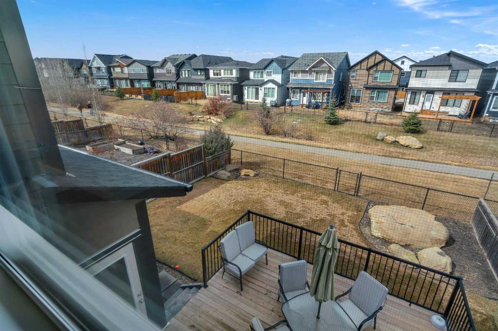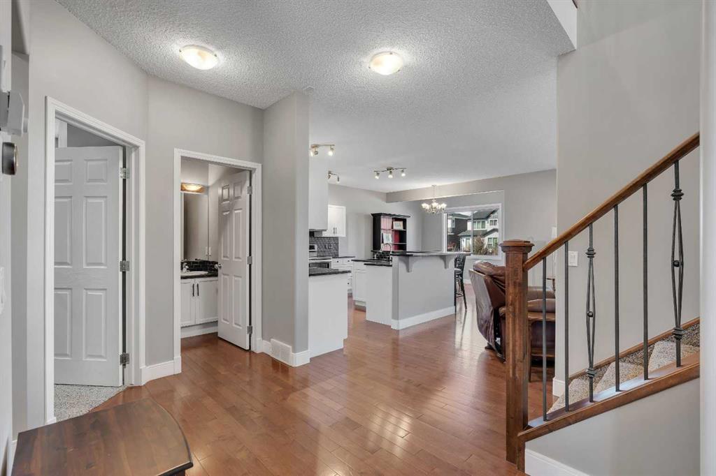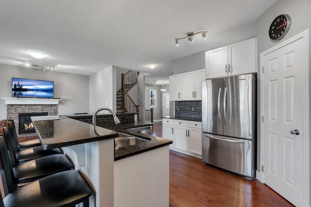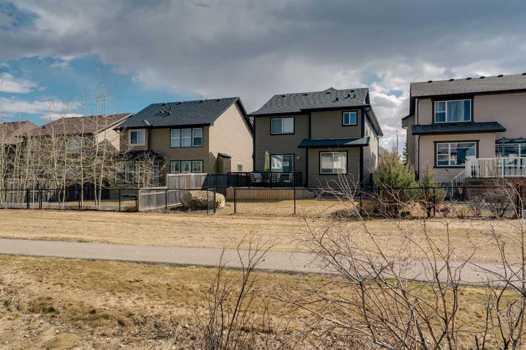Welcome to 18 Silverado Skies Drive SW. Backing directly onto a green space and a walking path with, this fully updated Silverado home offers over 2,300 sq ft of developed living space with 4 bedrooms, a main floor office, and 3.5 bathrooms. The main floor is built for both everyday living and entertaining, featuring an open-concept layout with durable hardwood flooring throughout and a cozy gas fireplace anchoring the living room. The kitchen has been tastefully refreshed with crisp white cabinetry, modern black hardware, granite countertops, a central island with eating bar, corner pantry, and stainless steel appliances including a dual oven. A dedicated main floor office and laundry add function without sacrificing space. Upstairs, the vaulted bonus room creates an impressive second living area filled with natural light. The primary suite is spacious and well-designed, featuring a walk-in closet with added custom shelving and a 5-piece ensuite complete with dual sinks, a corner soaker tub, separate shower, and a private water closet. Two additional bedrooms and a full 4-piece bath and laundry room complete the upper level that has recently upgraded luxury vinyl plank flooring throughout. The fully developed basement (2020) expands your living space with a dry bar, electric fireplace, custom built-ins, a large bedroom with legal egress window, and a smart pass-through bathroom with heated floors. This home has seen major exterior and mechanical upgrades, including Hardie siding (2021), all new windows, and a hot water tank (2020). Out back, enjoy an expanded deck overlooking uninterrupted green space and direct access to walking paths. Finished with a double attached garage and located close to schools, parks, and shopping.