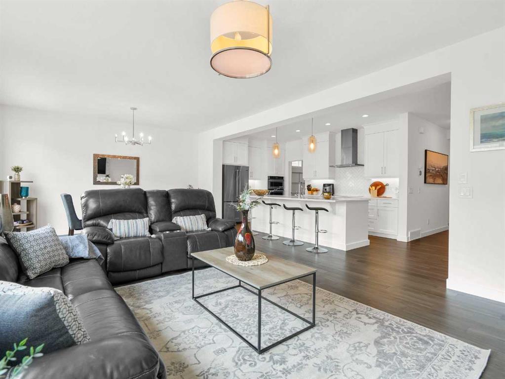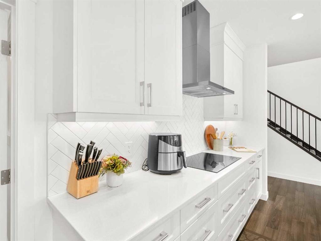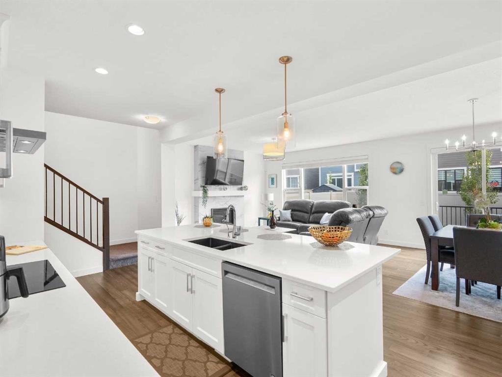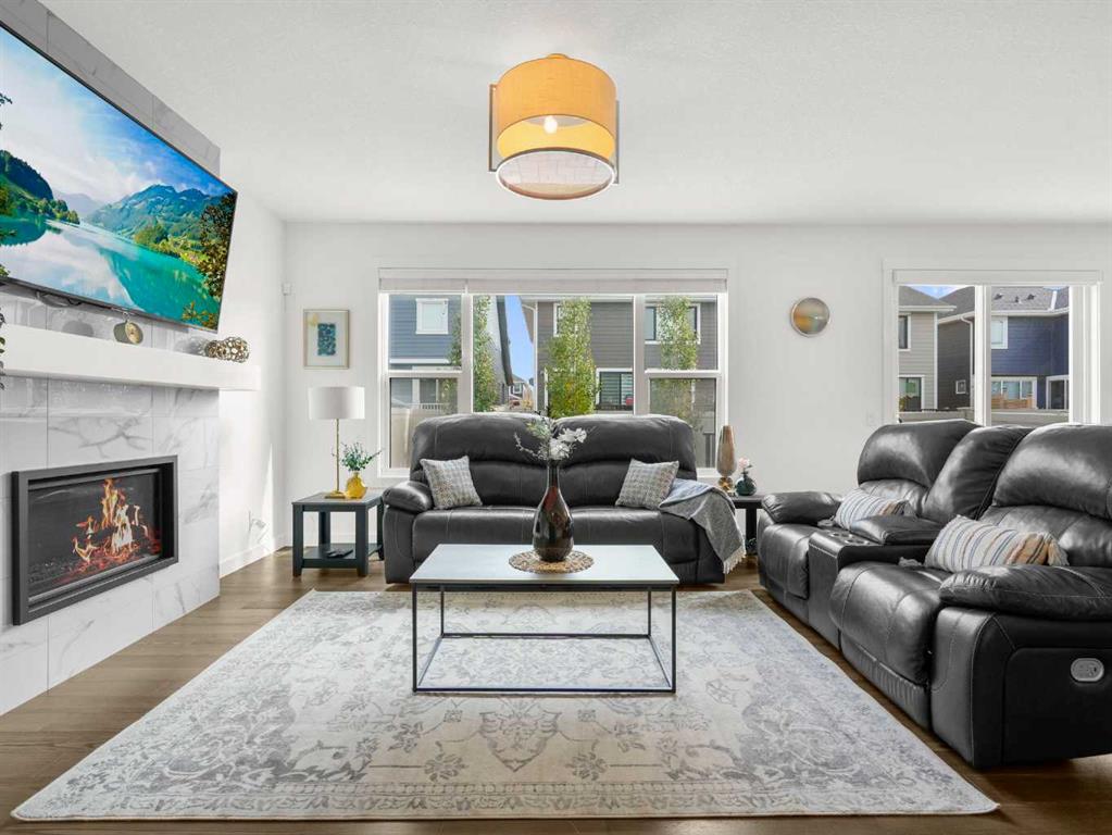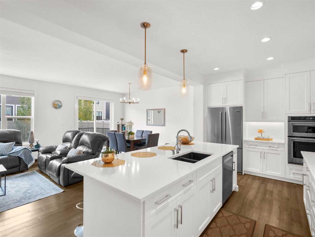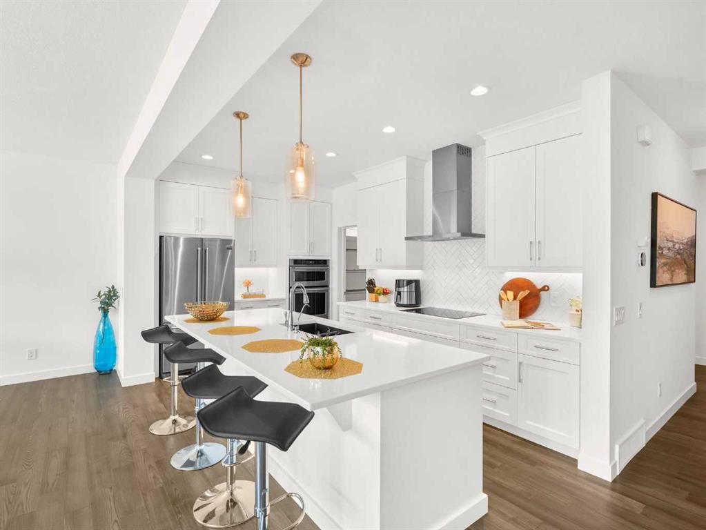 Premiere Video Tour available. Exceptional Value in Sought-After West Springs! This stunning, fully finished detached 2-storey home offers over 2,900 sq ft of thoughtfully designed living space. Located on a quiet cul-de-sac, it features a double attached garage and an additional 2-car driveway, complemented by exceptional curb appeal—from the inviting covered front porch to the refined interior layout with a vinyl deck and concrete patio. Step into the elegant foyer and flow into the expansive great room, anchored by a gas fireplace with floor-to-ceiling tile and a classic mantle—perfect for cozy evenings or entertaining guests. The chef’s gourmet kitchen is a standout, showcasing a walk-through pantry, island with eating bar, and abundant storage and prep space. It seamlessly connects to a bright dining area with direct access to the back patio, making indoor-outdoor living a breeze. A dedicated office, mudroom, and convenient half-bath complete the main floor. Upstairs, retreat to the luxurious executive primary suite, complete with a spa-inspired ensuite featuring a stand-alone soaker tub, elegant walk-in shower, upgraded double vanity, and a generous walk-in closet with upgraded shelving. Three additional bedrooms with upgraded shelving and a stylish full bathroom with double vanity provide comfort and space for a growing family. The 9 feet fully finished basement offers even more room to relax and play, with broad staircases, two spacious bedrooms, a full bathroom, and a large recreation room ideal for movies, games, or a home gym. Located in West Springs, this home is close to top-rated public and private schools including ST. JOAN OF ARC School, scenic parks, boutique shopping, and every amenity your family needs. Don’t miss your chance to own this incredible home—contact us today to schedule a private showing. It won’t last long! Here are extra bonuses: Kinetico Water Filtration Systems, Extended Garage width and Titanium Shelving upgrade throughout