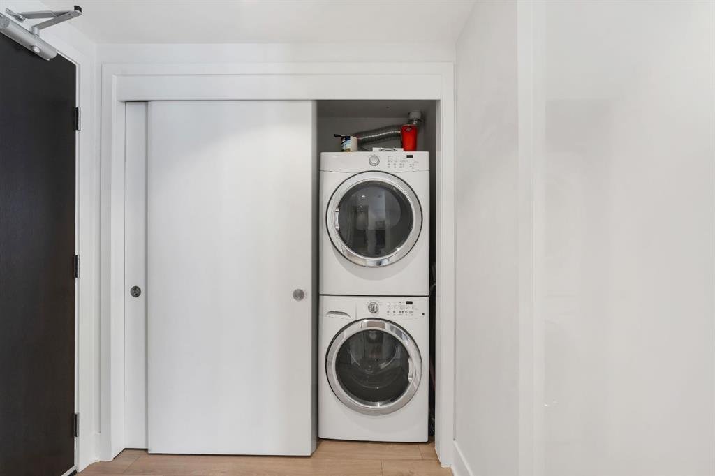 The open-concept living area is designed to be enjoyed throughout the day, with ever-changing light creating a warm and dynamic atmosphere. Step out onto the southeast-facing balcony to take in the city skyline—perfect for summer evenings and morning coffee alike. Additional features include in-suite laundry, central air conditioning, custom blinds, one titled heated underground parking stall, and an assigned storage locker.