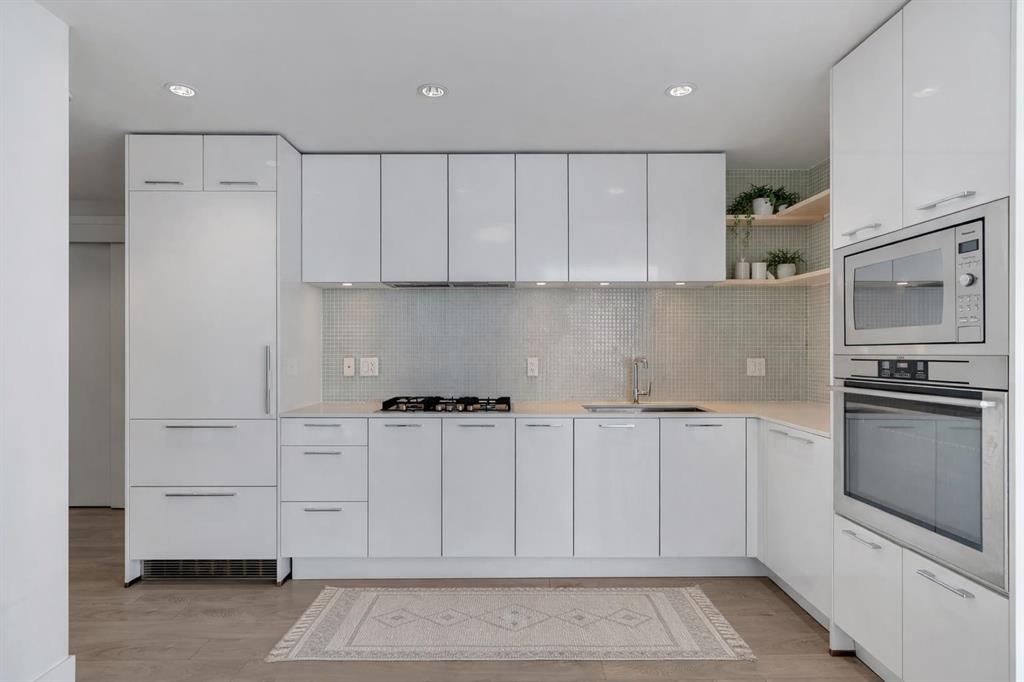 Thoughtfully designed for both functionality and privacy, the ideal layout places the two bedrooms on opposite sides of the sun-drenched living area. At the center of the home, a sleek contemporary kitchen anchors the space, complete with a gas cooktop, built-in wall oven, and fully panelled refrigerator and dishwasher for a seamless, modern aesthetic.