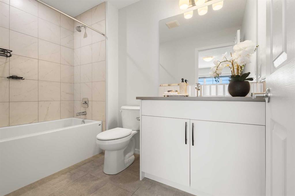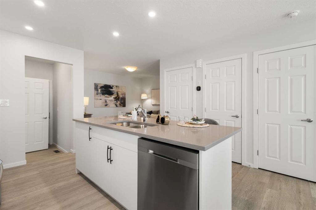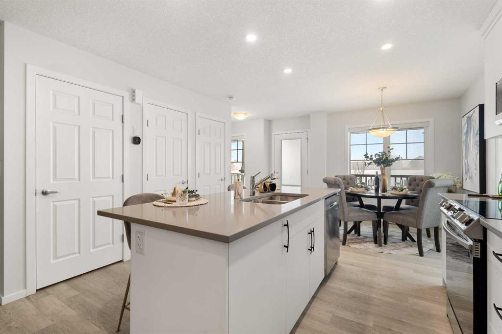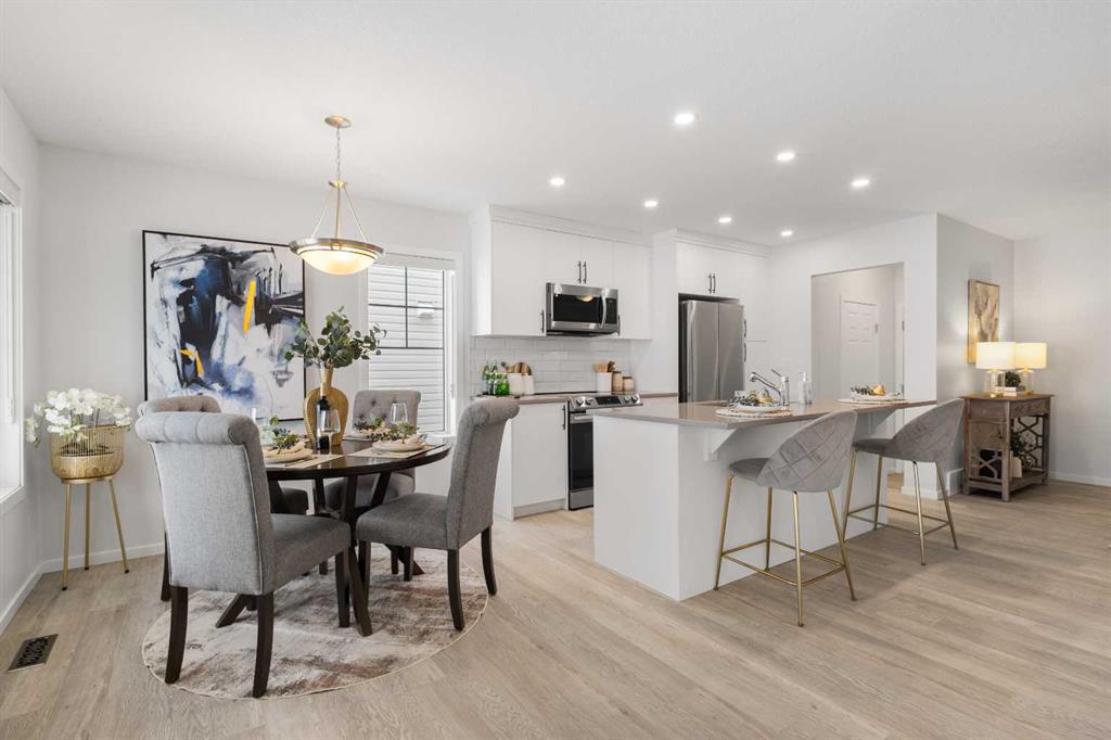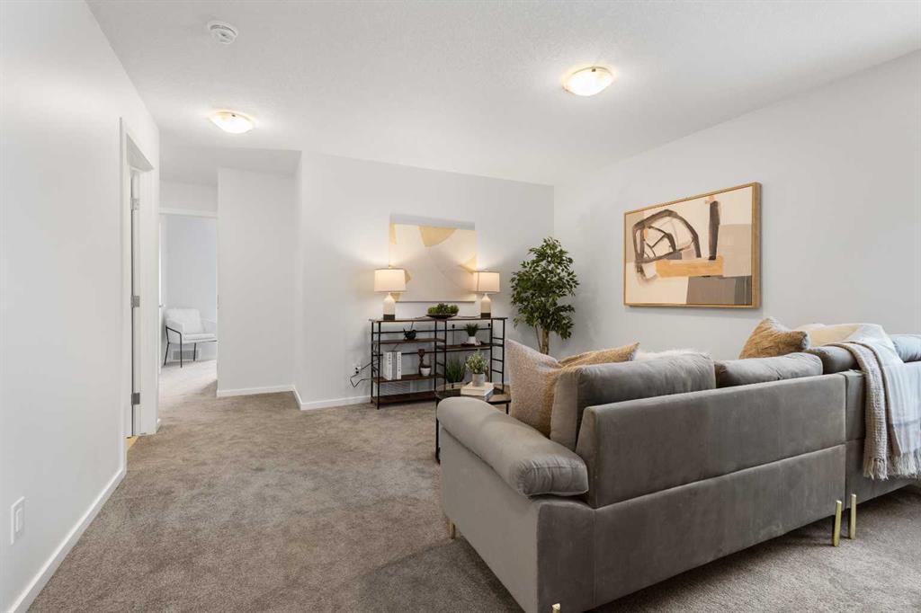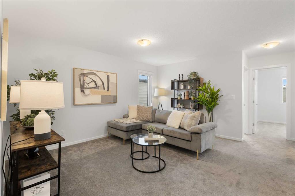 Welcome to modern luxury in the heart of Carrington! This stunning Ripley End model by Mattamy Homes offers a premium living experience as a bright end-unit, boasting a total of 1,512.83 sq. ft. of above-grade exterior living space. The open-concept main floor (545.74 sq. ft.) features a gourmet kitchen with upgraded Uptown Grey Quartz countertops, full-height cabinetry, and a high-end Samsung stainless steel appliance package. The living and dining areas are finished with Level 2 Rigidwood Spinnaker LVP flooring, creating a seamless and elegant flow. Upstairs, you will find a spacious 967.09 sq. ft. retreat. The Primary suite (194 sq. ft.) includes a private 4pc ensuite , complemented by a generous Family Room (192 sq. ft.) and two additional well-appointed bedrooms. For ultimate convenience, the laundry is located on the upper level. This tech-forward home is future-ready with pre-installed EV charging and Solar conduit rough-ins. The unfinished basement (489.62 sq. ft.) offers professional 3-piece plumbing rough-ins. Parking is a breeze with the 378 sq. ft. double attached garage. Location is everything! Situated directly across from a future school site and within walking distance to Carrington’s commercial plazas and parks. Quick access to Stoney Trail makes commuting easy. Don’t miss this turn-key opportunity to own an upgraded, modern gem in NW Calgary!