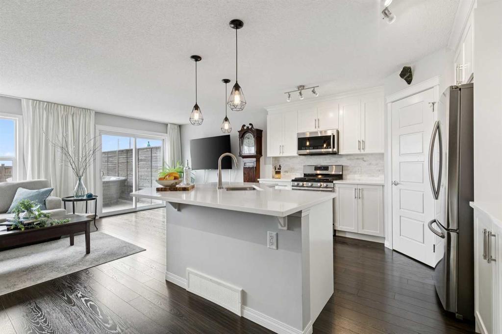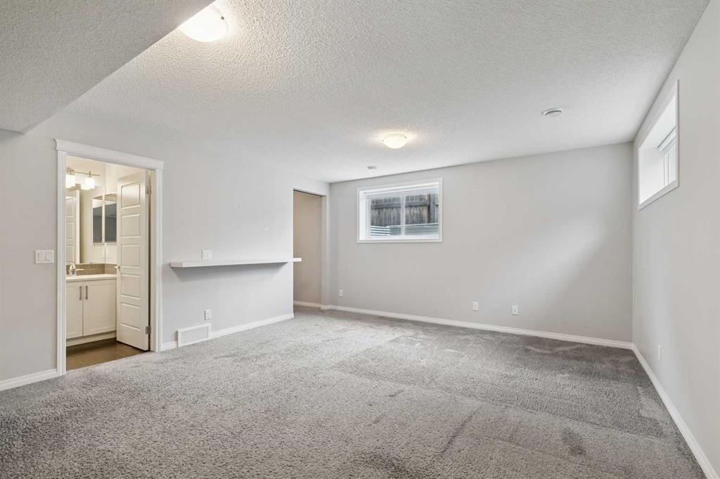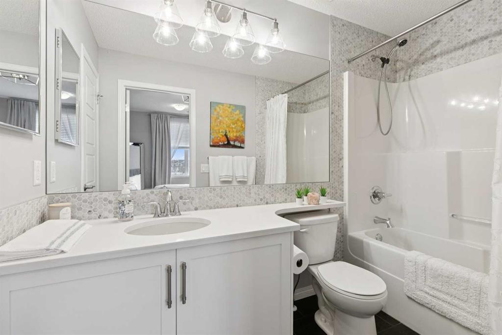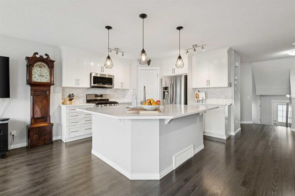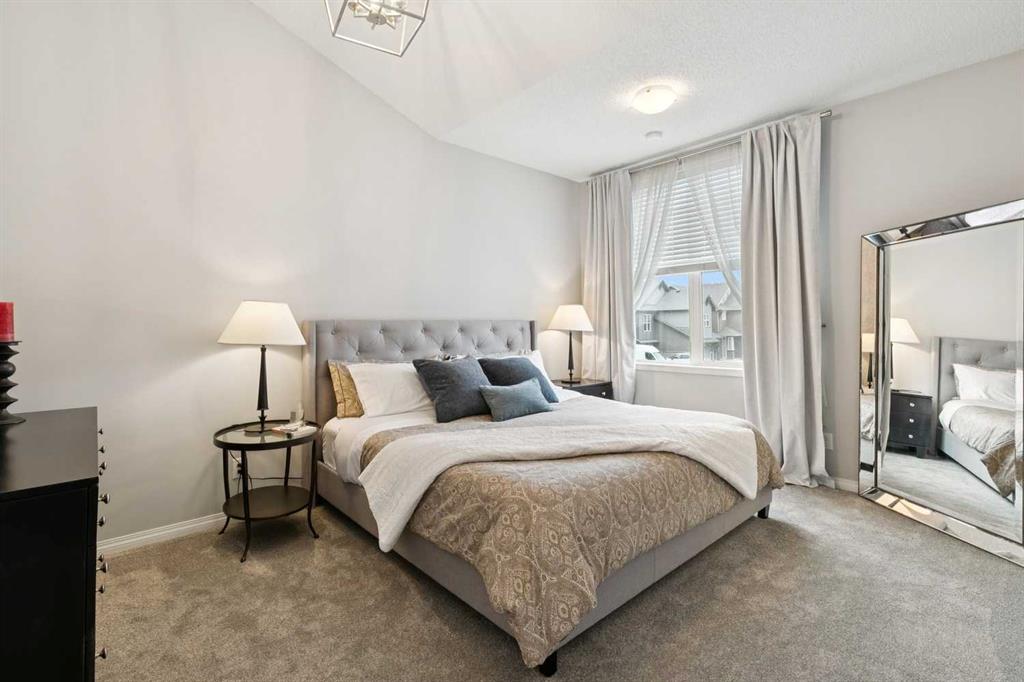 Huge pie lot on a cul-de-sac, backing onto a greenspace, in a lake community, mountain and city views, and air conditioning…..When I say it is all here I am not kidding!!! This home was built by Brookfield and features vinyl plank flooring, upgraded carpet, quartz countertop throughout including the upper level laundry room, and matching tile in the front entry, laundry room and all the bathrooms. The main level offers a living room that is very bright and ideal for the young family. There is a good size dining area for hosting the holidays. The kitchen offers a large pantry, huge island with breakfast bar, stainless steel appliances, gas stove, quartz countertops, feature backsplash and sliding doors to the 20×20 cedar deck for the bbq season. There is a nice size bonus room up by the 2 spare bedrooms that could be used as a children’s play area, tv room or workout area. Basement has a family room and a full bathroom. There is an egress window allowing this area to also be used as a teenager bedroom with ensuite. Primary bedroom offers vaulted ceilings, walk-in closet with custom organizer and a 4pc bathroom with linen closet. Two spare bedrooms are a great size with views of downtown and the greenspace. One of them has a large walk in closet. Fully fenced pie shaped backyard has had $20,000 worth of landscaping done and the 20×20 cedar deck has aluminum railing for no maintenance. Backing onto a huge off leash dog park with ponds to add to your enjoyment. Full lake access and a short drive or walk to the shopping areas.