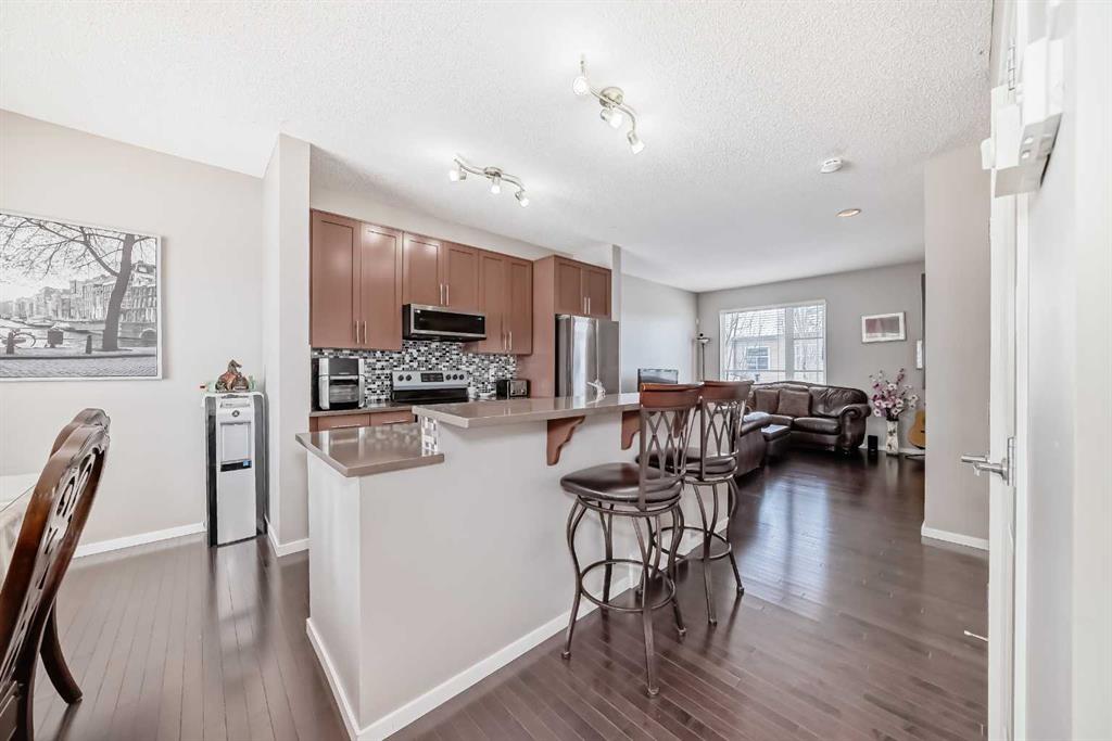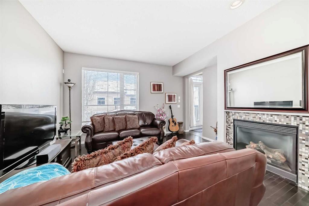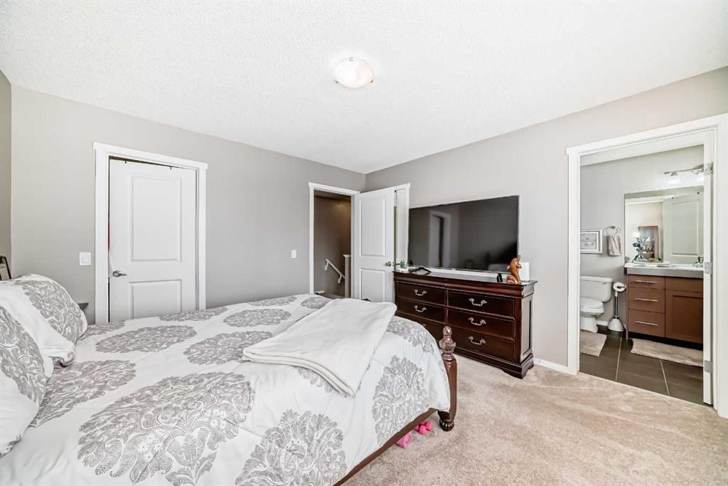 WELCOME TO THIS REALLY NICE TOWNHOUSE IN THE COVETED AREA OF CHAPARRAL. TWO PRIMARY BEDROOMS WITH ENSUITES, DBL GARGE ( RARE) FRONT PATIO AND BALCONY, FINISHED PARTIAL BASEMENT, AND MANY UPGRADES. This beautiful townhome features an open-concept, sleek design and finishes, with a modern look. Walking in, you will appreciate the hardwood flooring and big windows that let natural light stream in, along with newer blinds. The kitchen has SS appliances featuring a large double-door refrigerator with water, Quartz counters and a large Island that seats 4. The living room has a cozy gas fireplace for you to warm up to on those cold winter evenings. There’s a mudroom-type area that leads to a door onto the balcony. Completing this floor is a 2-piece bathroom. Upstairs, YOU’LL NOTICE THE NEWER CARPET (2023), and the rare 2 bdrms, both with en-suites and walk-in closets. The laundry room is also on the upper floor for convenience. This is ideal for extended families or roommates. Downstairs is a partially finished basement with a flex space and roughed-in for a bathroom. What sets this property apart from the others is the double garage, as most in this complex only have a single garage. Also, you will love the front patio with a gas BBQ hookup. Low condo fees, $412 a month. Theres plenty of storage and off-street parking, close proximity to shopping, restaurants, schools, public transportation and of course the all season lake which offers all types of outdoor activities, and recreation facilities. Don’t miss this chance to own a fabulous new home.