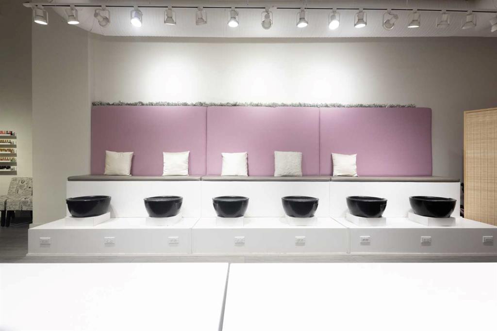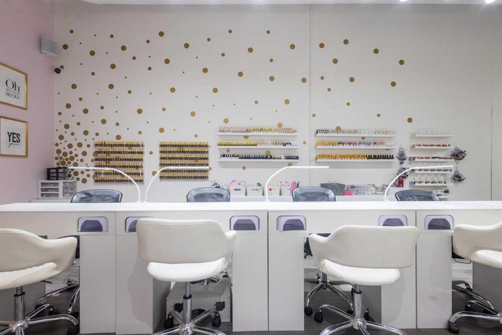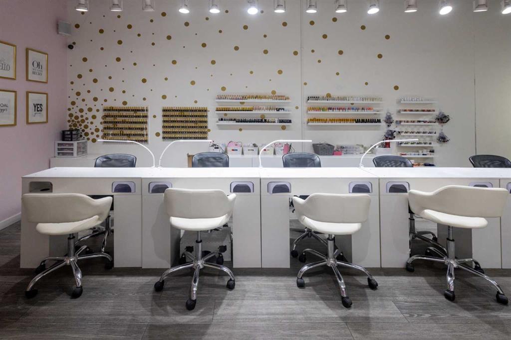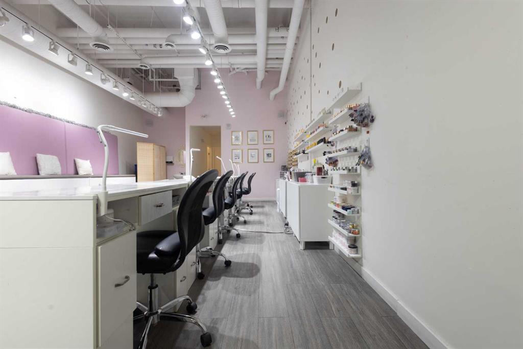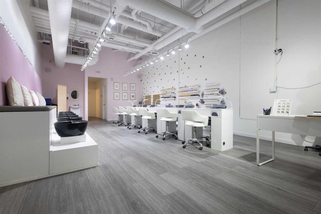 The main floor commercial space with high traffic adjoining businesses benifits this salon which features 6 professional manicure stations along a sleek top bench with individual LED lamps and UV nail dryers, plus a dedicated pedicure spa row with 6 luxury black basin stations set against gorgeous pink upholstered seating — creating an elevated, worthy client experience that drives repeat business and referrals.