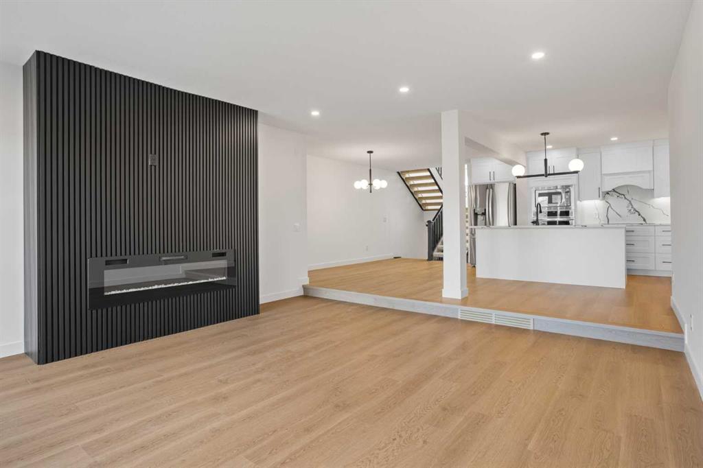 The bright and open main living level features a spacious kitchen with a large island, seamlessly flowing into the dining and living areas — anchored by a sleek electric fireplace and access to a generous private patio. Upstairs, a dedicated bedroom level offers a well-sized bedroom, full 3-piece bath, and its own private balcony.