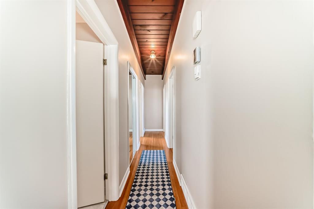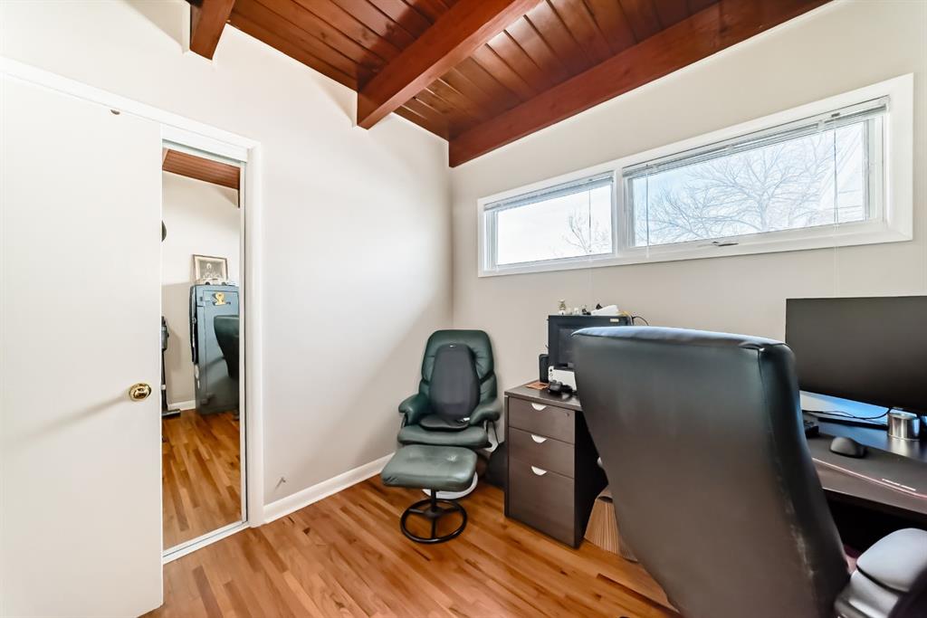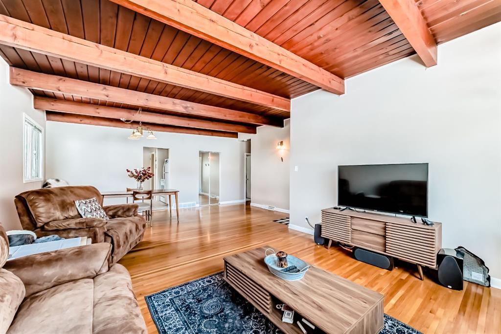 Welcome to this exceptional mid-century modern bungalow, perfectly positioned across from a park and green space. Showcasing timeless design, this home features stunning cedar plank ceilings with exposed beams and original hardwood flooring throughout the main level, creating warmth and architectural interest rarely found. Offering 4 bedrooms, a den, and 3 full bathrooms, the layout is both spacious and functional. The bright living and dining areas flow seamlessly, while the character-filled kitchen offers great potential and includes a charming eating nook. The primary bedroom is generously sized with large windows and a private 3-piece ensuite, complemented by two additional bedrooms and a full bathroom on the main floor—all bedrooms are bright, sun-filled spaces with oversized windows. The fully developed lower level features a separate entrance, a large family and recreation space, an additional bedroom, and a second room currently used as a bedroom (window does not meet egress requirements), plus a full bathroom and extensive storage. The large fenced yard, front patio for outdoor entertaining, and double detached garage complete this unique property. A rare opportunity to own a home with this much character in an unbeatable location