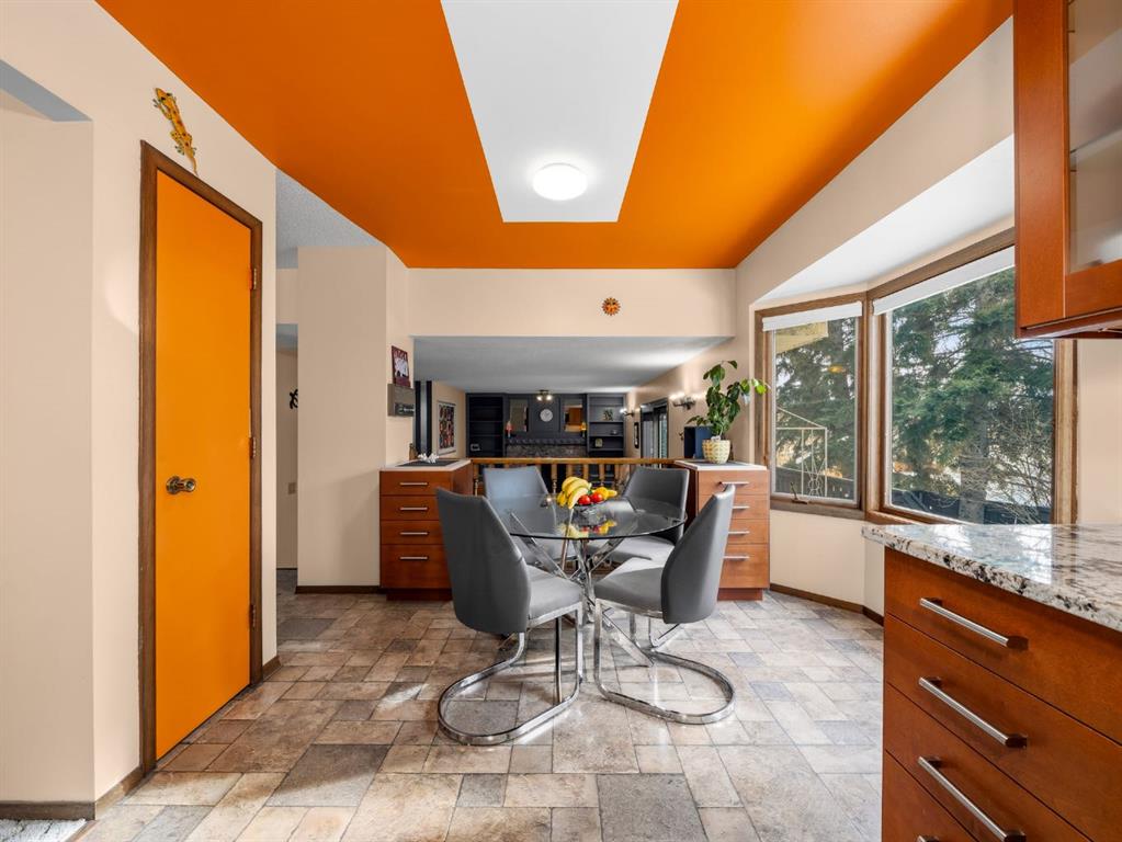 Perfectly situated across from a peaceful park, this Scenic Acres home offers the rare combination of a prime, quiet location and a thoughtfully designed floor plan. Sunlight pours through the bay windows into the main floor, highlighting the inviting living room and spacious formal dining area. The kitchen features updated cabinets, quality stainless steel appliances, granite countertops and a sunny breakfast nook with a bay window overlooking the private, treed backyard. In the adjoining family room, a cozy wood-burning fireplace creates an inviting atmosphere, while an upgraded sliding door leads directly to the outdoor space, creating a seamless indoor-outdoor flow.