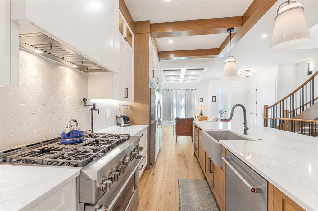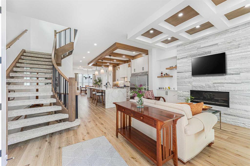 Welcome to this beautifully designed home on a quiet street in the sought after community of Killarney. Offering over 2,800 sq. ft. of luxurious living space, this air-conditioned 4 bedroom, 3.5 bathroom residence showcases exceptional craftsmanship and timeless style. The bright main floor features coffered ceilings, rich hardwood floors, a dramatic curved staircase, and a custom stone fireplace. The chef-inspired kitchen is equipped with full height cabinetry, quartz countertops, premium stainless steel appliances including a commercial-style gas range, a built-in coffee maker, farmhouse sink, and an impressive 12-foot island. The dining area offers seamless access to a landscaped backyard with deck and patio perfect for entertaining.