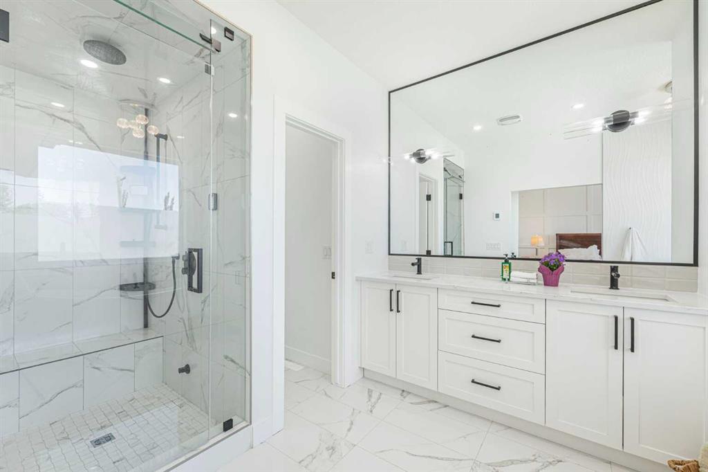 Upstairs, the primary suite offers a walk-in closet and a spa like 5-piece ensuite with heated floors, soaker tub, steam shower, and dual vanities. Two additional bedrooms, a full bath, and convenient laundry complete the level. The fully finished basement features in-floor heating, a spacious family room with wet bar, fourth bedroom, and another full bathroom.