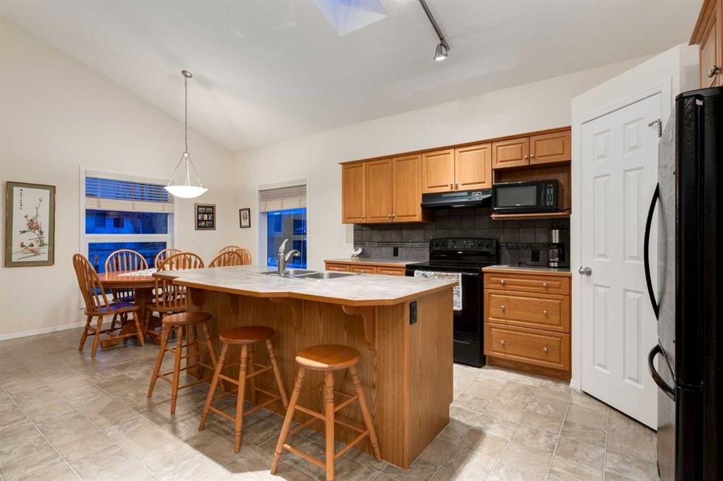The SPACIOUS KITCHEN features a LARGE ISLAND w/seating for casual meals, a CORNER PANTRY, TILED BACKSPLASH, AMPLE CABINETRY + 2 SKYLIGHTS that enhance the room’s brightness. The ADJACENT DINING AREA is perfect for family gatherings + provides access to the UPPER DECK, ideal for outdoor dining or summer barbecues. The PRIMARY SUITE includes a WALK-IN CLOSET + a 4-PC ENSUITE, while the 2nd GOOD-SIZED BEDROOM sits next to a convenient 2-PC POWDER ROOM for guests.