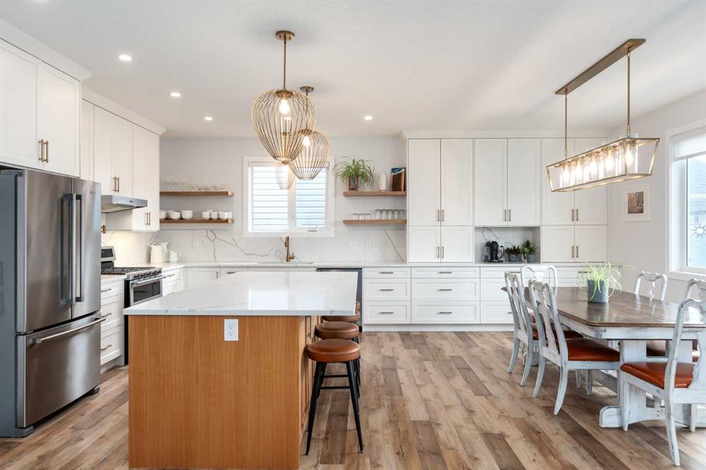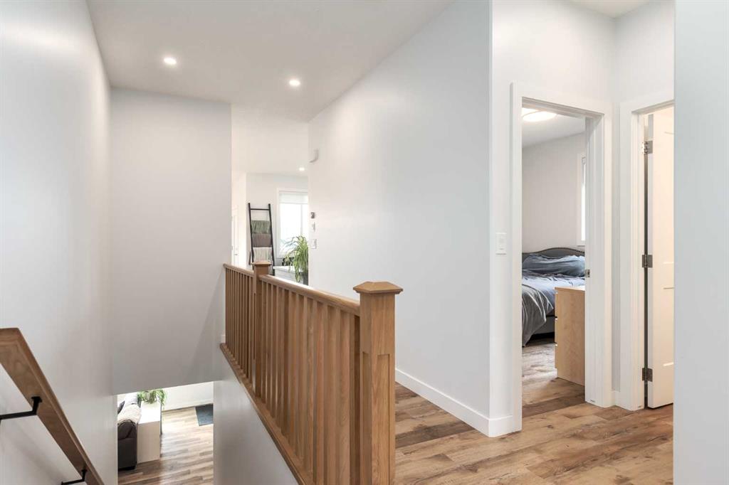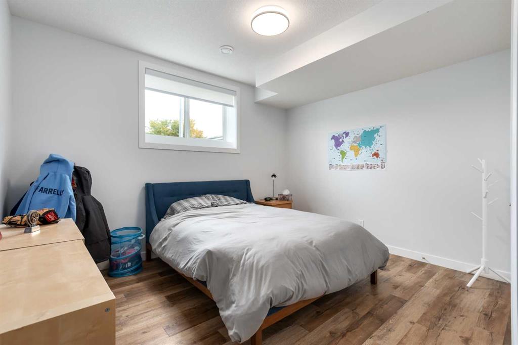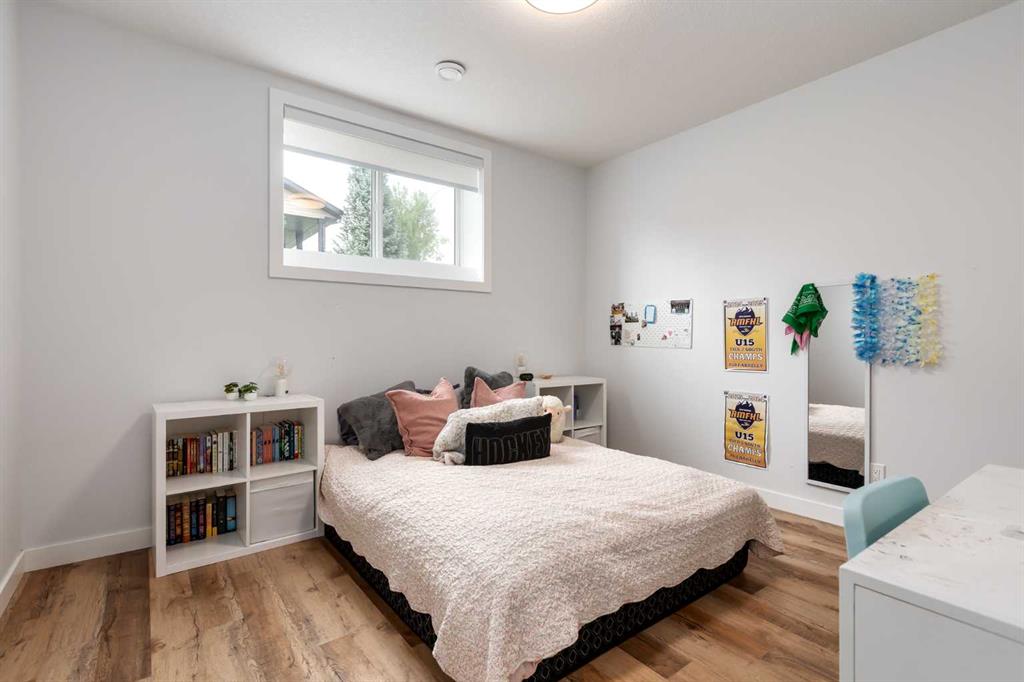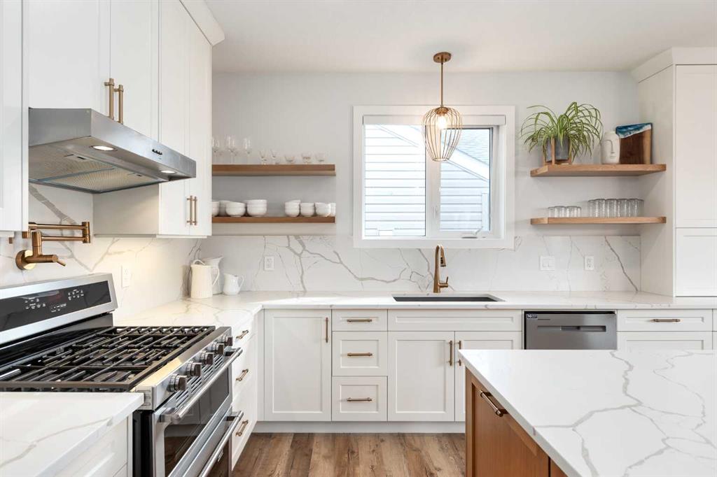 Five bedroom, 1400 sq ft high quality bungalow designed for a family. This home has an exceptional kitchen with beautiful high-end finishes, quartz counters and backsplash, large island, and an over-the-stove pot tap. The home is flooded with natural light and the dining room opens onto a private, covered upper deck. This level also has two bedrooms, including the spacious primary bedroom with a 5-piece ensuite and walk-in closet. Also on the main floor are the living room with cozy gas fireplace, 4-piece bathroom and a laundry room with built in cabinets. In the fully finished walk-out are 3 more bedrooms, 3-piece bathroom, and a 22′ x 17’ family room. The yard has a large patio, is fully fenced, private, low maintenance, and has alley access. There is an oversized 32’ x 24’ garage that is insulated, painted, and has excellent lighting. Extras in this home include in-floor heating, central air conditioning, high efficiency boiler, and a water softener. Please click the multimedia tab for an interactive virtual 3D tour and floor plans.