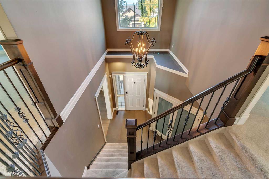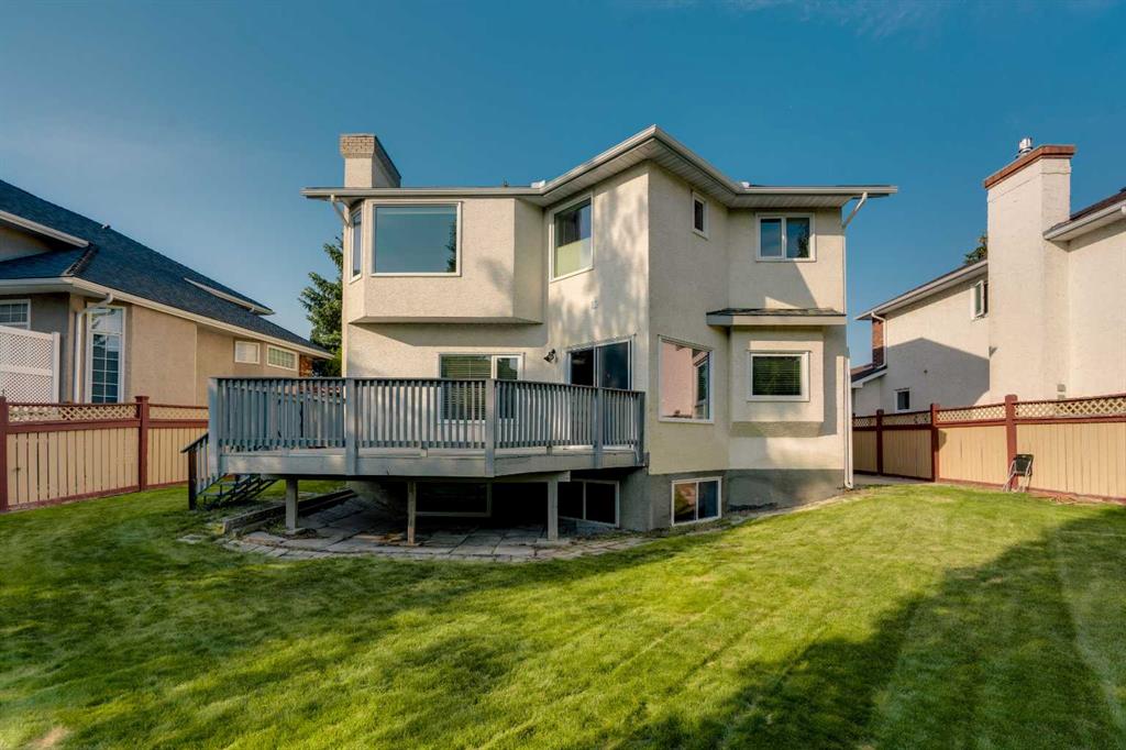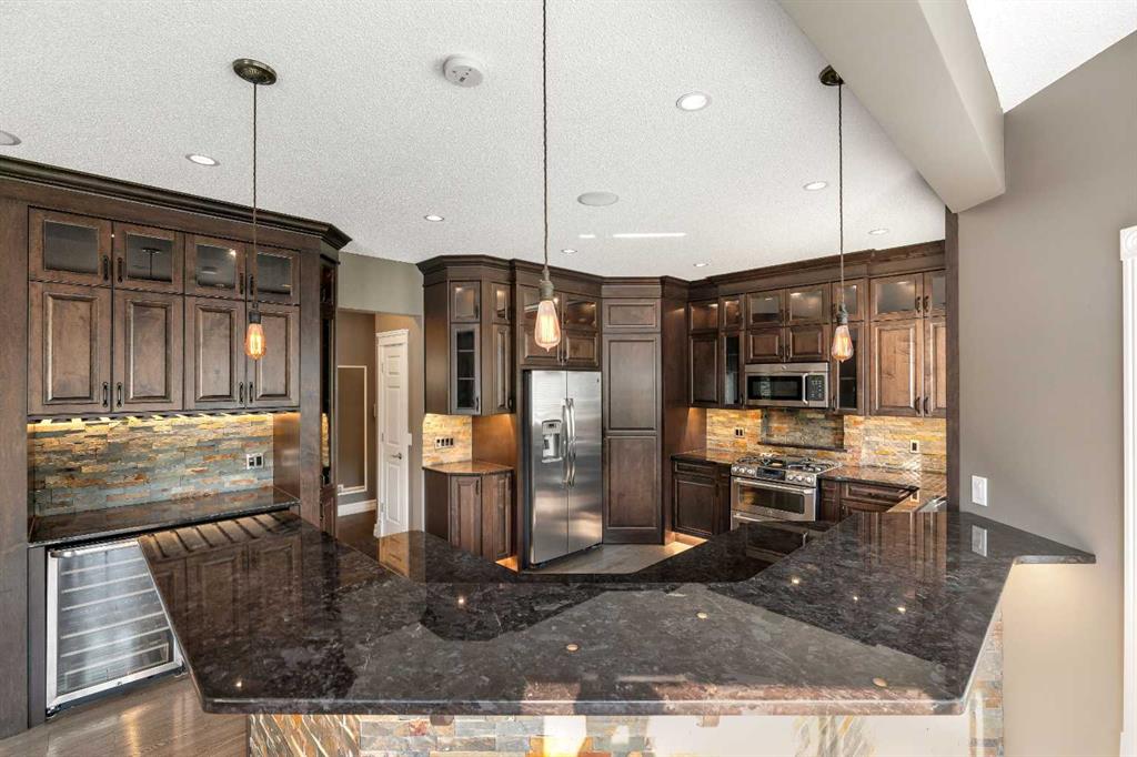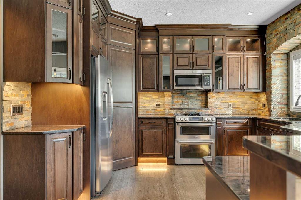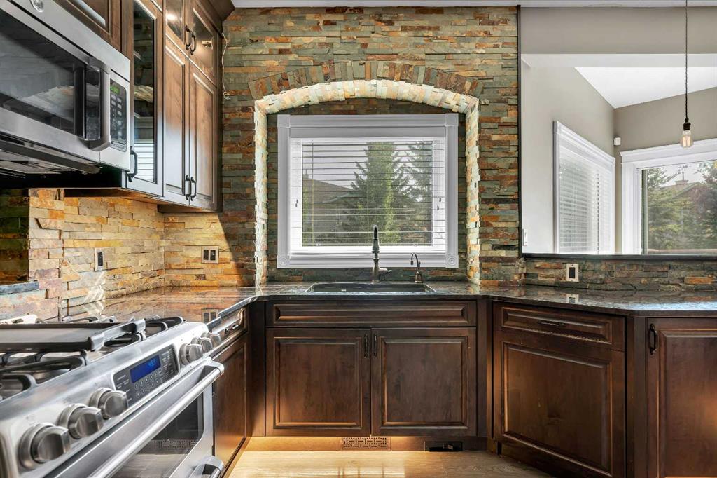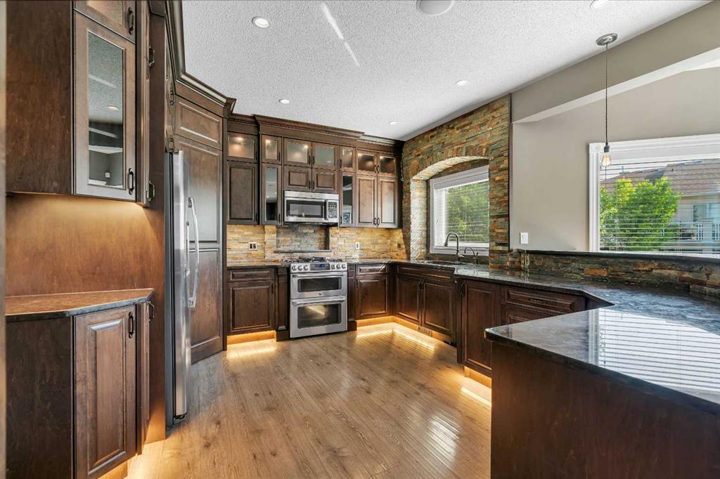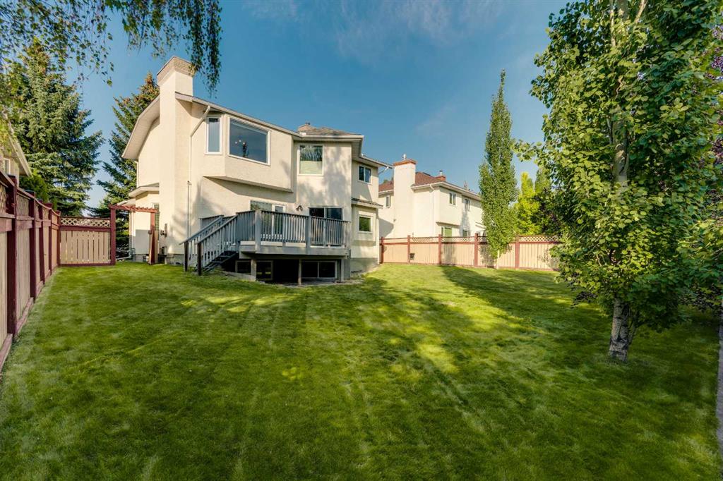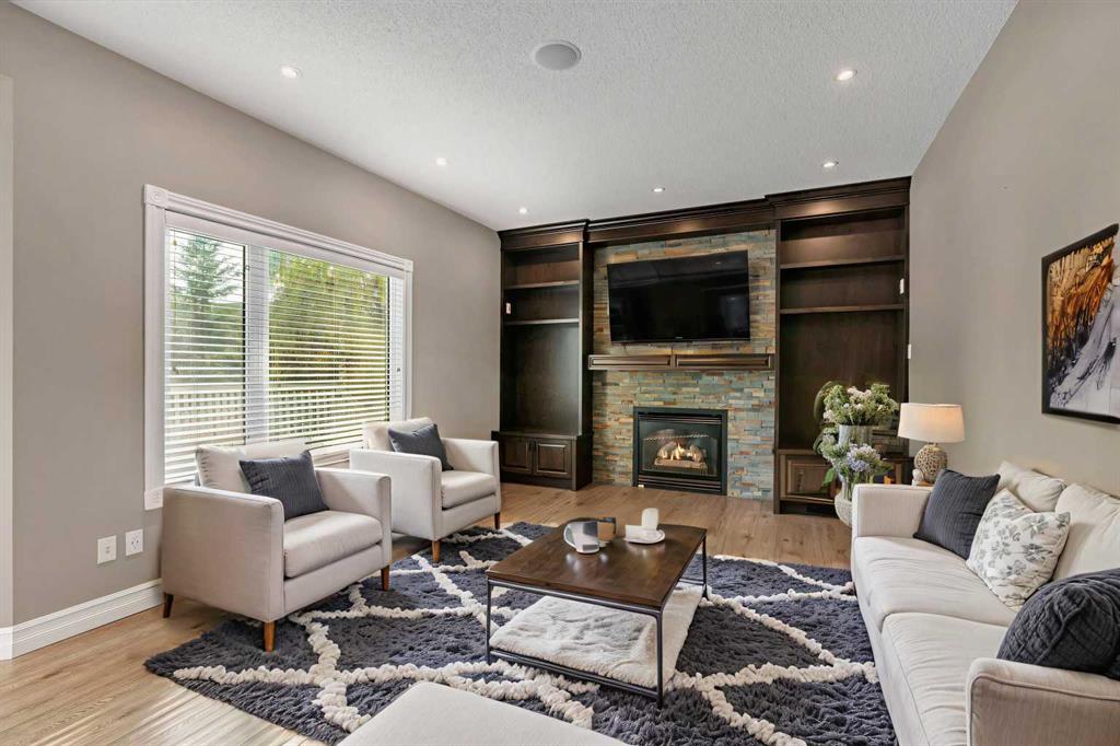 Welcome to this beautifully appointed estate home in the sought-after community of Christie Park. With 4+1 bedrooms, 3.5 bathrooms, and a fully finished basement, this property combines timeless design with generous living spaces, offering the perfect balance of elegance and everyday comfort. A tiled foyer sets the tone as you step inside, leading into the spacious formal living and dining room. Here, hardwood floors, crown moulding, and classic detailing create a refined setting for entertaining or hosting family gatherings. Beyond this space, the home opens into the heart of the main floor—the kitchen and family room. The kitchen impresses with rich, dark cabinetry, granite counters, full-height cabinets, under-cabinet lighting, stainless steel appliances, a corner pantry, and a striking stone feature wall. A sunny breakfast nook offers everyday dining with direct access to the large deck, where you can enjoy views of the south-facing backyard. The adjoining family room exudes warmth, with its floor-to-ceiling stone fireplace flanked by custom built-ins. A convenient 2-piece powder room completes the main level. Upstairs, you’ll find four generous bedrooms, including the expansive primary retreat. This luxurious suite features a walk-in closet and a spa-inspired ensuite with glass shower and soaker tub. A second 4-piece bath and upper-level laundry add to the thoughtful design. The fully finished basement offers an abundance of additional living space, with a sprawling recreation room anchored by a second fireplace, a fifth bedroom, a 3-piece bath, and plenty of storage. The exterior is just as inviting, with an oversized back yard highlighted by mature trees, an immaculate lawn, and a sense of privacy. Additional features include central A/C, elegant iron railings, and the rich tones throughout the home that contribute to its luxurious feel. Christie Park is one of SW Calgary’s most desirable communities, known for its quiet streets, parks, and pathways. Multiple schools are nearby, and you’ll enjoy quick access to Sarcee Trail, Westhills Shopping Centre, and Stoney Trail for easy commuting. This home is a true blend of sophistication, comfort, and convenience—perfect for families seeking an established neighborhood with estate-level living.