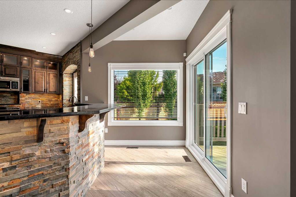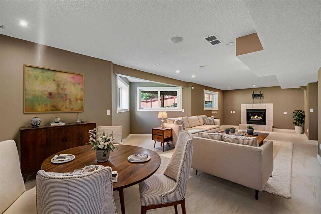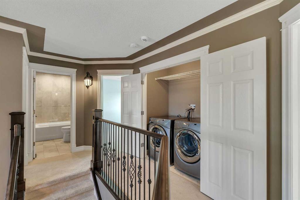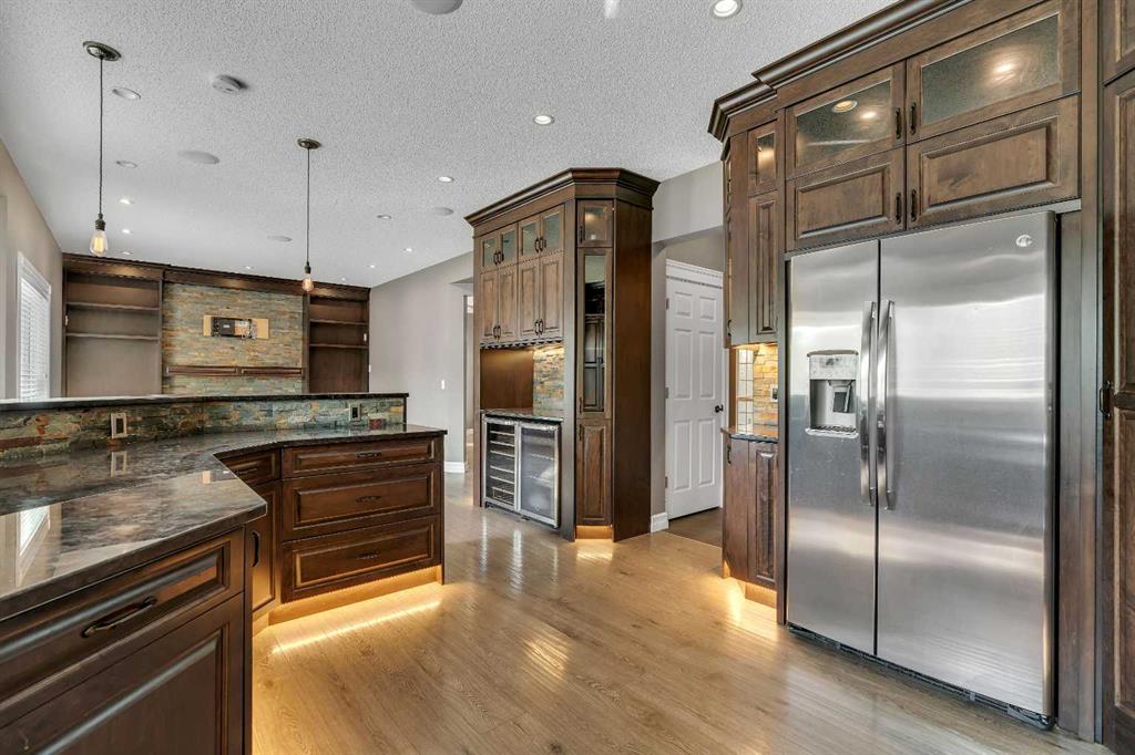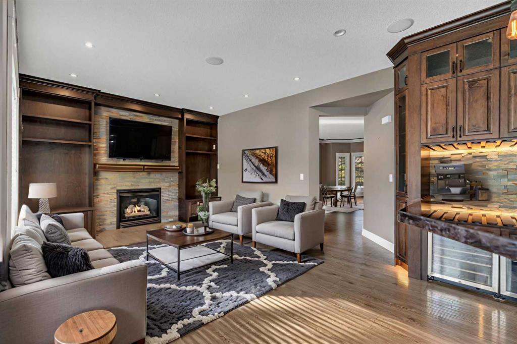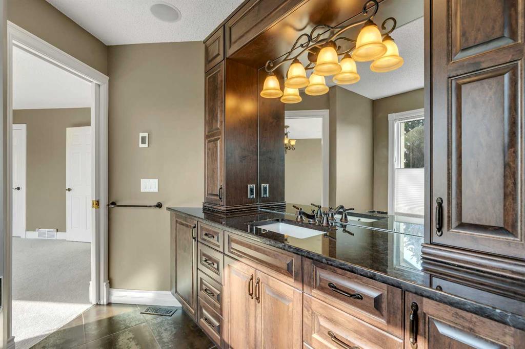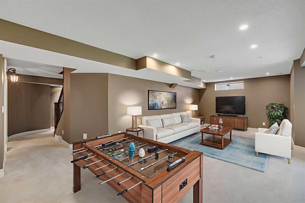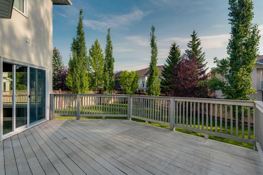 Welcome to this beautifully appointed estate home in the sought-after community of Christie Park. With 4+1 bedrooms, 3.5 bathrooms, and a fully finished basement, this property combines timeless design with generous living spaces, offering the perfect balance of elegance and everyday comfort. A tiled foyer sets the tone as you step inside, leading into the spacious formal living and dining room. Here, hardwood floors, crown moulding, and classic detailing create a refined setting for entertaining or hosting family gatherings. Beyond this space, the home opens into the heart of the main floor—the kitchen and family room. The kitchen impresses with rich, dark cabinetry, granite counters, full-height cabinets, under-cabinet lighting, stainless steel appliances, a corner pantry, and a striking stone feature wall. A sunny breakfast nook offers everyday dining with direct access to the large deck, where you can enjoy views of the south-facing backyard. The adjoining family room exudes warmth, with its floor-to-ceiling stone fireplace flanked by custom built-ins. A convenient 2-piece powder room completes the main level. Upstairs, you’ll find four generous bedrooms, including the expansive primary retreat. This luxurious suite features a walk-in closet and a spa-inspired ensuite with glass shower and soaker tub. A second 4-piece bath and upper-level laundry add to the thoughtful design. The fully finished basement offers an abundance of additional living space, with a sprawling recreation room anchored by a second fireplace, a fifth bedroom, a 3-piece bath, and plenty of storage. The exterior is just as inviting, with an oversized back yard highlighted by mature trees, an immaculate lawn, and a sense of privacy. Additional features include central A/C, elegant iron railings, and the rich tones throughout the home that contribute to its luxurious feel. Christie Park is one of SW Calgary’s most desirable communities, known for its quiet streets, parks, and pathways. Multiple schools are nearby, and you’ll enjoy quick access to Sarcee Trail, Westhills Shopping Centre, and Stoney Trail for easy commuting. This home is a true blend of sophistication, comfort, and convenience—perfect for families seeking an established neighborhood with estate-level living.