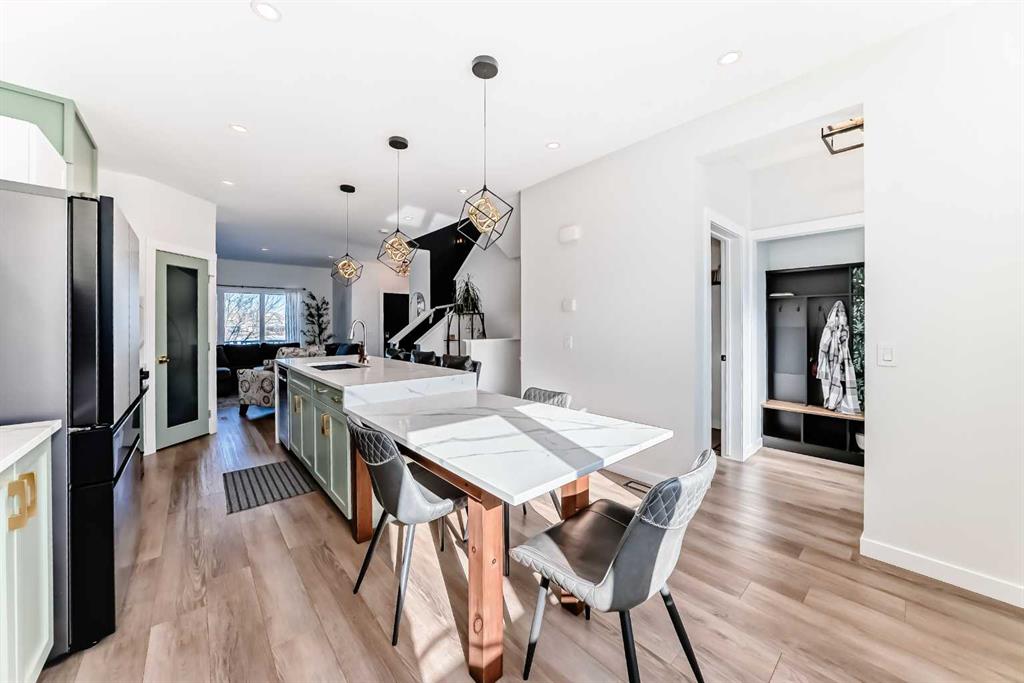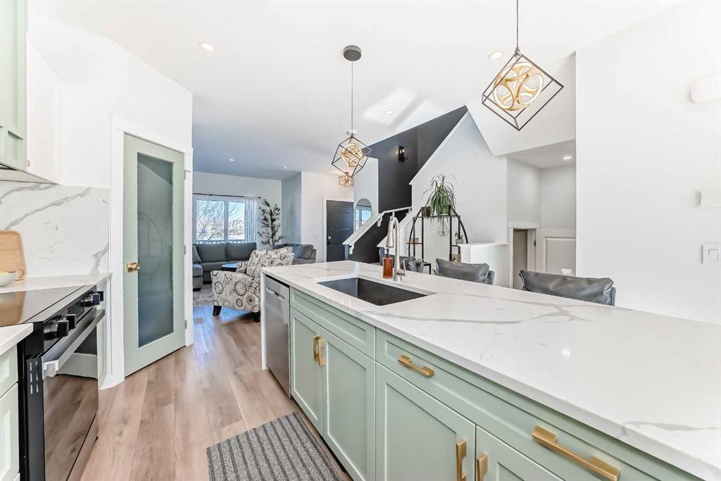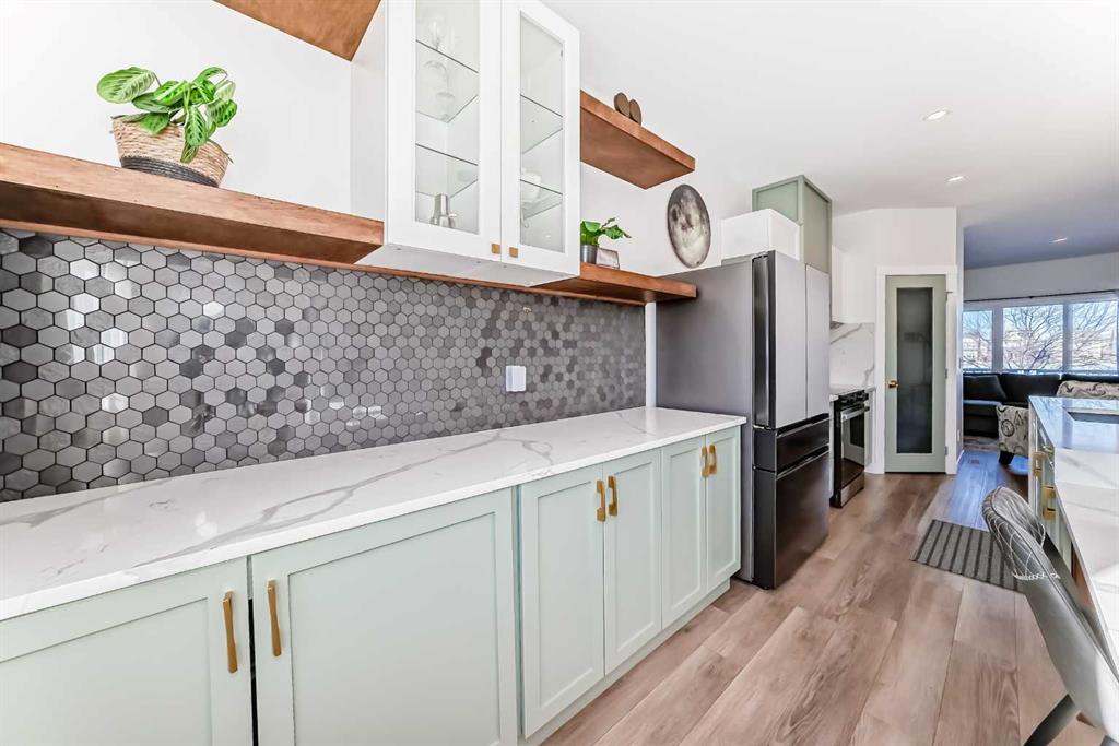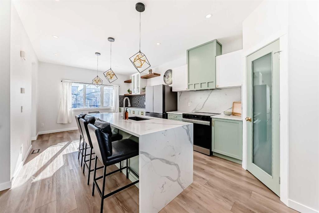Step inside and you’ll immediately notice how bright and inviting the main floor feels, with new windows and doors allowing natural light to pour in. The living area is anchored by a custom feature wall with a contemporary electric fireplace, creating a warm and modern focal point. The fully updated custom kitchen is truly the heart of the home, complete with new appliances, updated lighting, luxury vinyl flooring and an oversized waterfall quartz island with matching table. Perfectly designed for everyday living and effortless entertaining.
