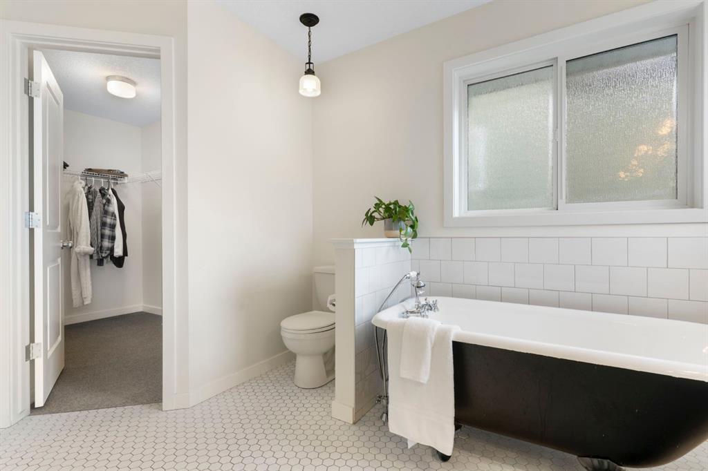 Upstairs, you’re welcomed by a bright family-oriented bonus area flooded with natural light complete with built-in seating, along with two generously sized bedrooms and a four-piece bathroom. The primary retreat is a true sanctuary, featuring a spa-inspired ensuite with an elegant claw-foot soaker tub, dual vanity, and a glass-enclosed shower accented with subway tile. A walk-through closet connects seamlessly to the upper-level laundry room for ultimate convenience.