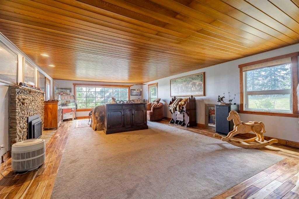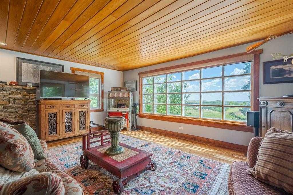 The living room exudes warmth and character, with wood ceilings and a cozy fireplace creating an inviting focal point, all while showcasing panoramic countryside views. The main floor includes four generously sized bedrooms, including a luxurious primary suite complete with a spa-inspired ensuite featuring a steam shower—your own private retreat.